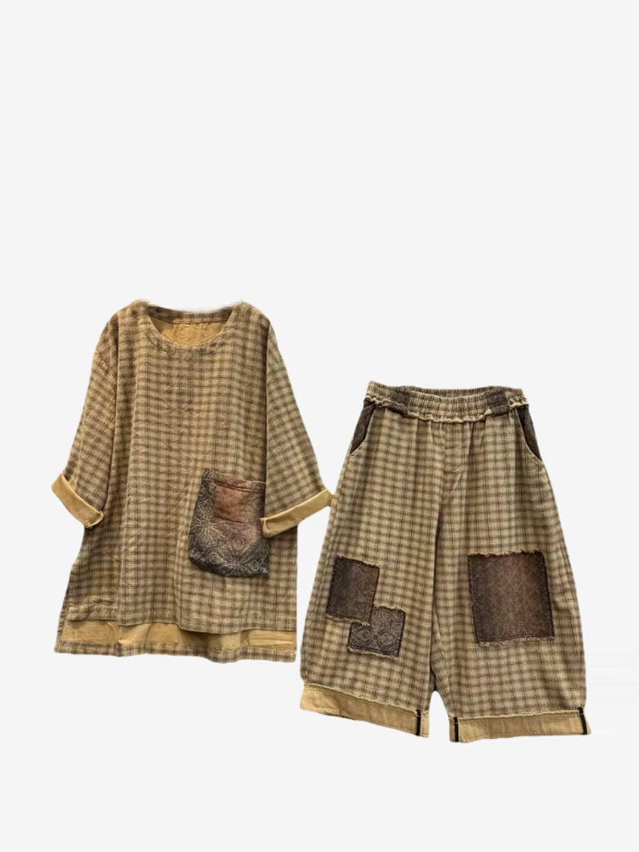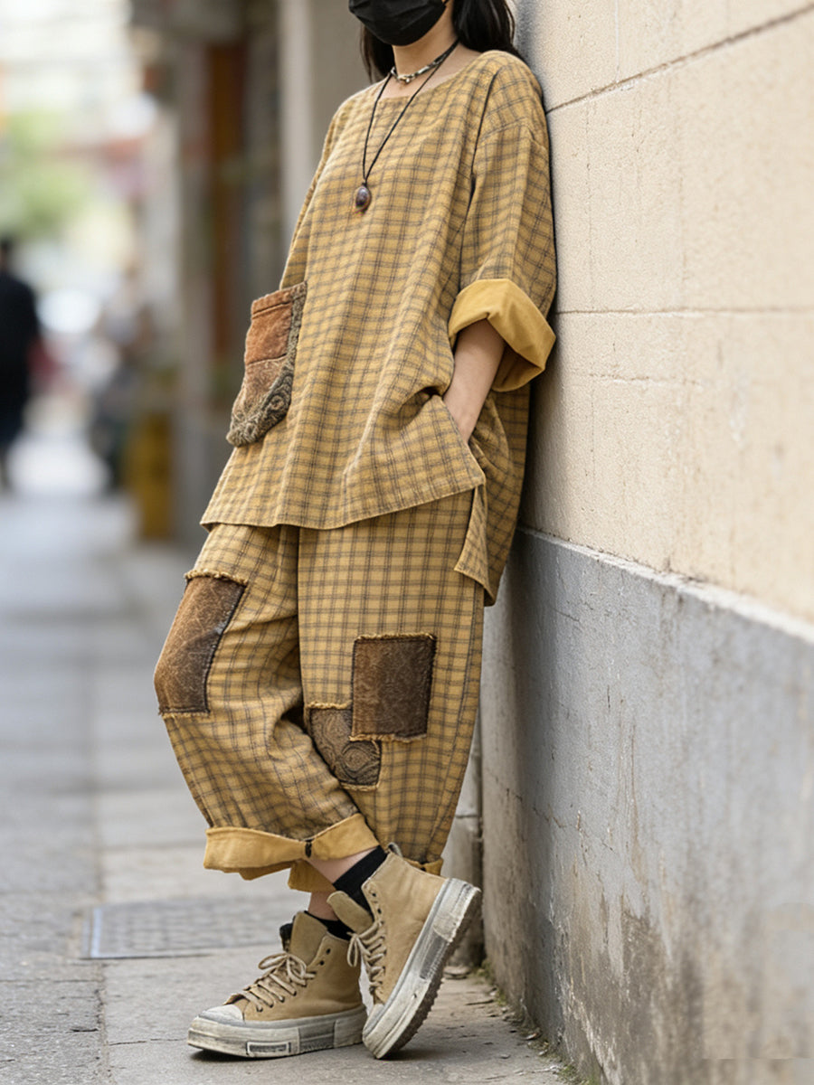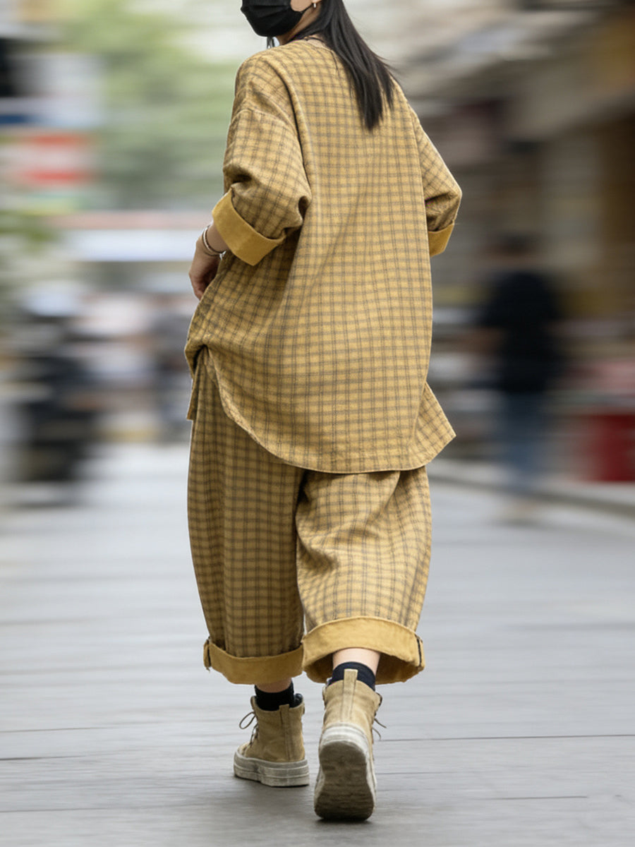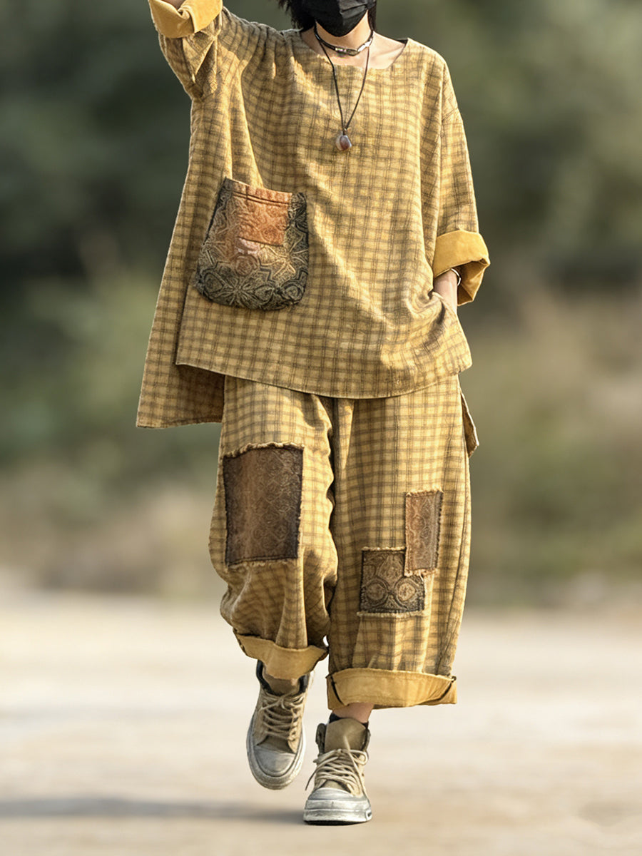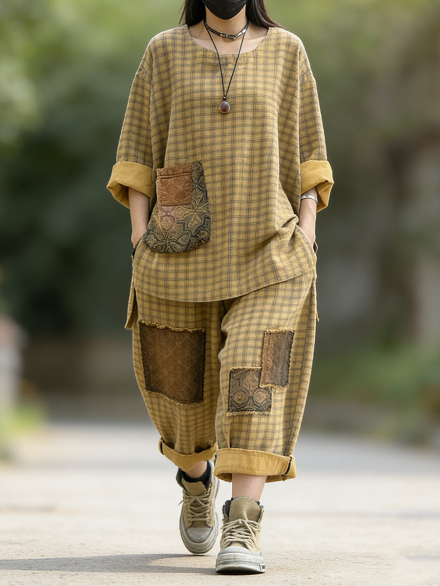 Women Spring Retro Plaid Patchwork Suits