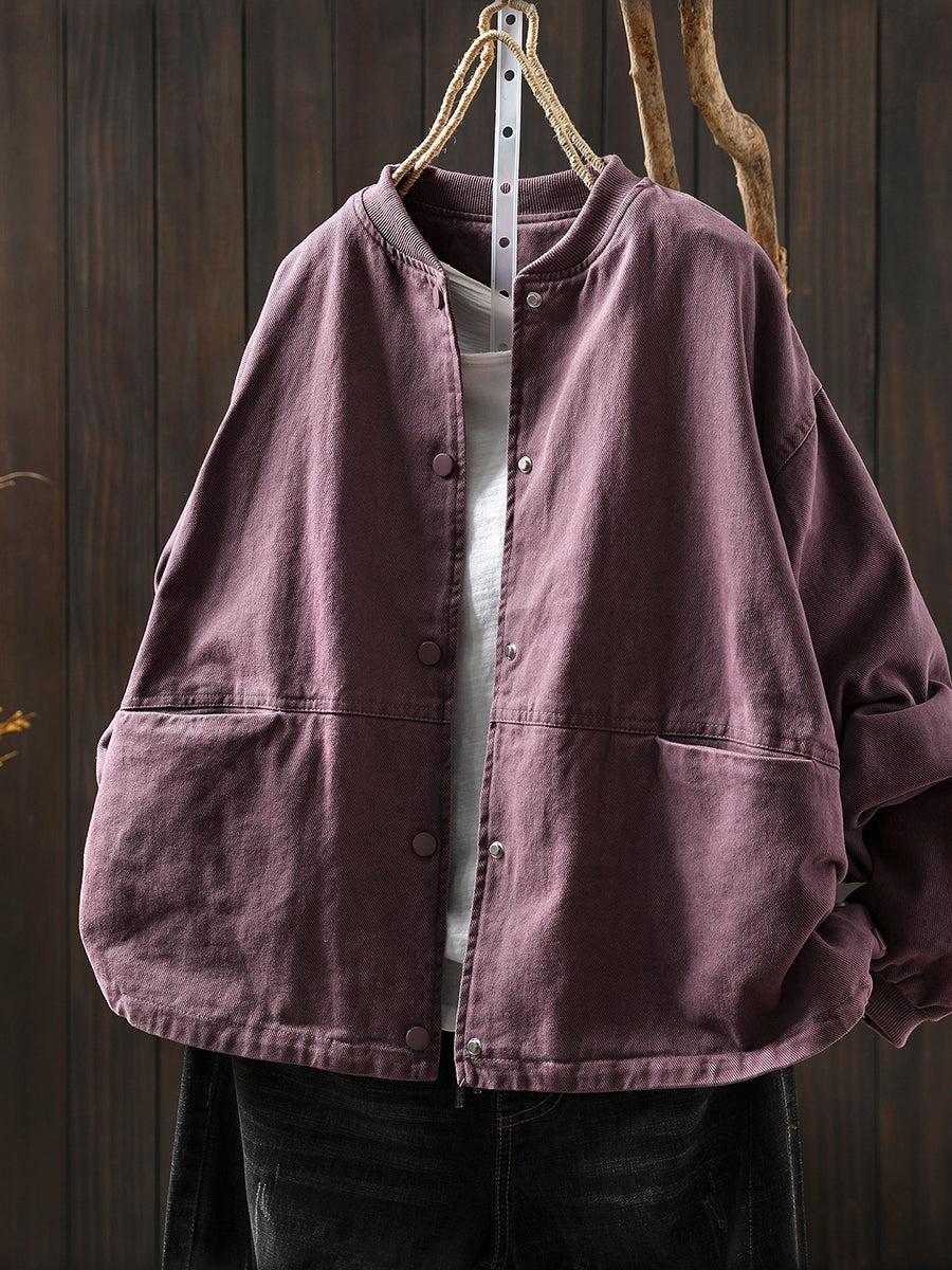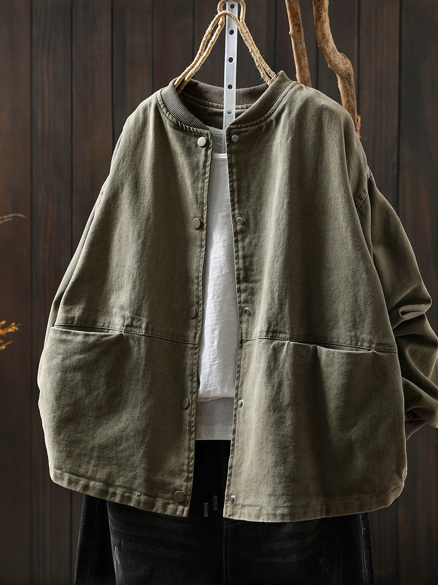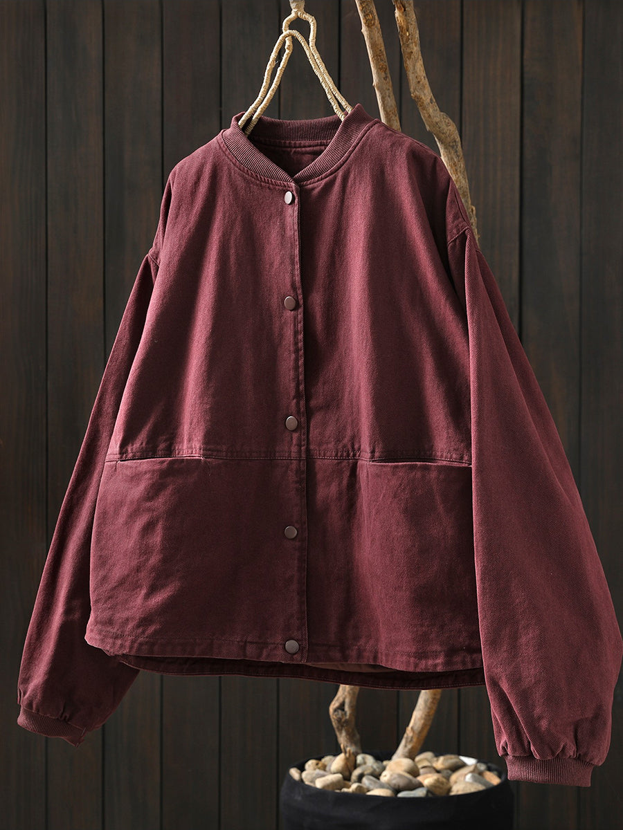 Women Spring Retro Pure Color Stand Collar Jacket