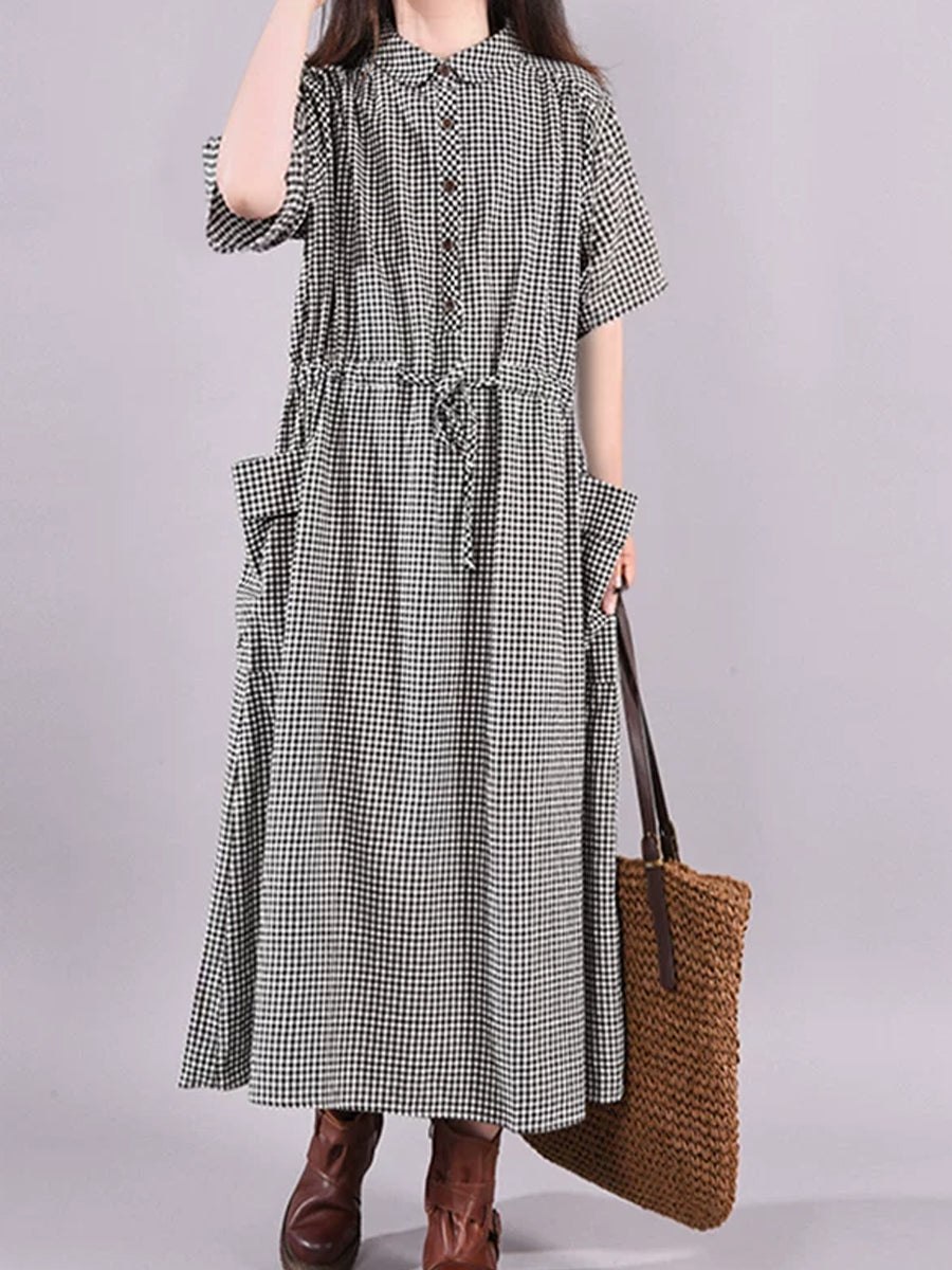 Women Summer Artsy Plaid Turn-down Collar Dress