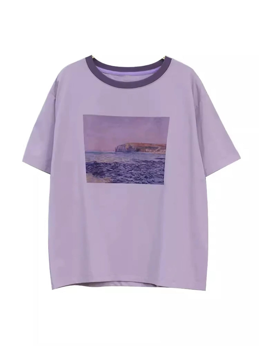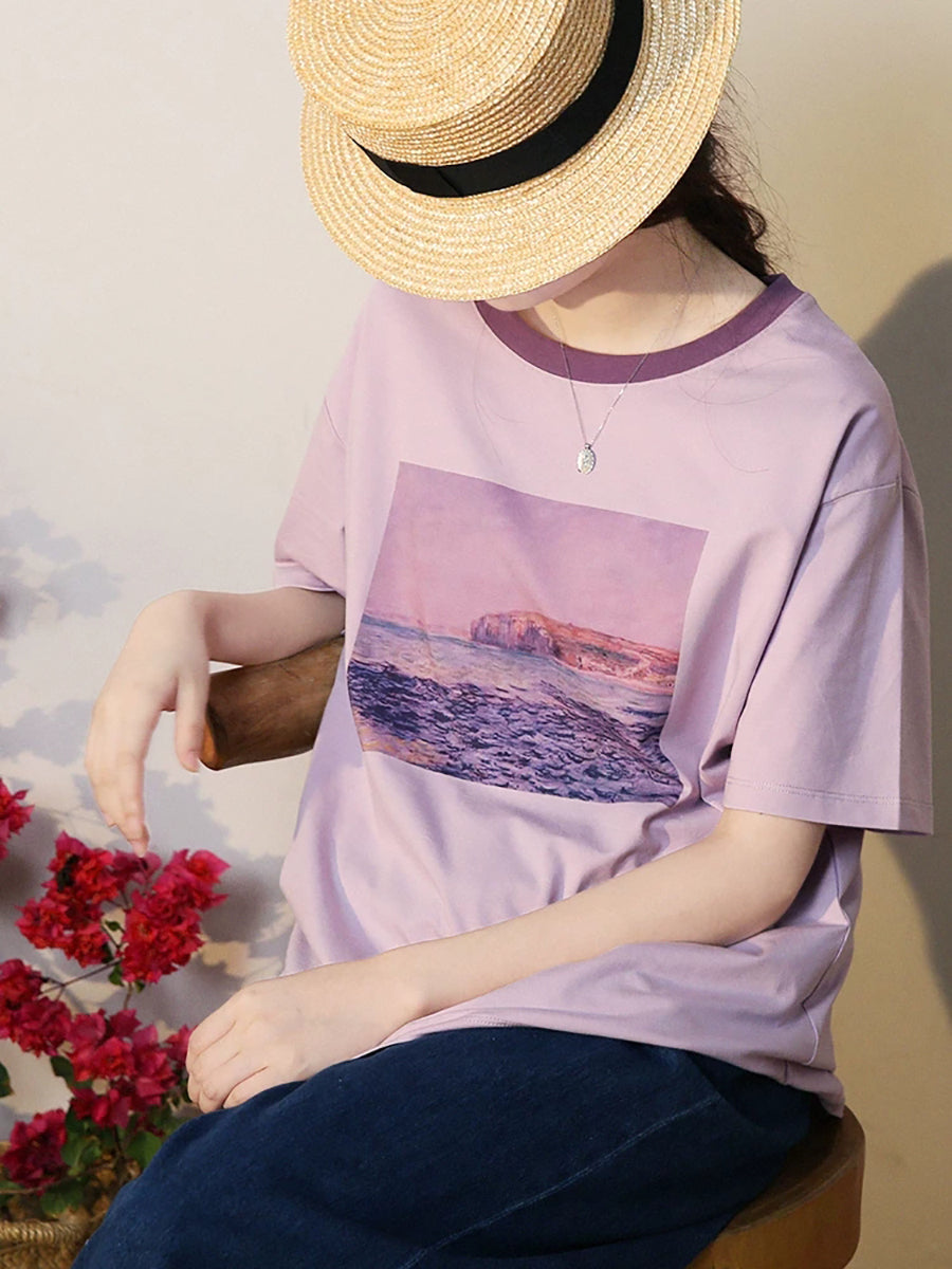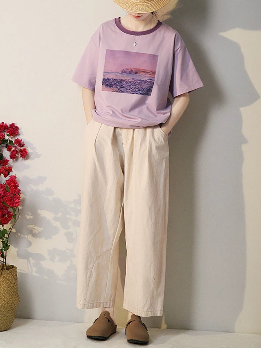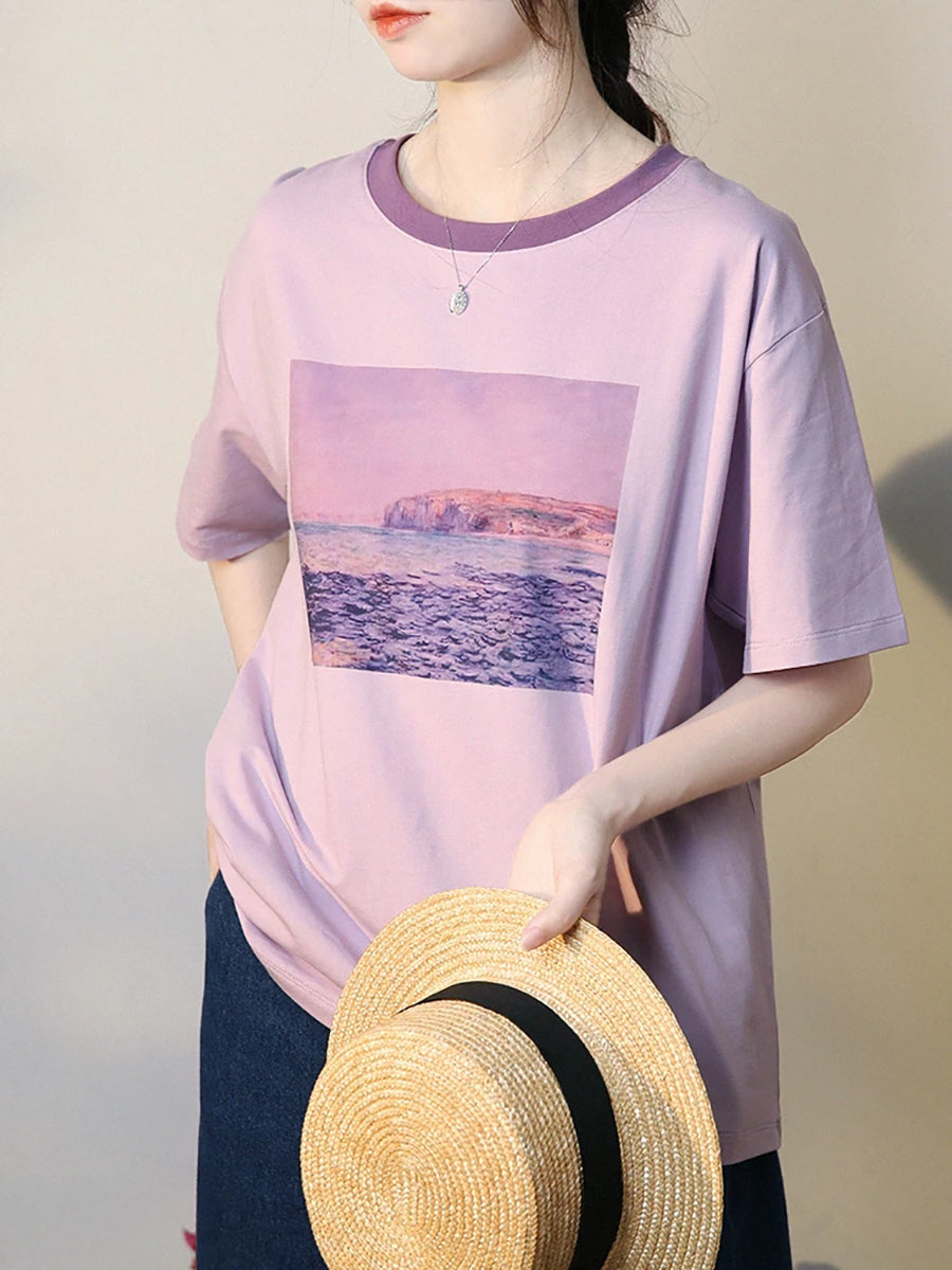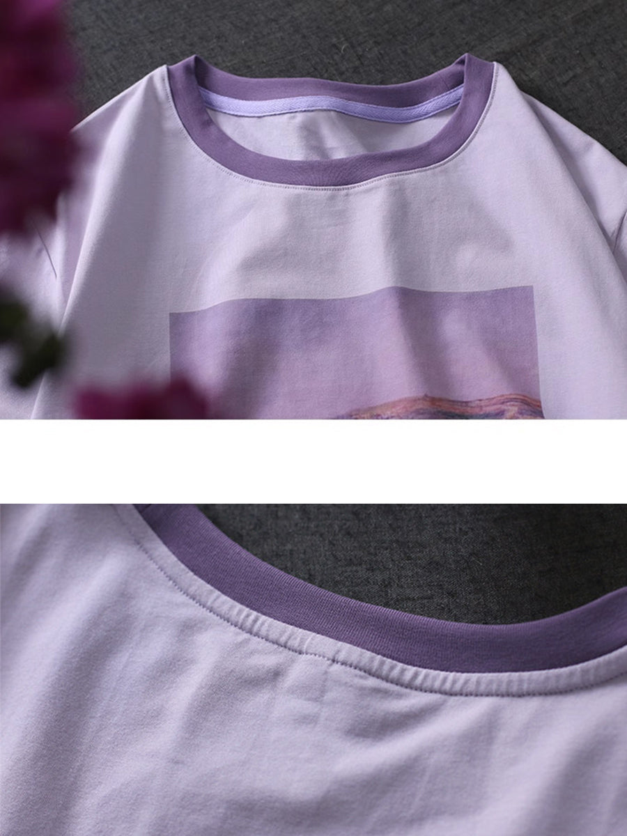 Women Summer Artsy Drawing O-Neck Cotton Blouse