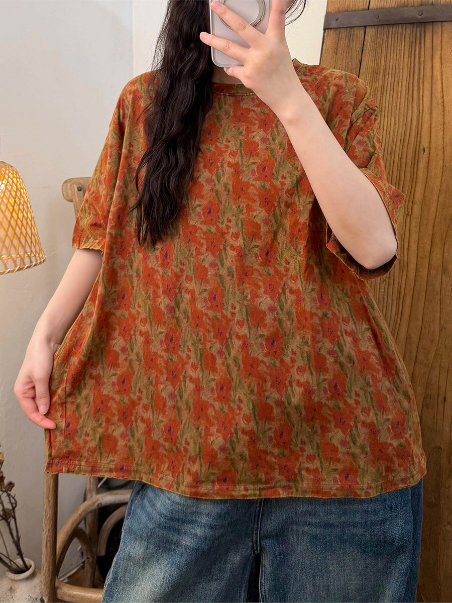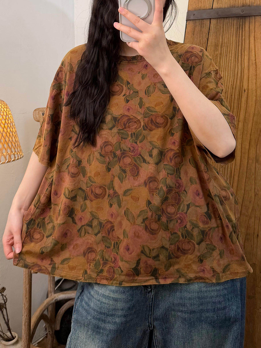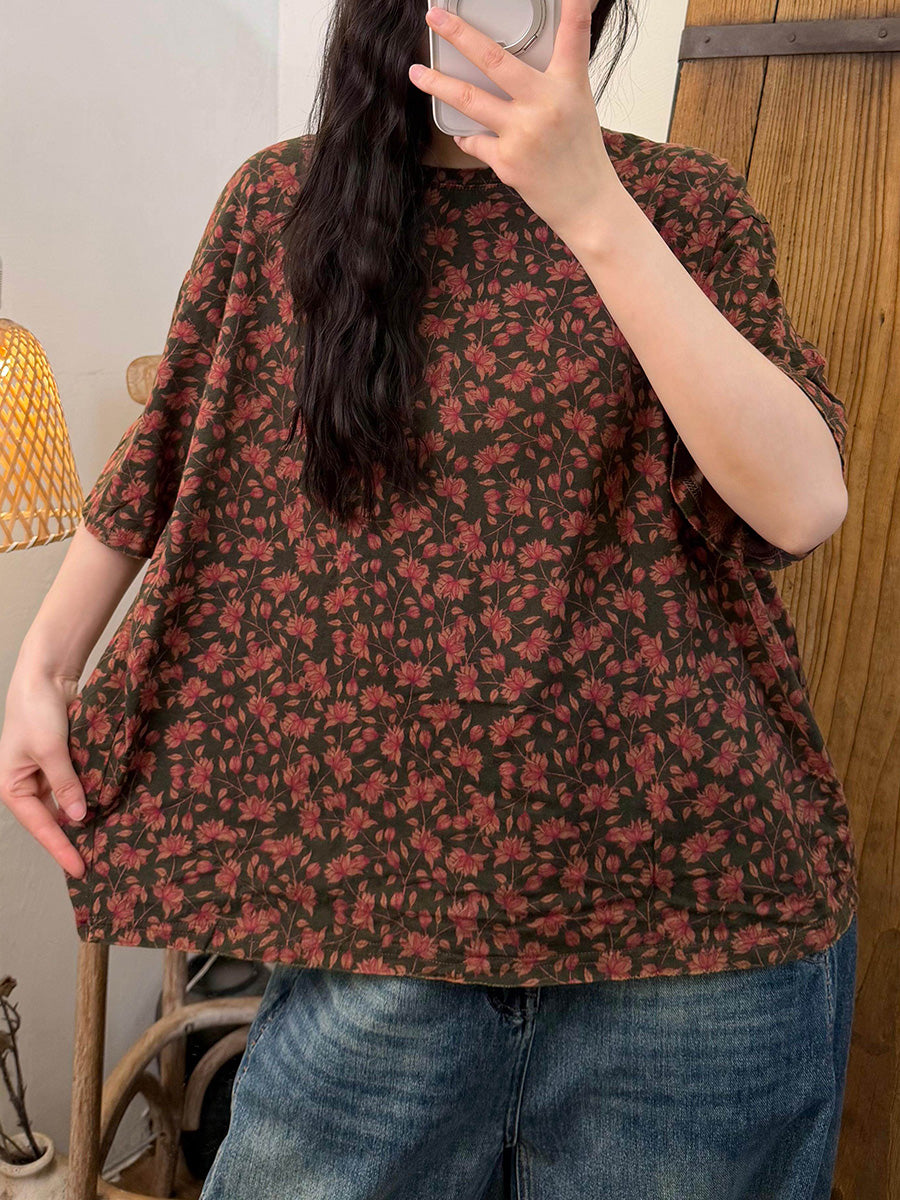 Women Summer Casual Flower O-Neck T-Shirt