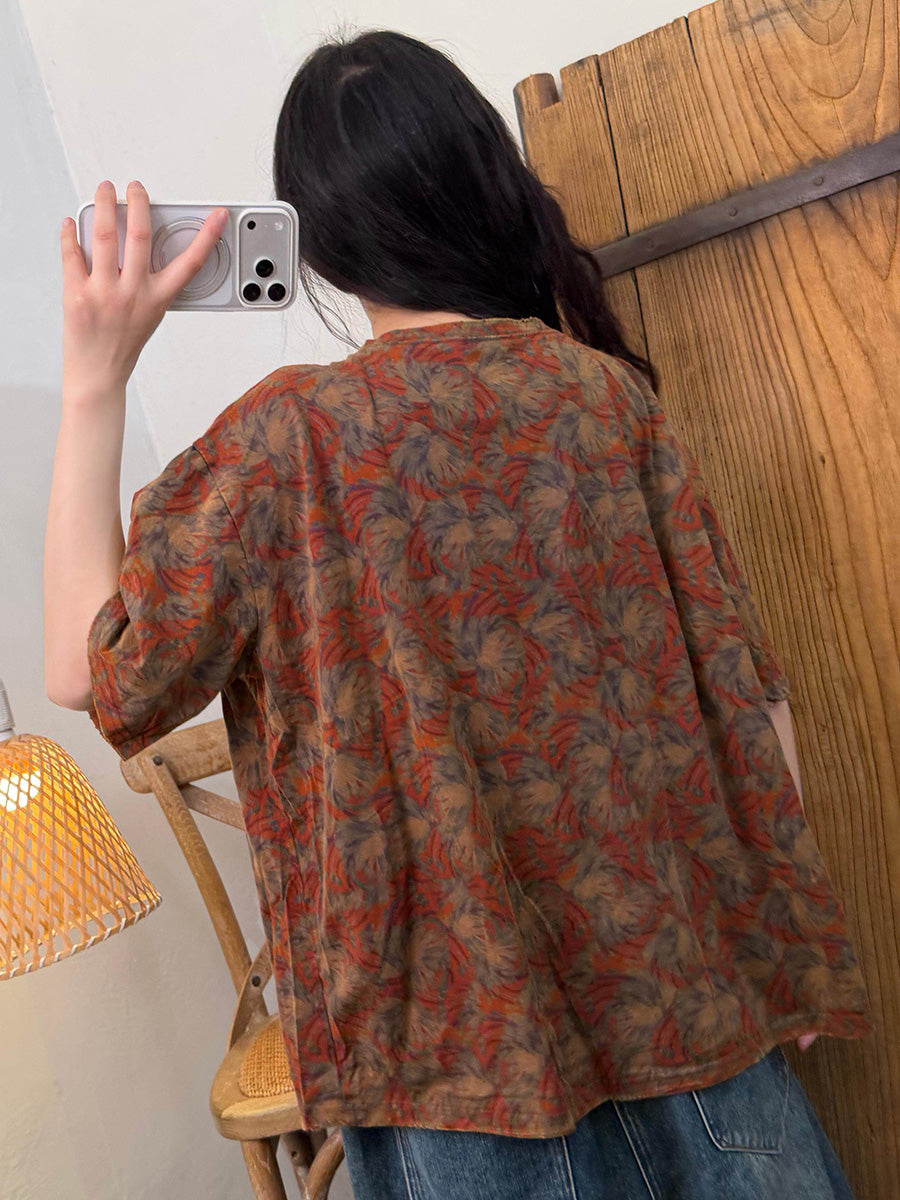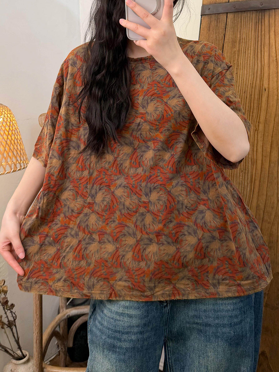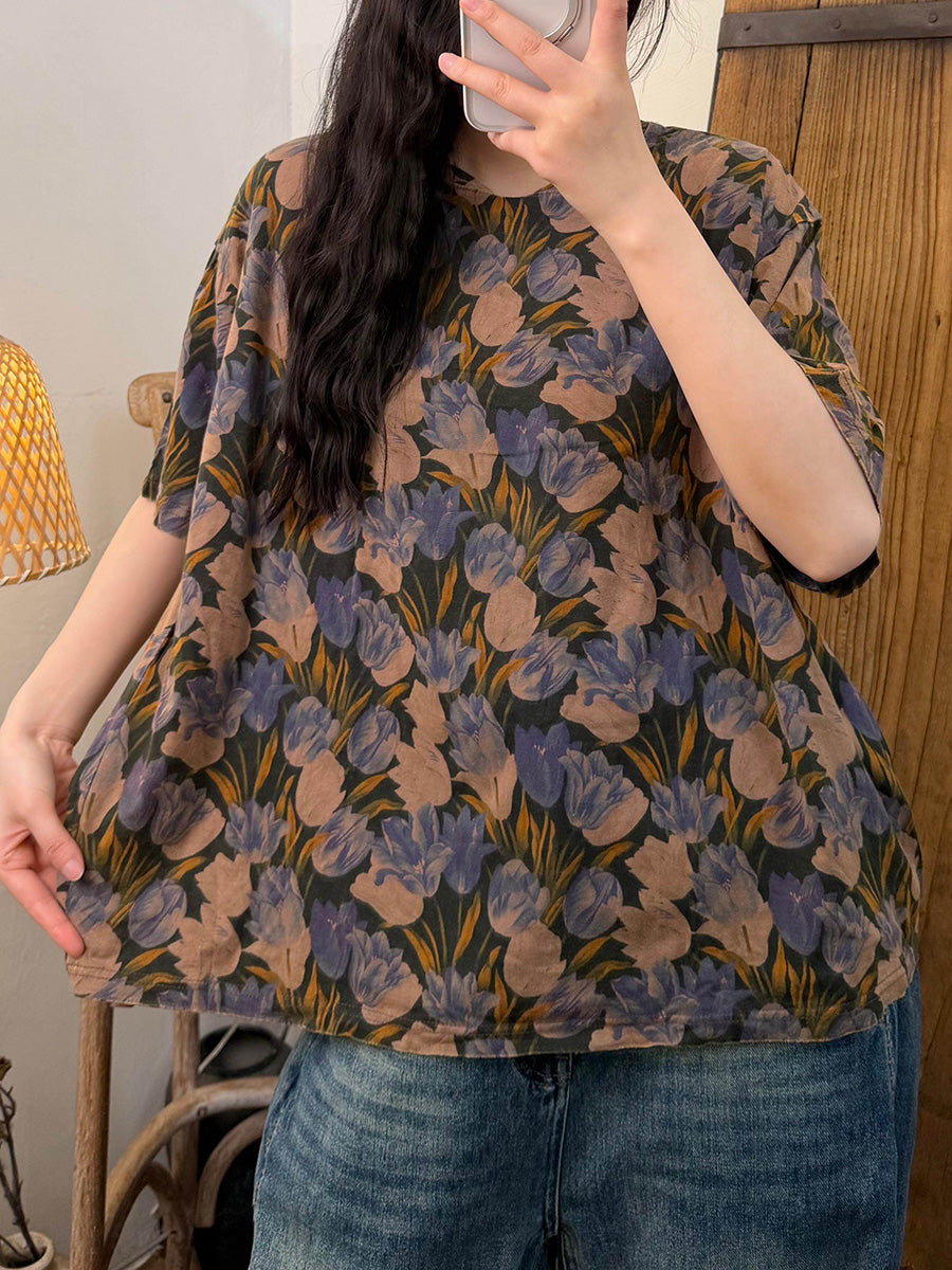 Women Summer Casual Flower O-Neck T-Shirt