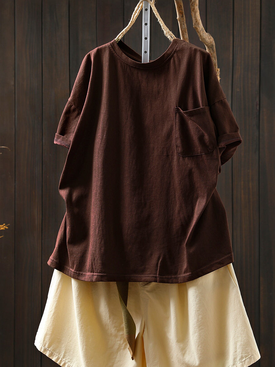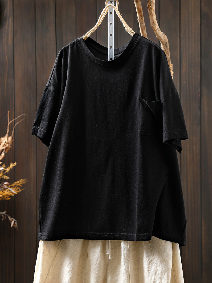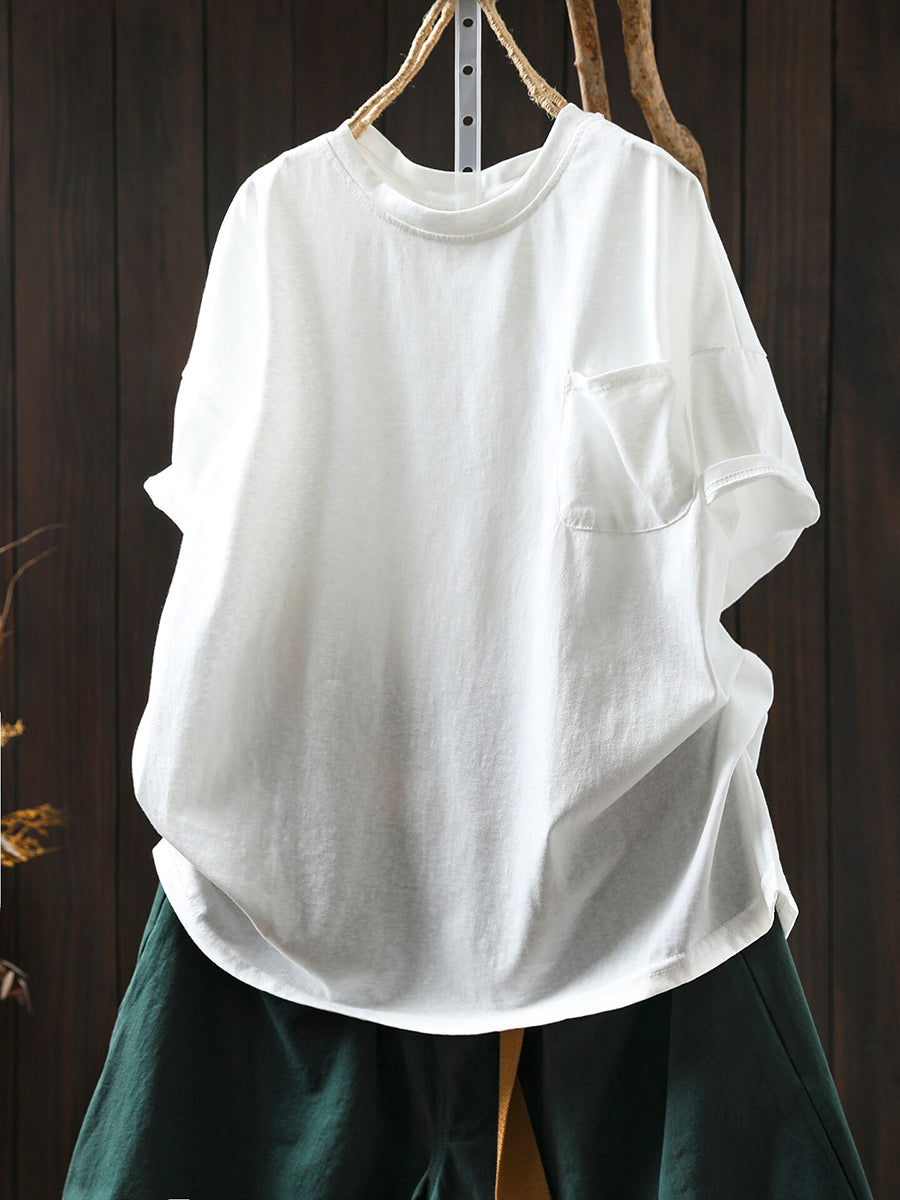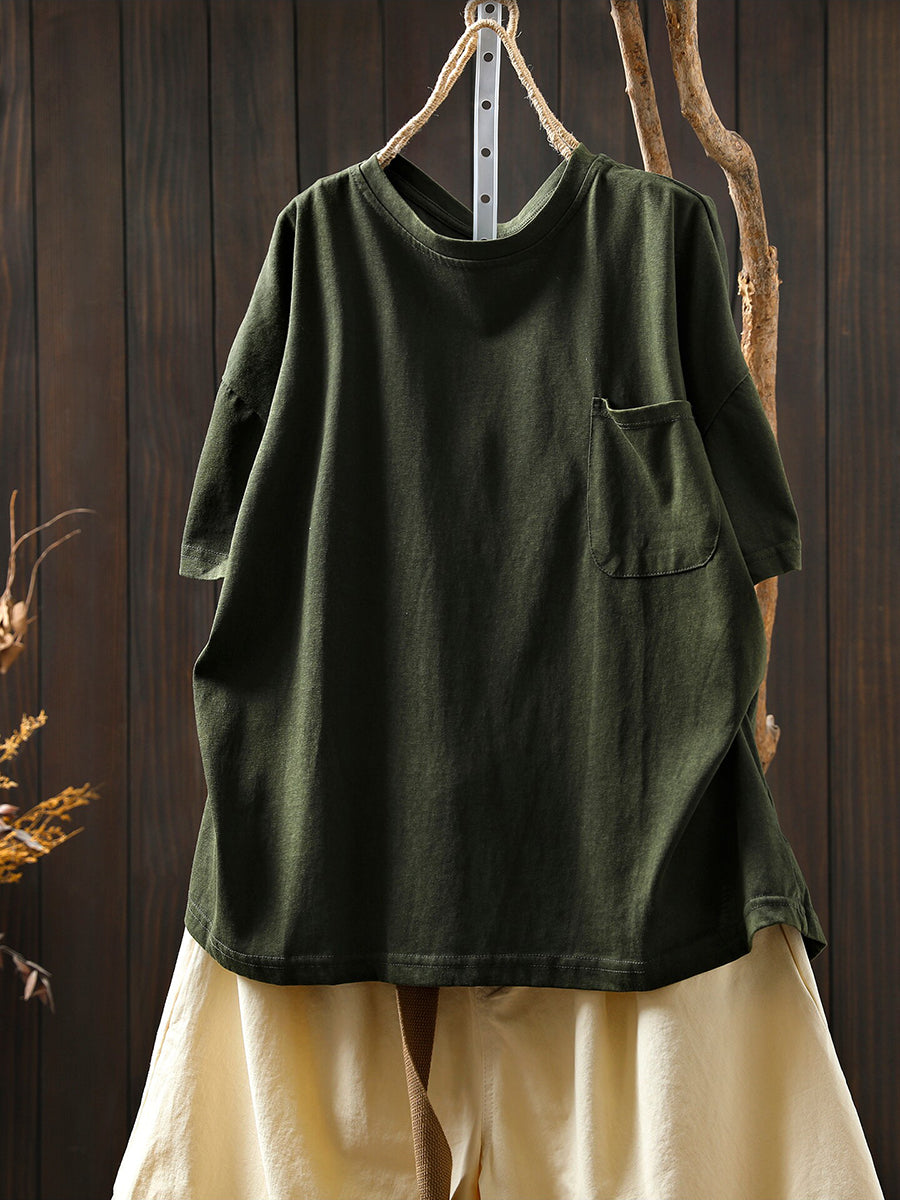 Women Summer Casual Pure Color O-Neck 100%Cotton Shirt