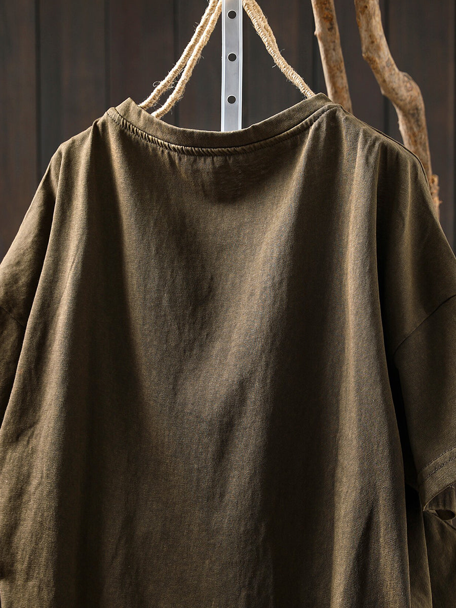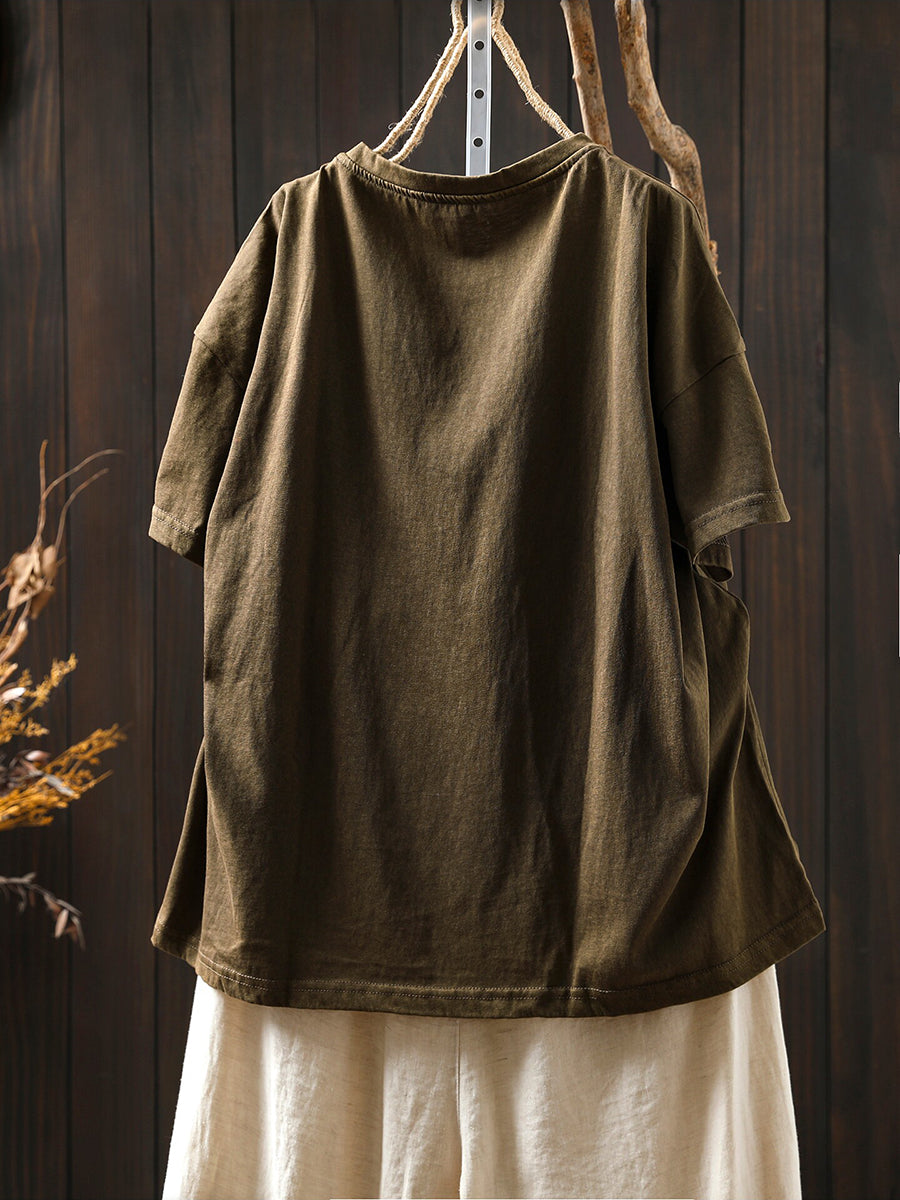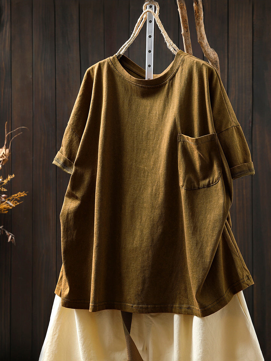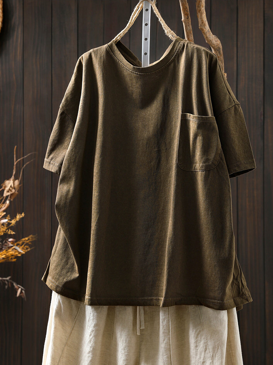 Women Summer Casual Pure Color O-Neck 100%Cotton Shirt