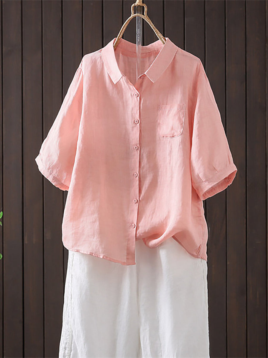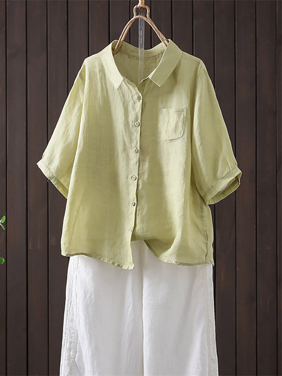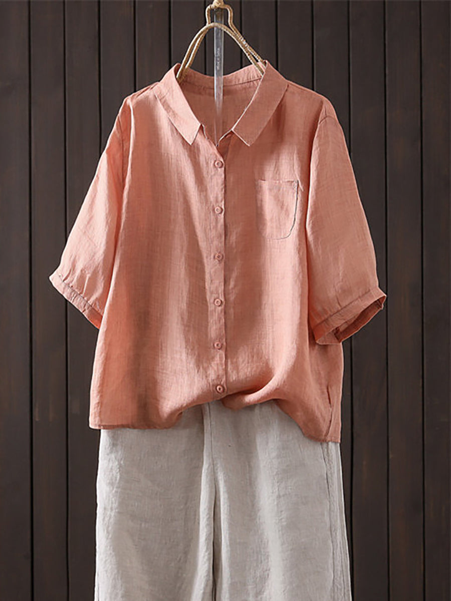 Women Summer Casual Pure Color Ramie Turn-down Collar Shirt