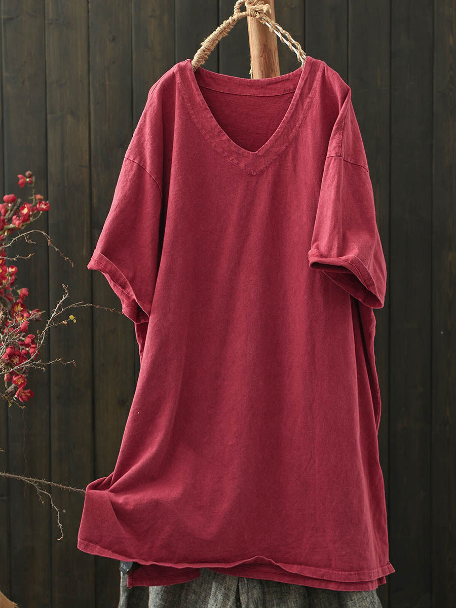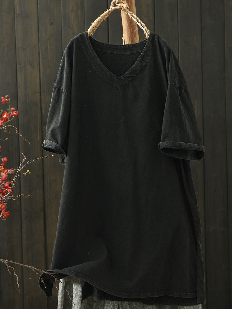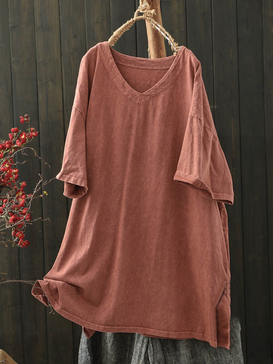 Women Summer Casual Pure Color V-Neck Cotton Shirt