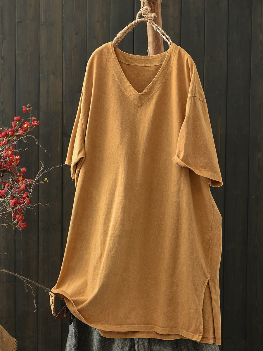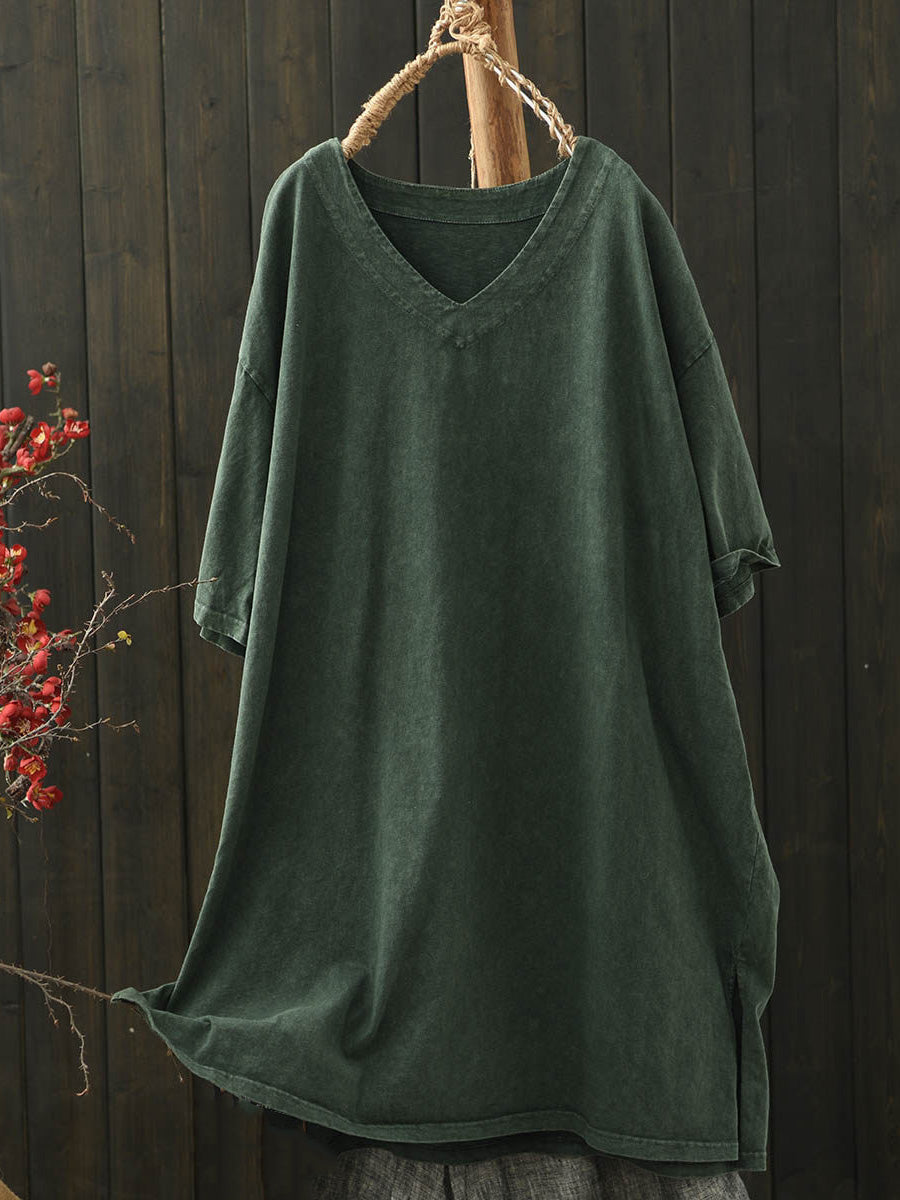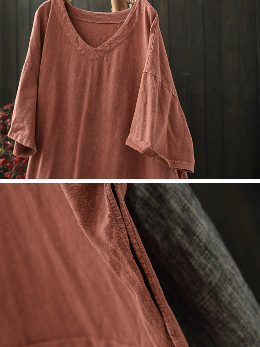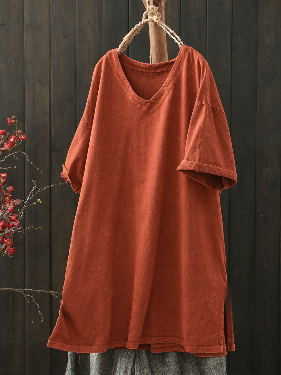 Women Summer Casual Pure Color V-Neck Cotton Shirt