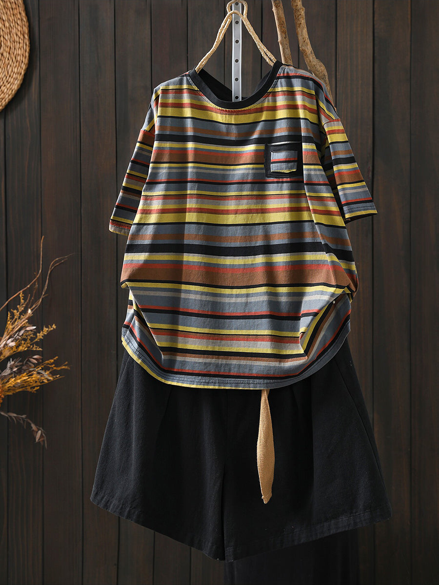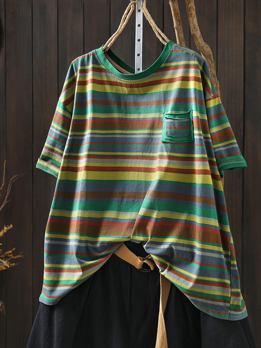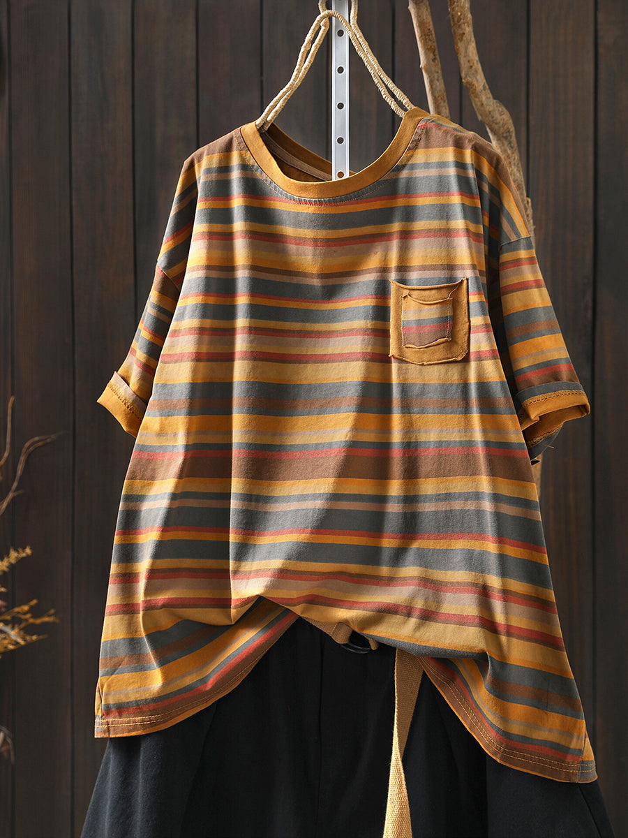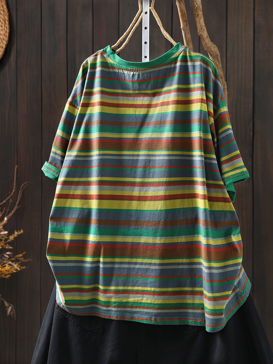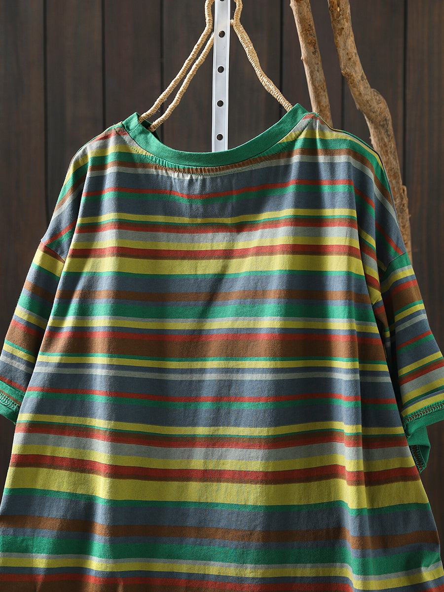 Women Summer Casual Stripe Cotton O-Neck Shirt