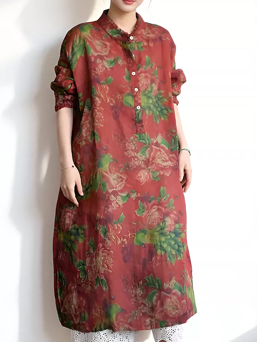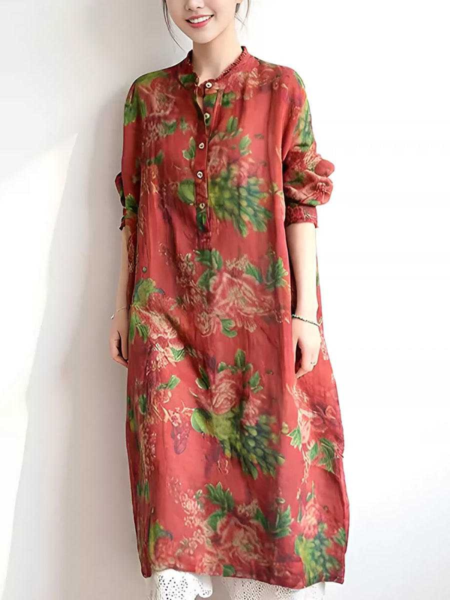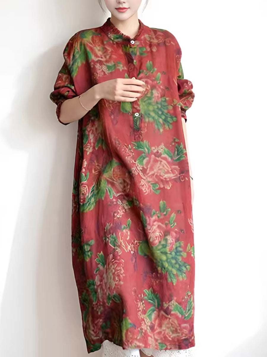 Crafted from ramie, this dress features a stand collar and a floral pattern. It includes regular full-length sleeves and extends to the ankle, making it ideal for both autumn and spring wear.