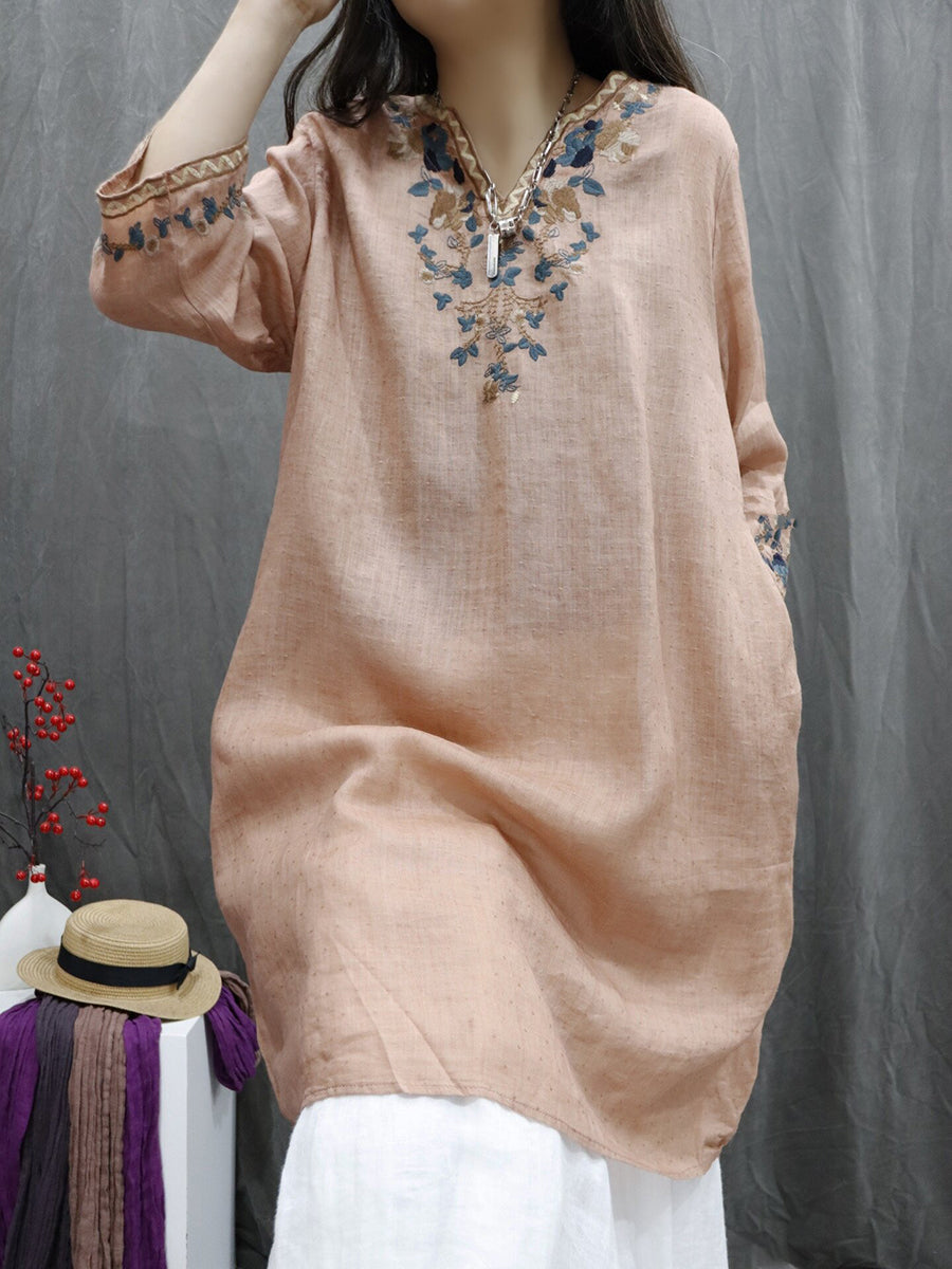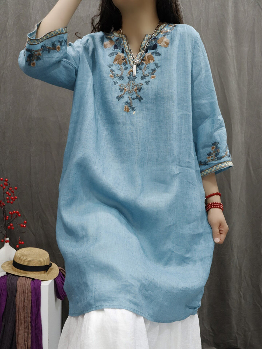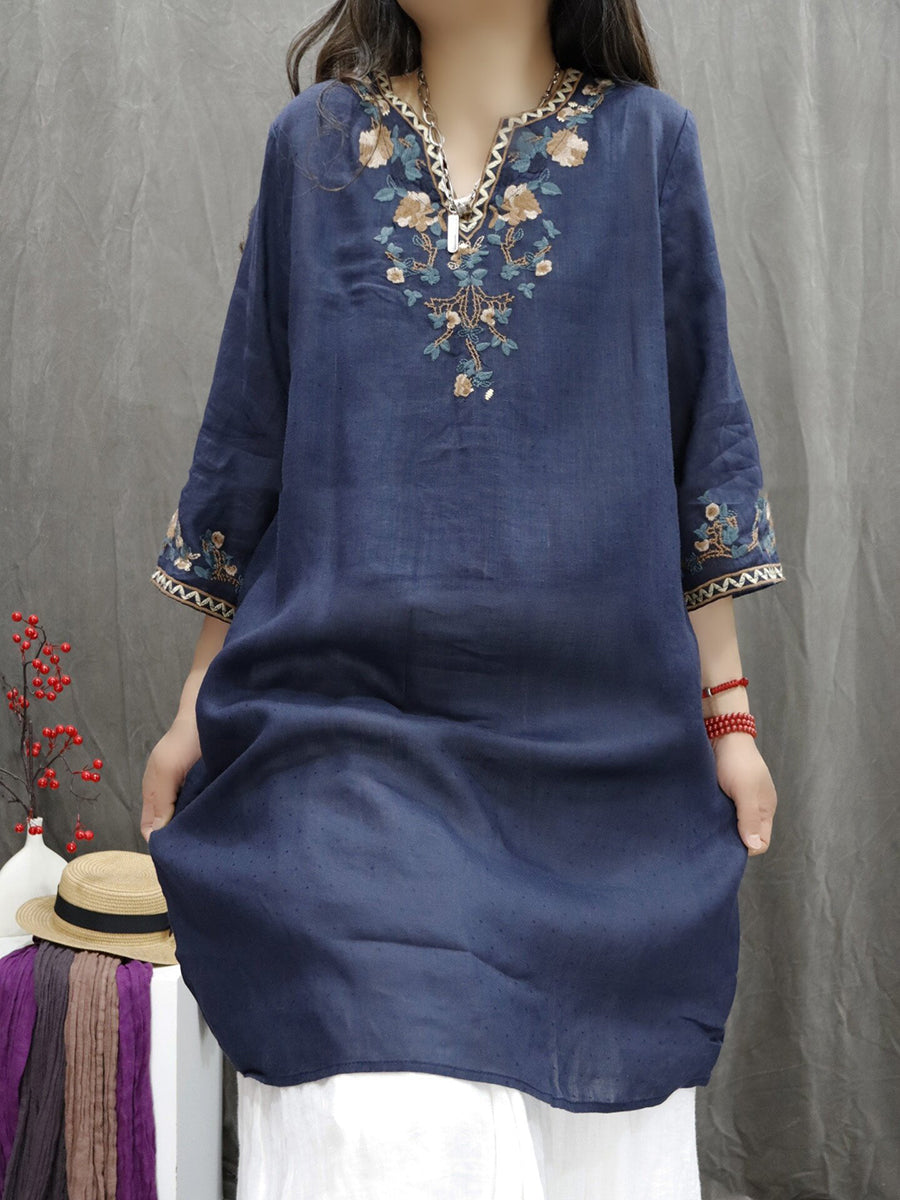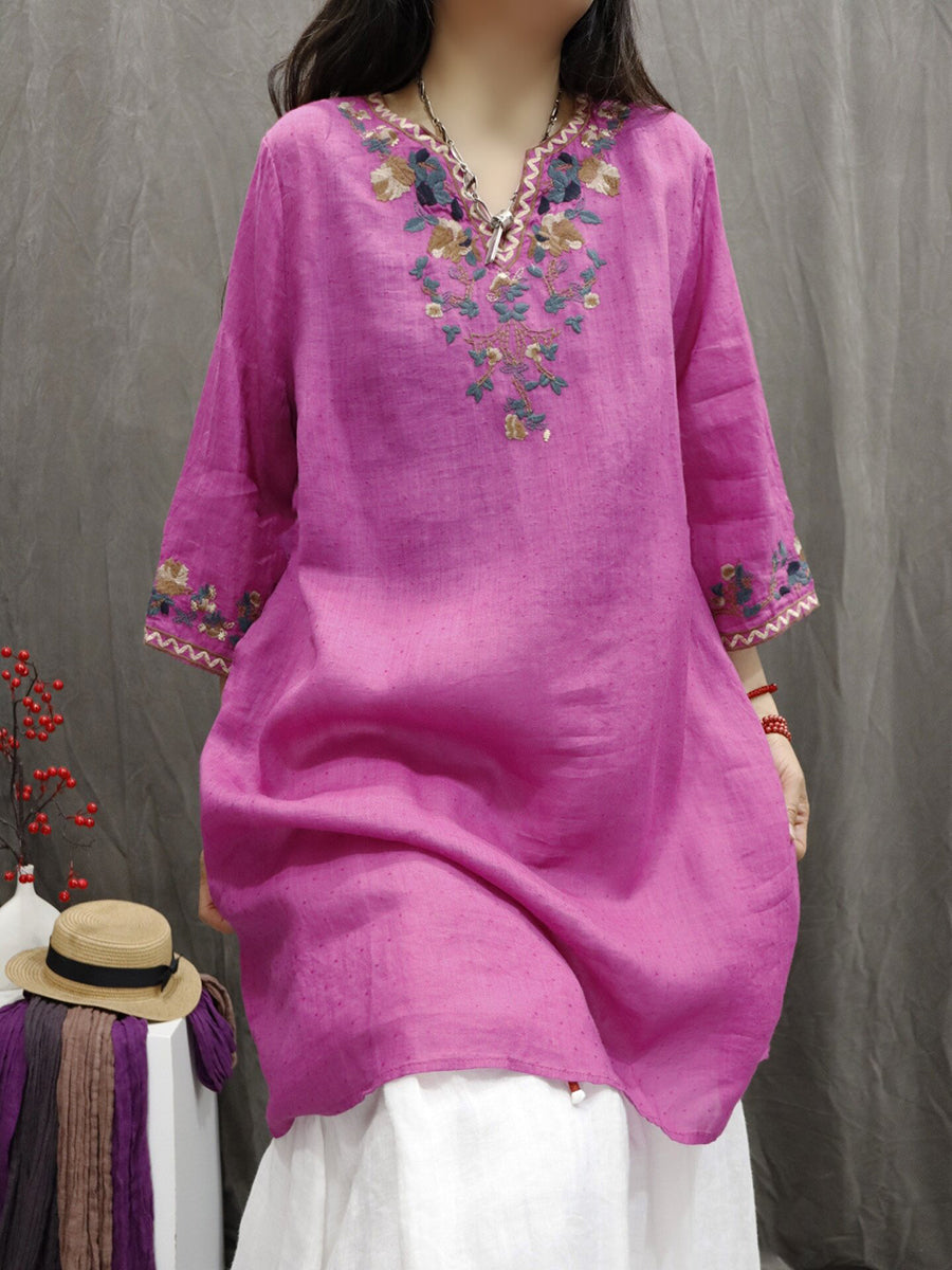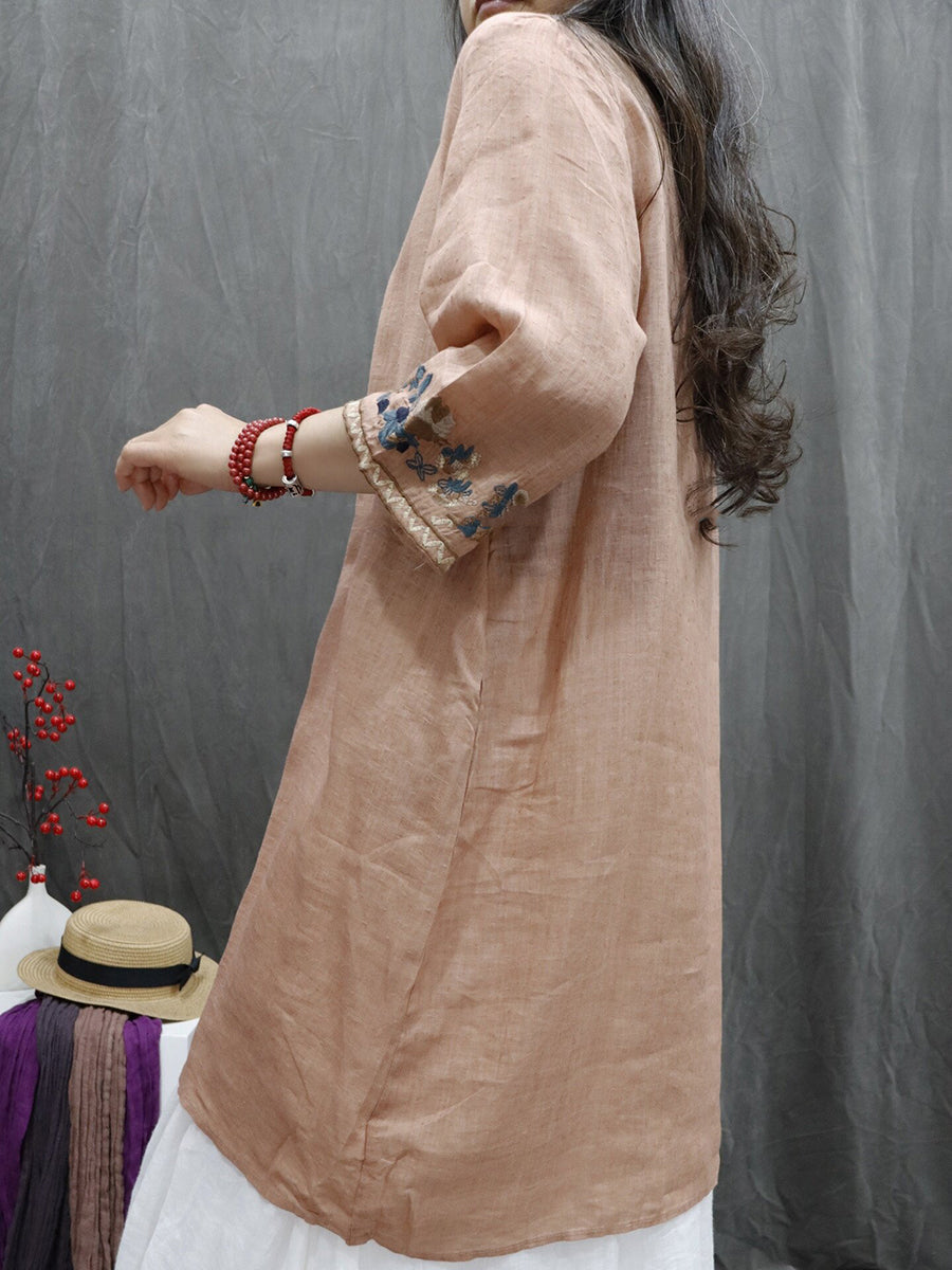 Women Summer Flower Embroidery V-Neck 100%Ramie Blouse