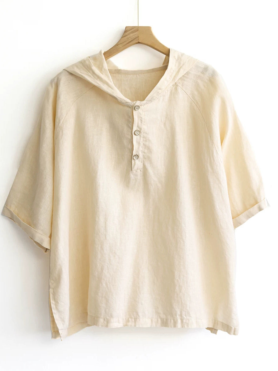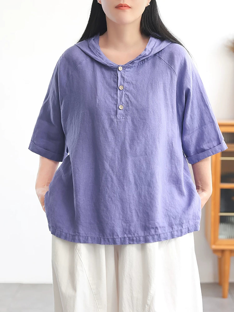 Women Summer Pure Color 100%Linen Hoodie