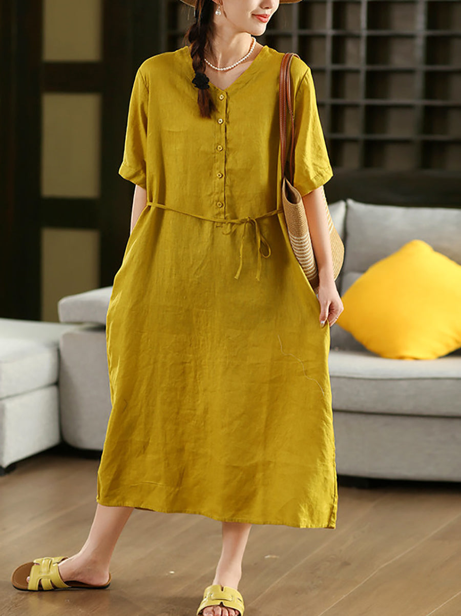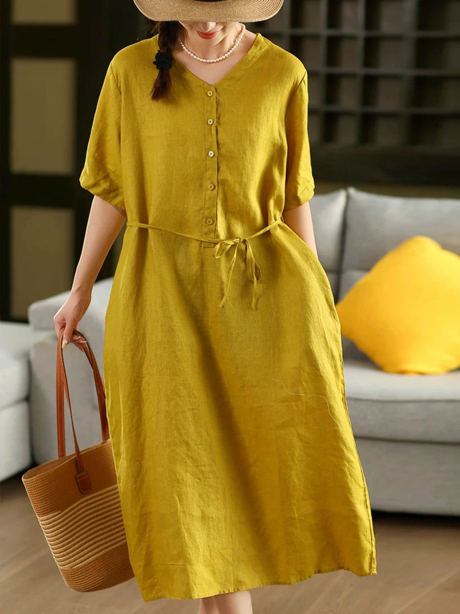 Women Summer Pure Color V-Neck 100%Linen Dress