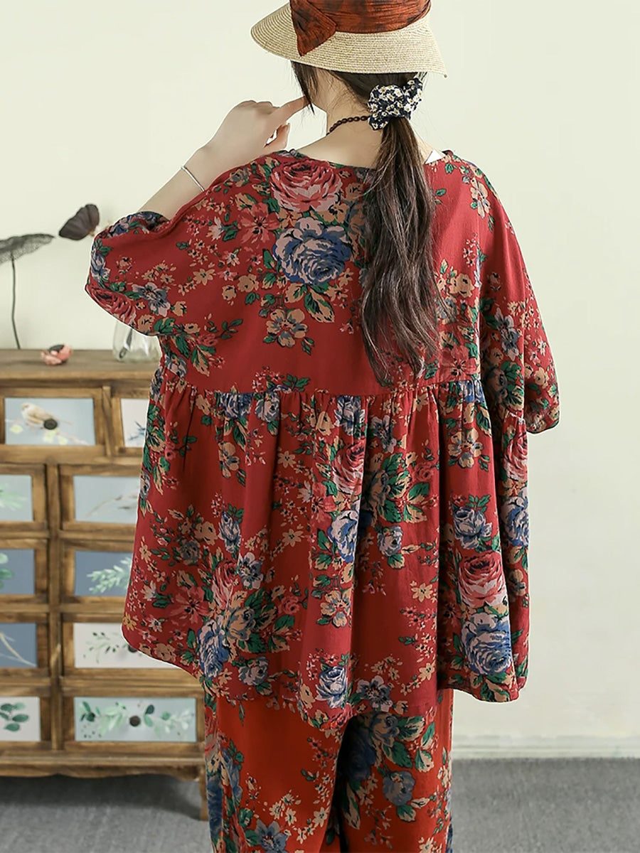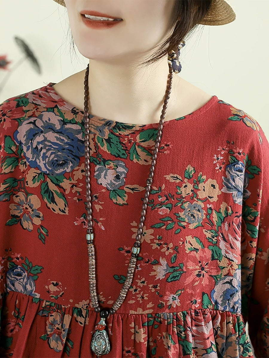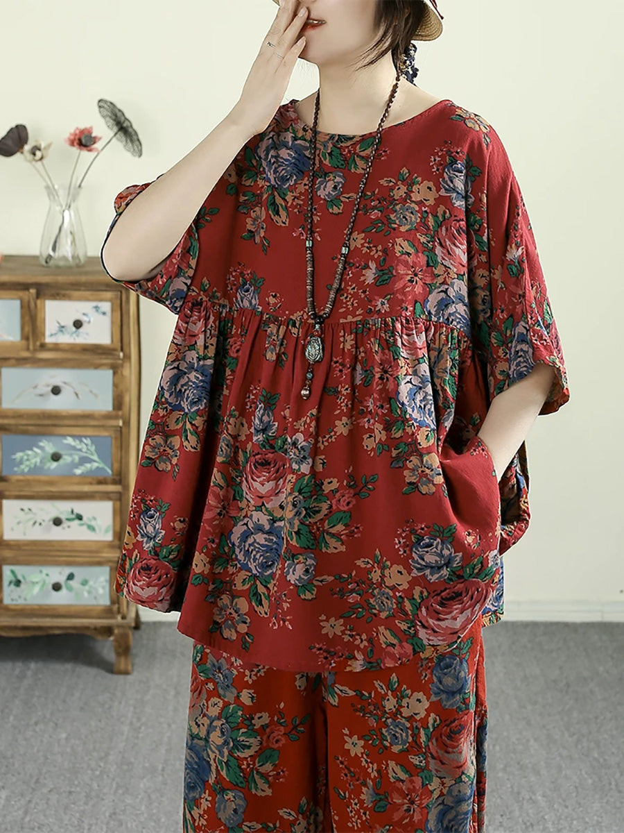 Women Summer Retro Flower 100%Cotton O-Neck Blouse