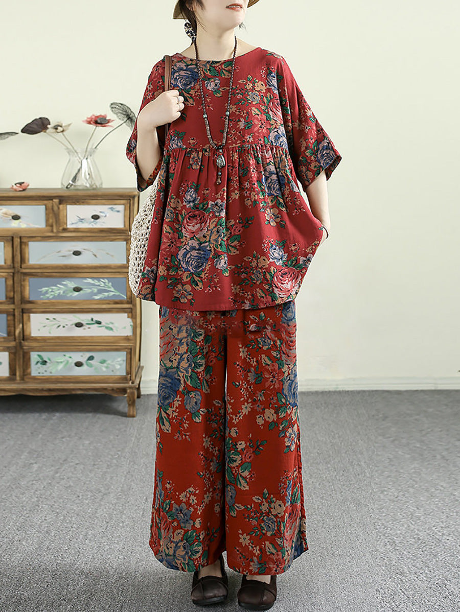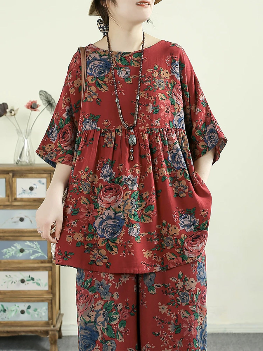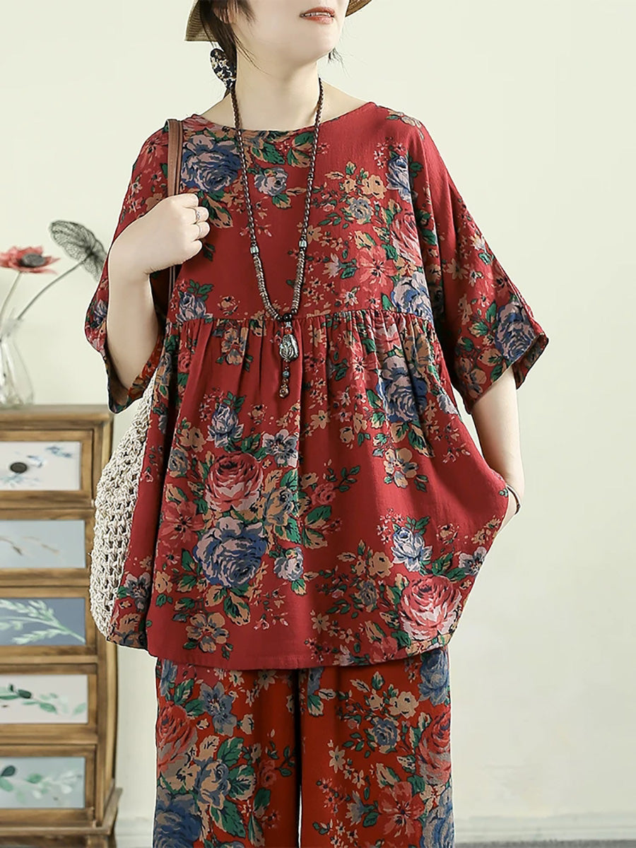 Women Summer Retro Flower 100%Cotton O-Neck Blouse
