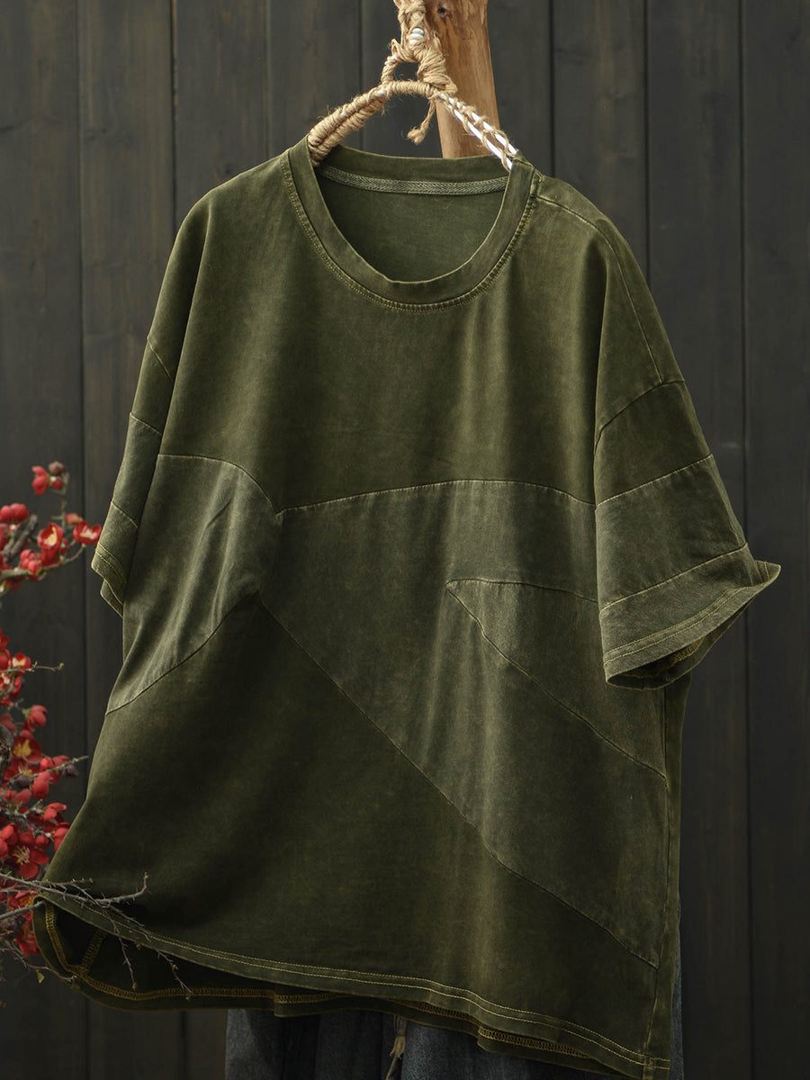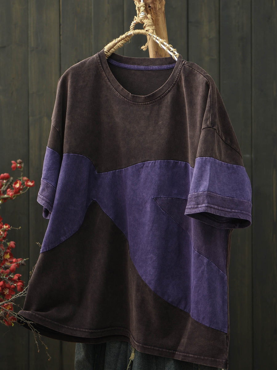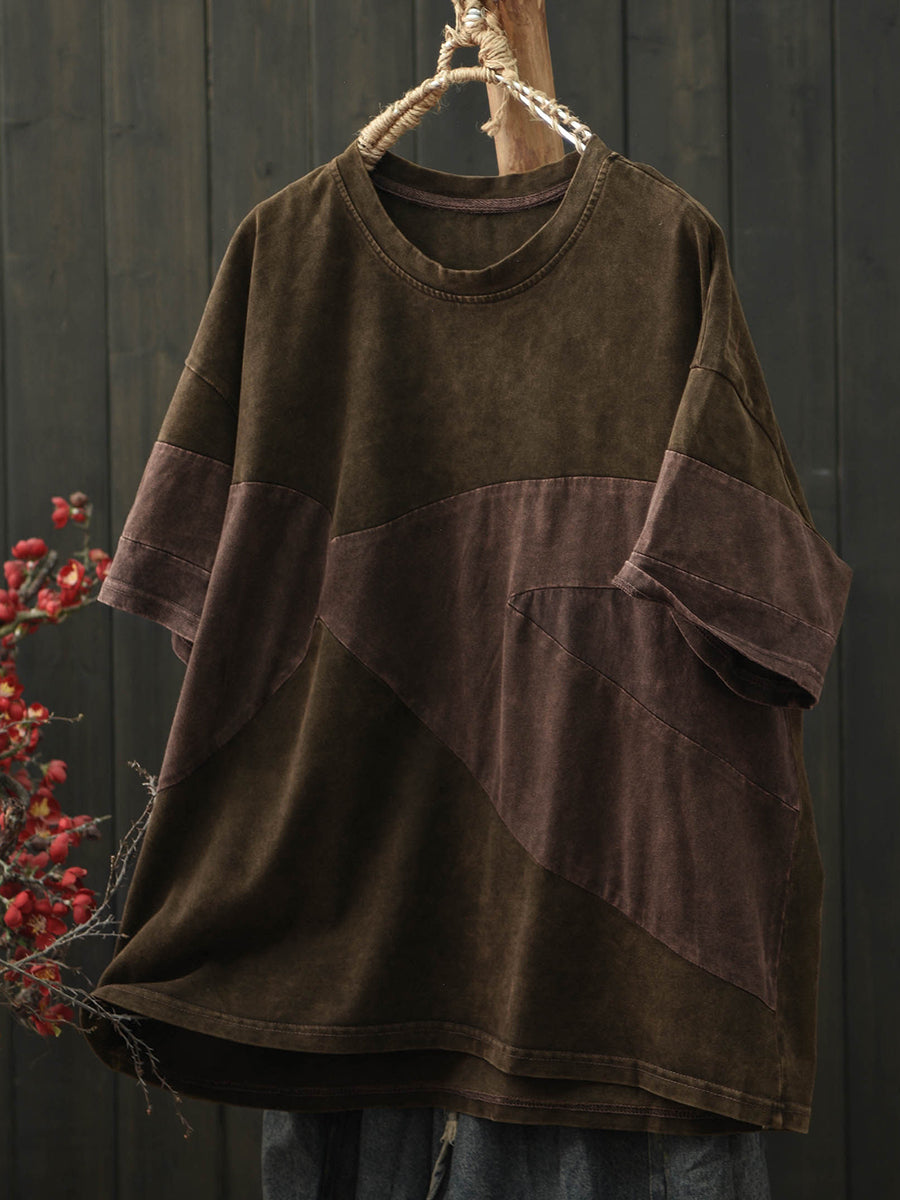 Women Summer Retro Patchwork O-Neck Cotton T-Shirt