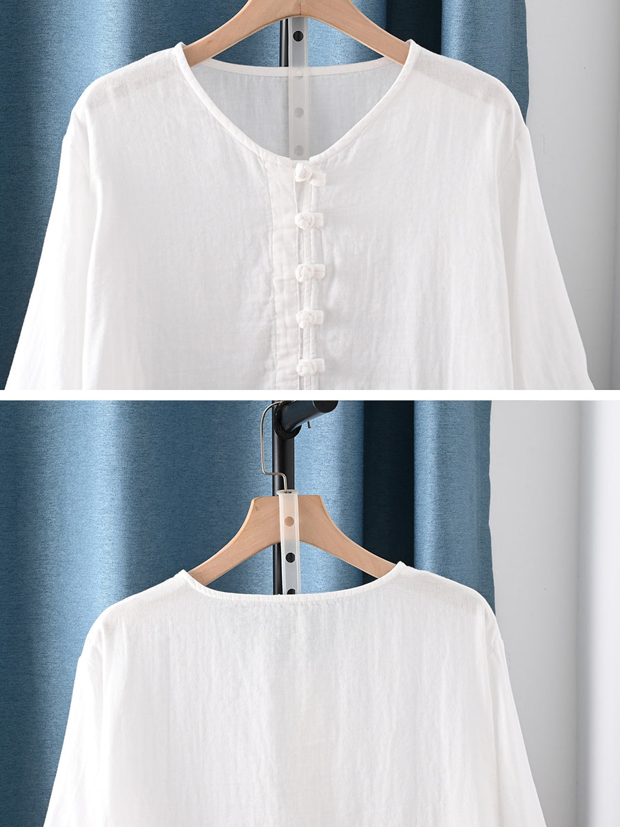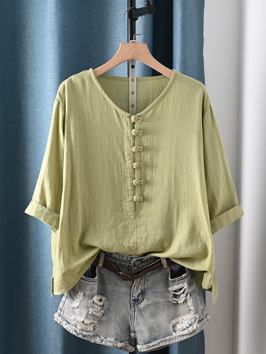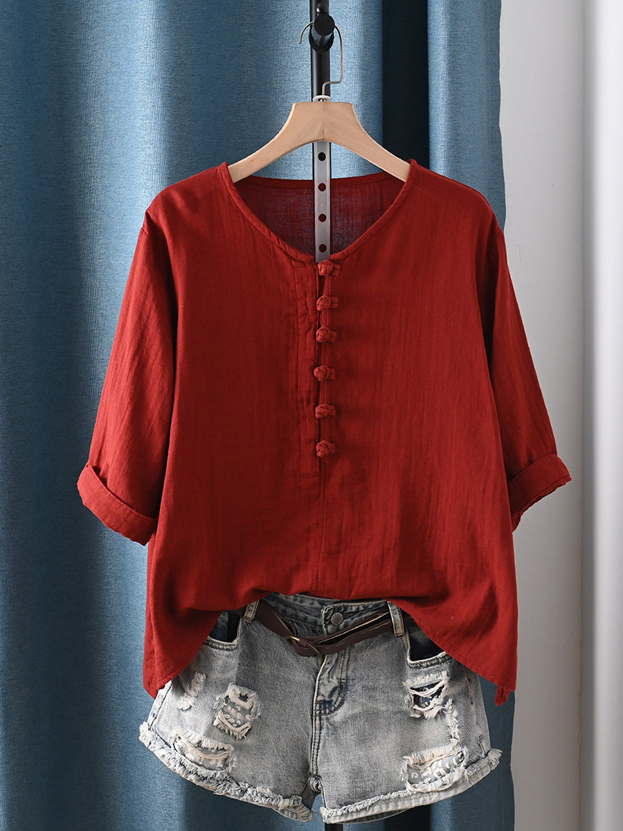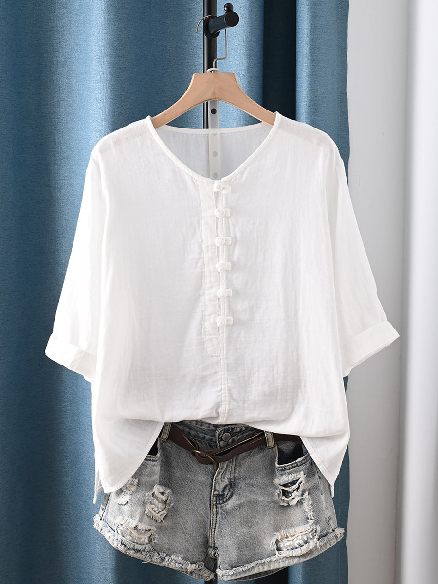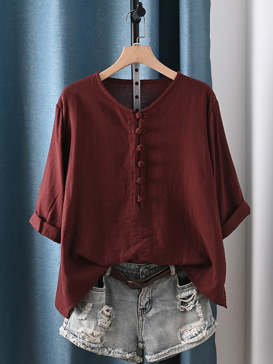 Women Summer Retro Pure Color 100%Cotton Blouse