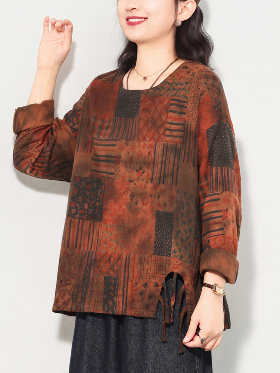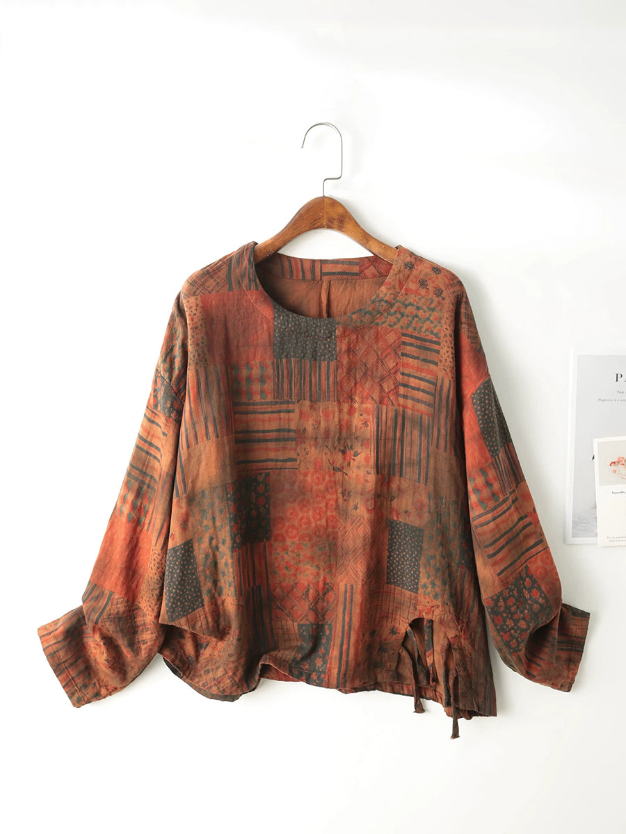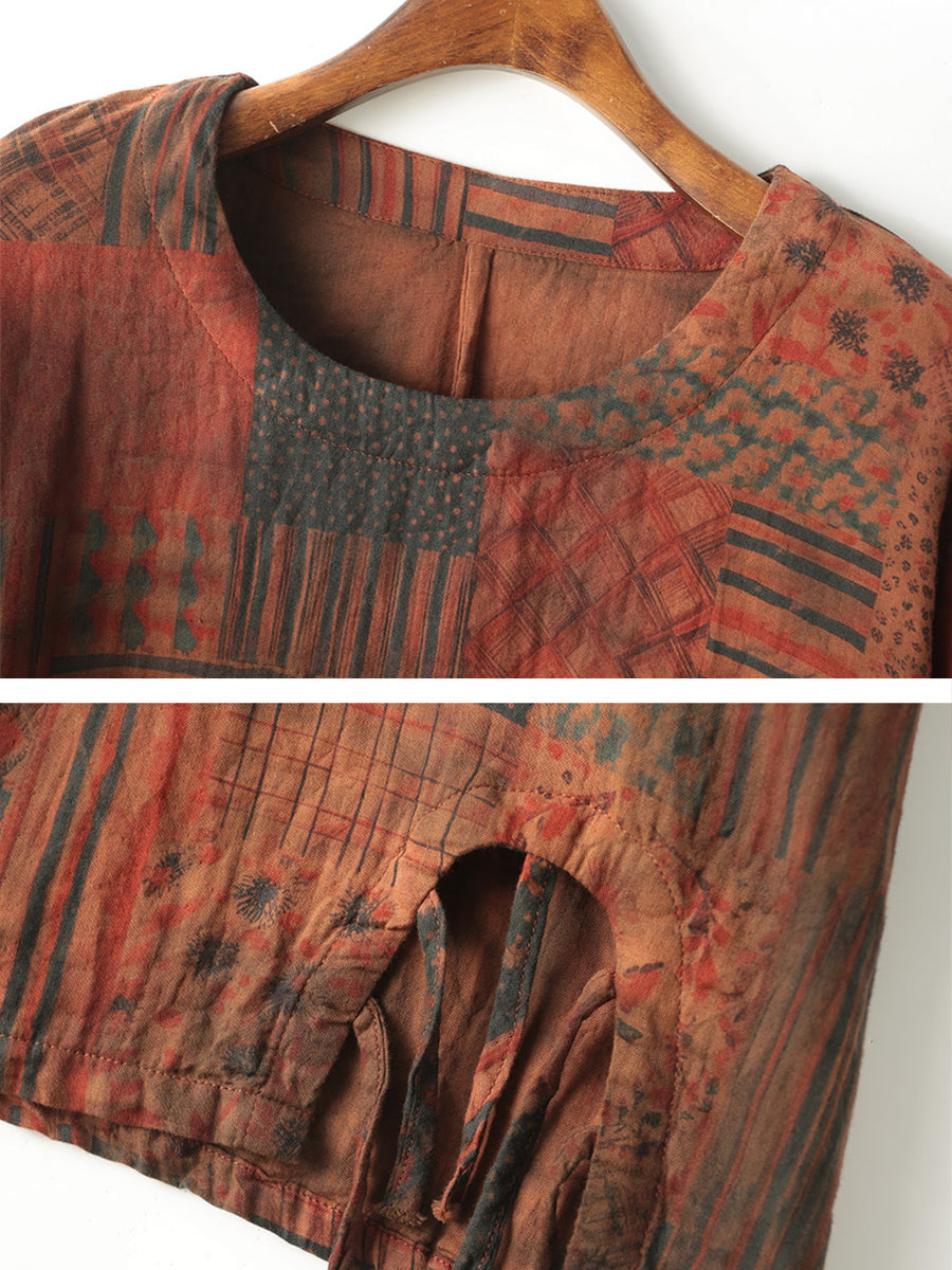 Women Summer Vintage Patchwork O-Neck Cotton Shirt