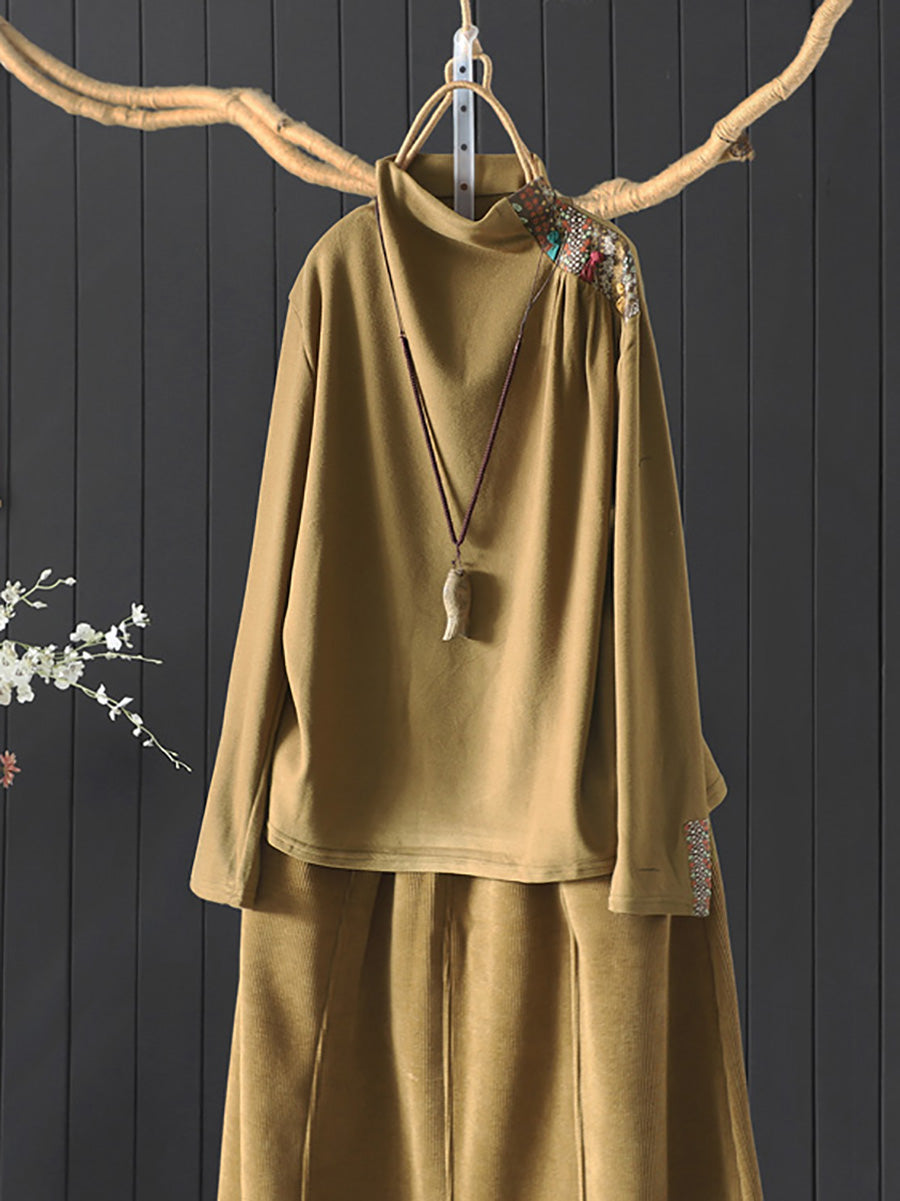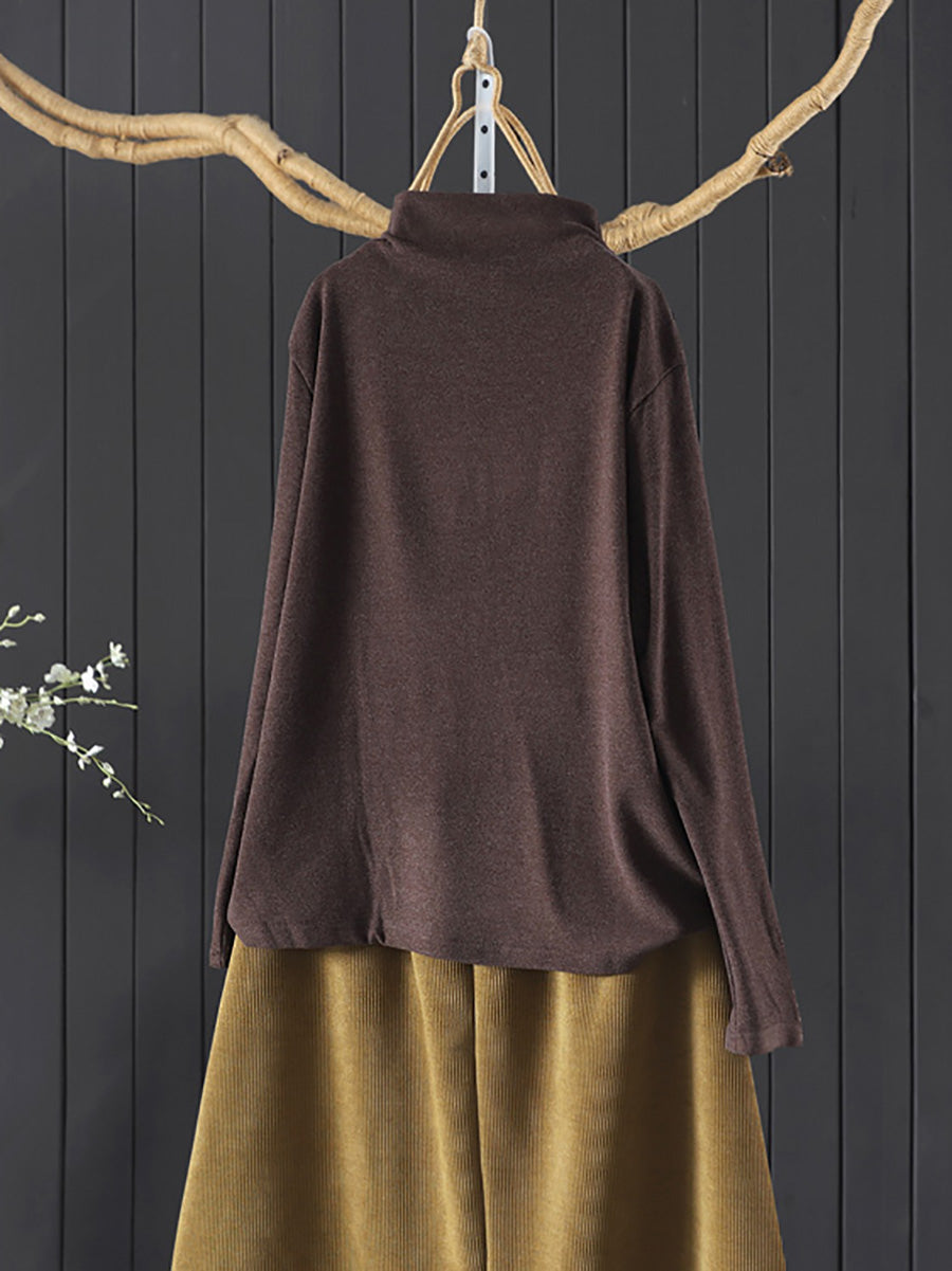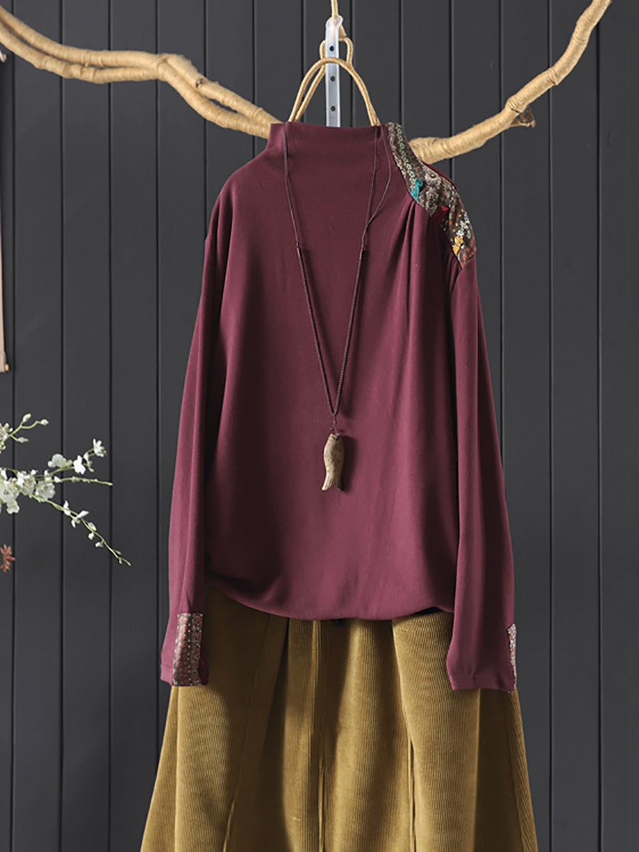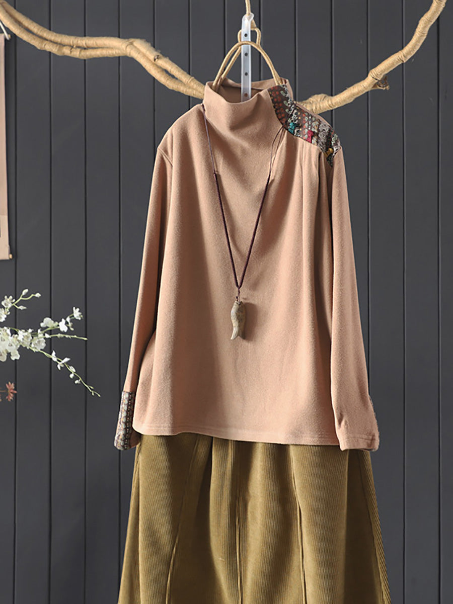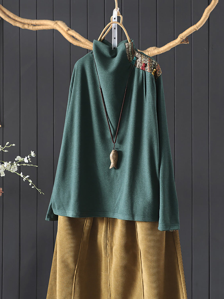 Women Vintage Autumn Patchwork Half-Turtleneck Blouse