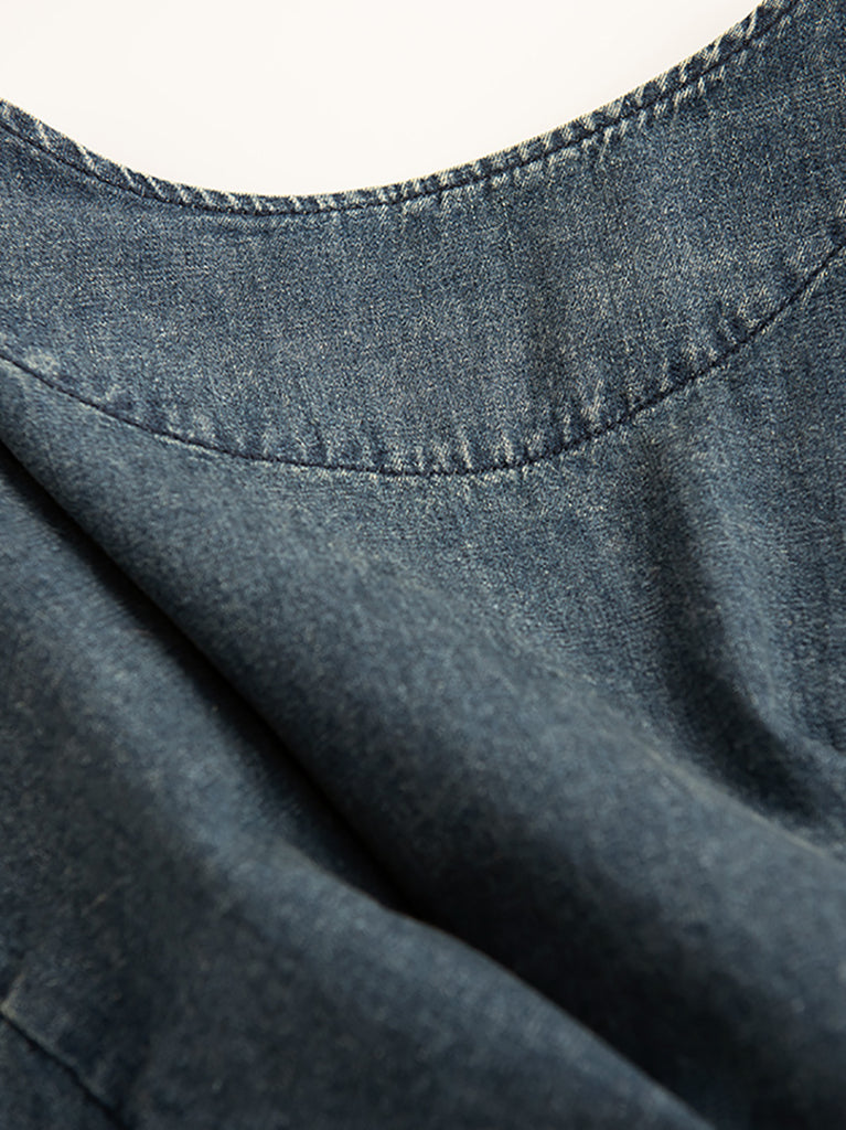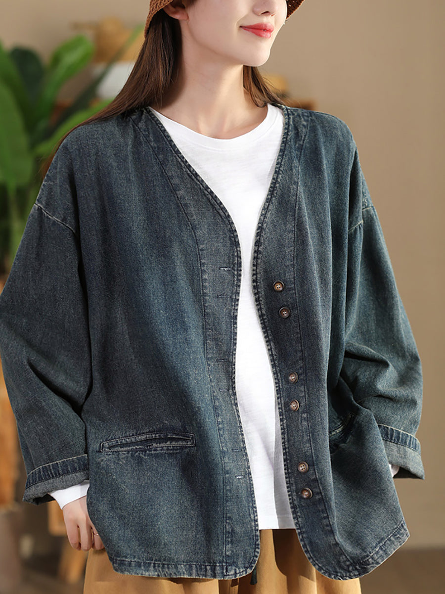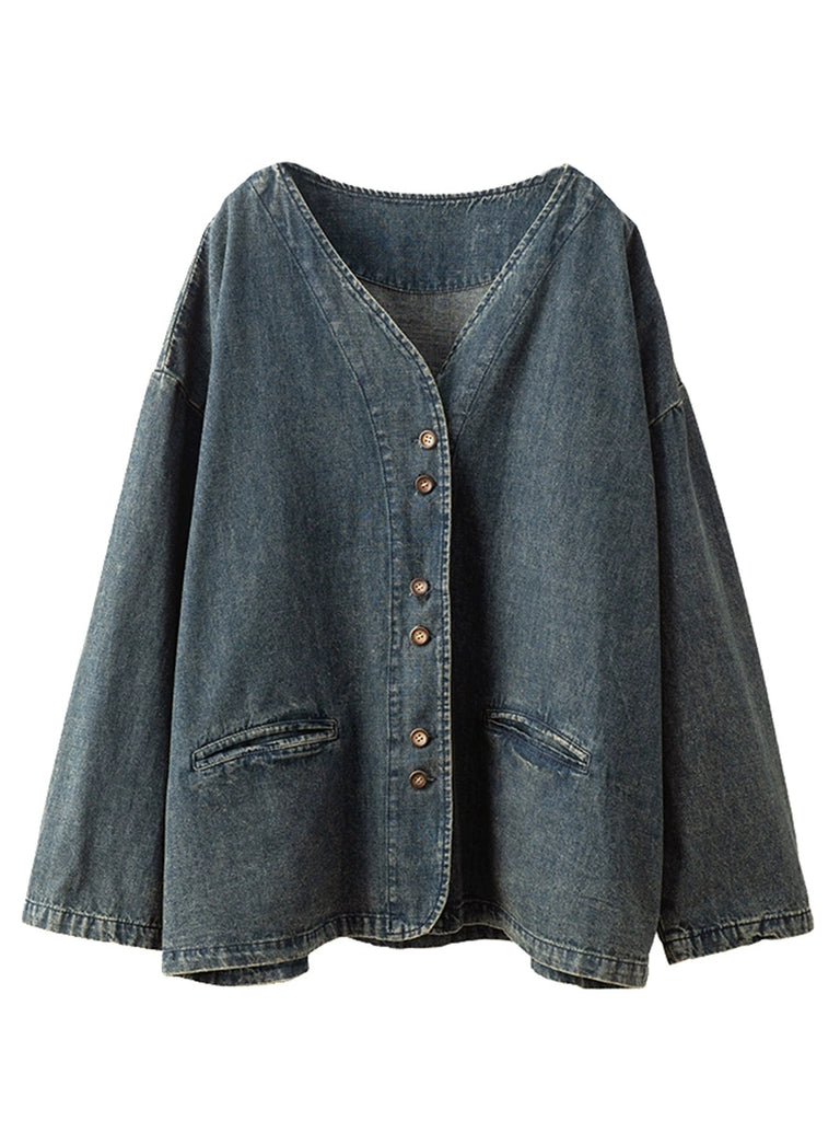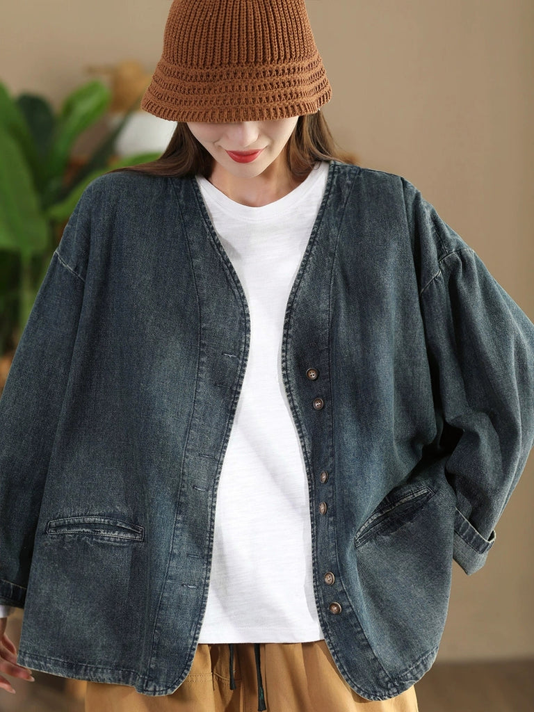 Crafted from denim, this jacket features a solid color design with a V-neck collar. It offers full-length raglan sleeves in a vintage style, ideal for spring and autumn wear.