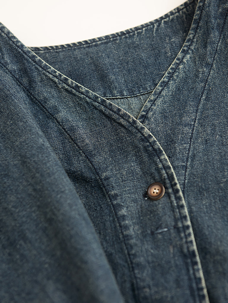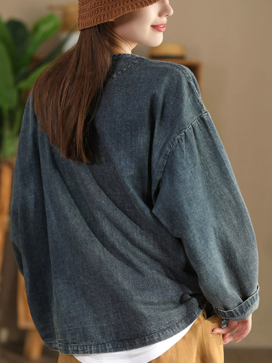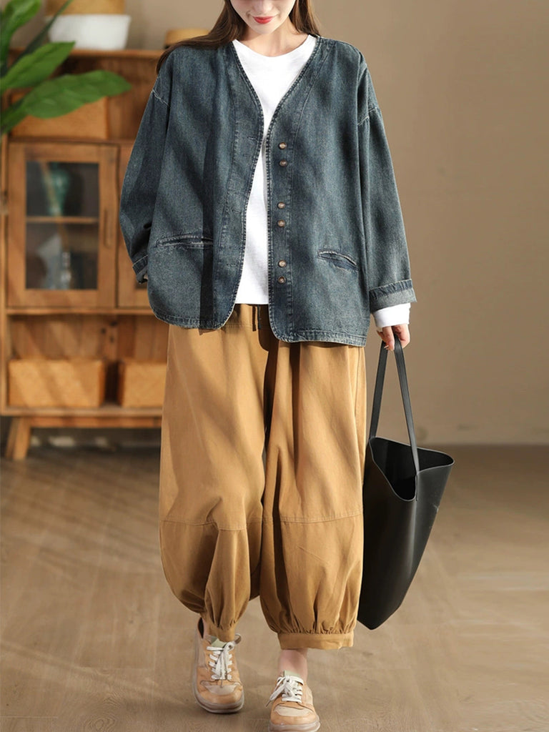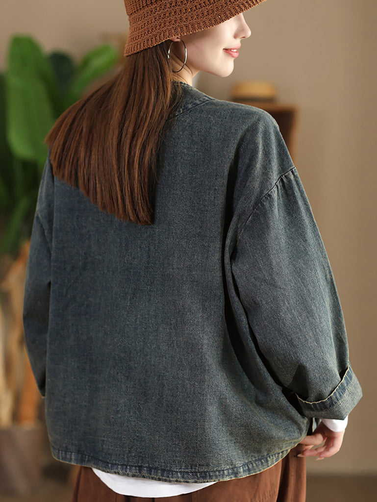 Women Vintage Autumn Pure Color V-Neck Denim Jacket
