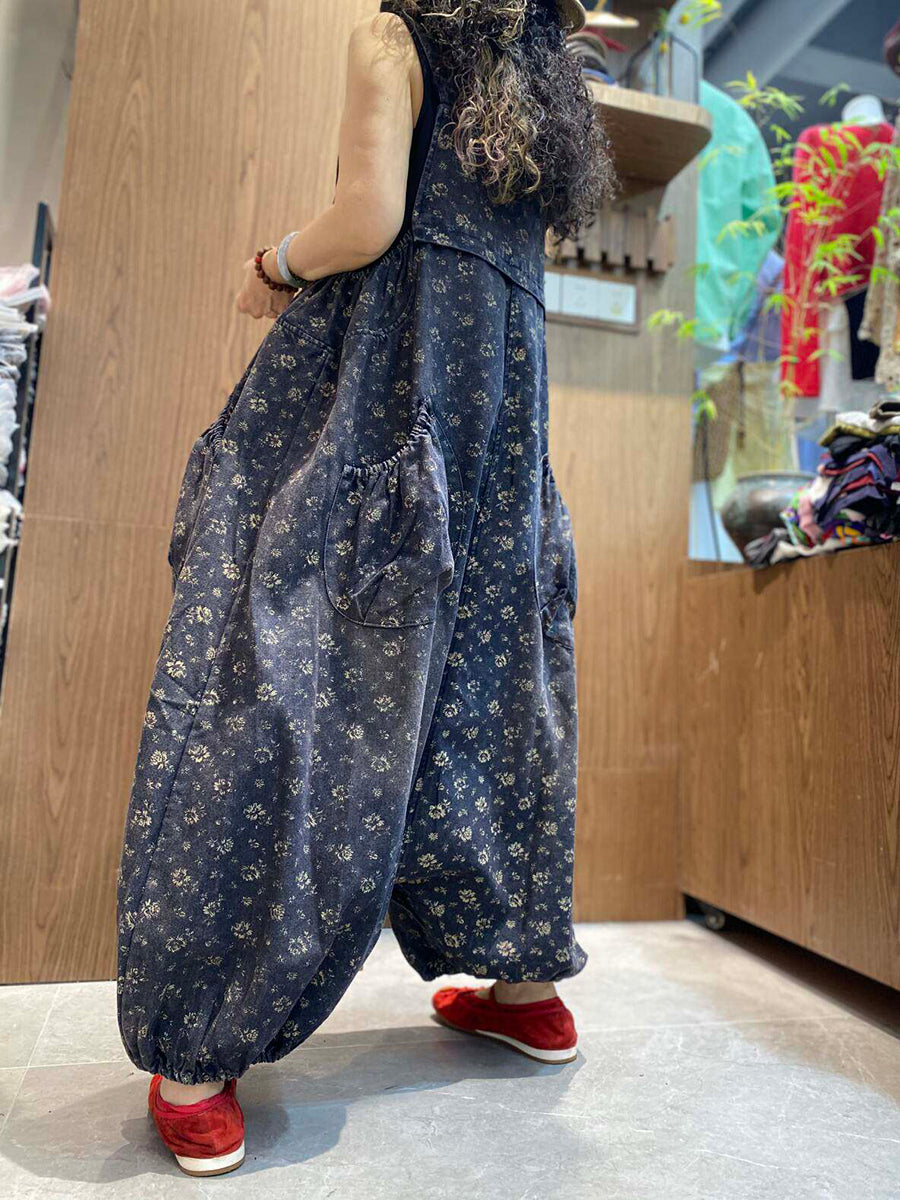 Women Vintage Floral Denim Low Crotch Jumpsuit