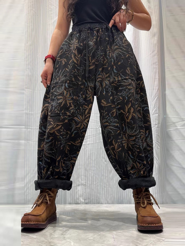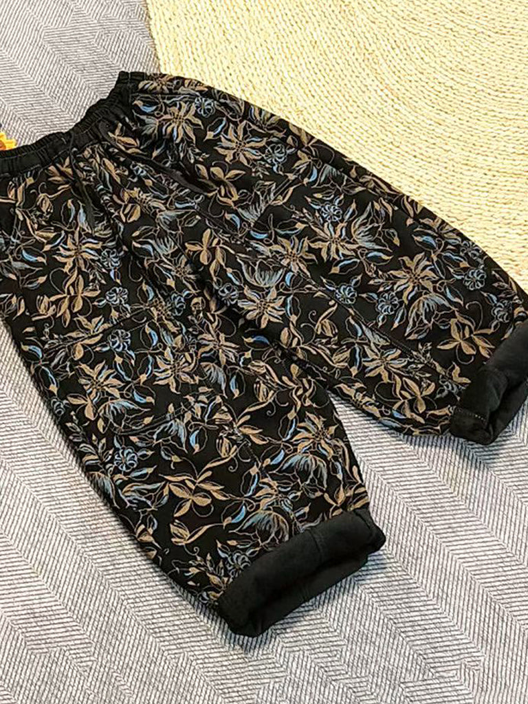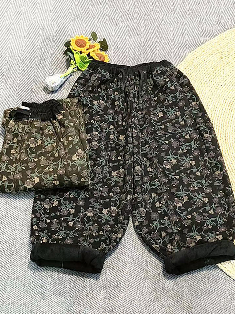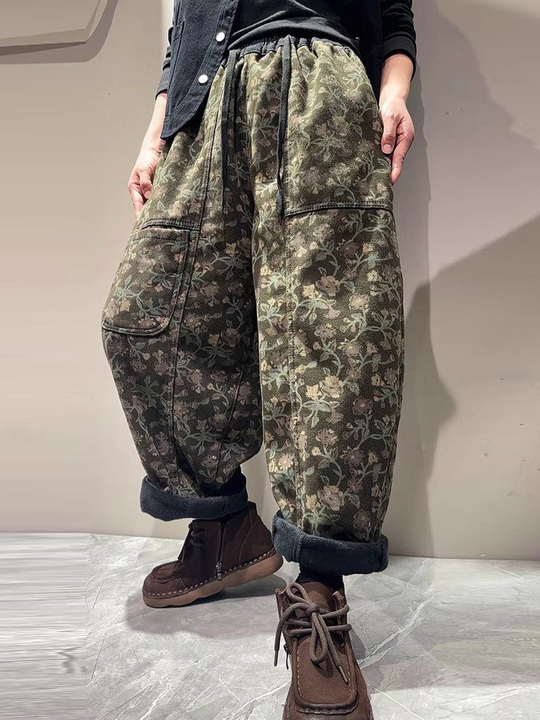 Women Vintage Flower Fleece-lined Loose Harem Pants