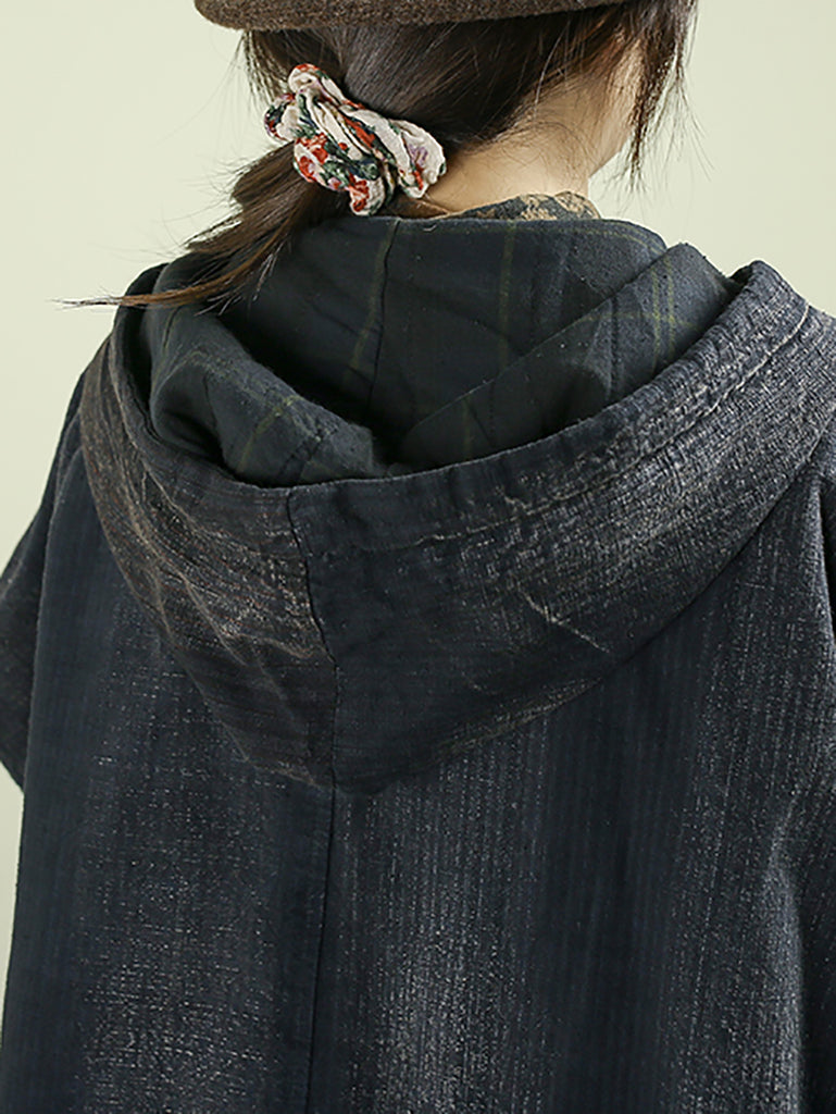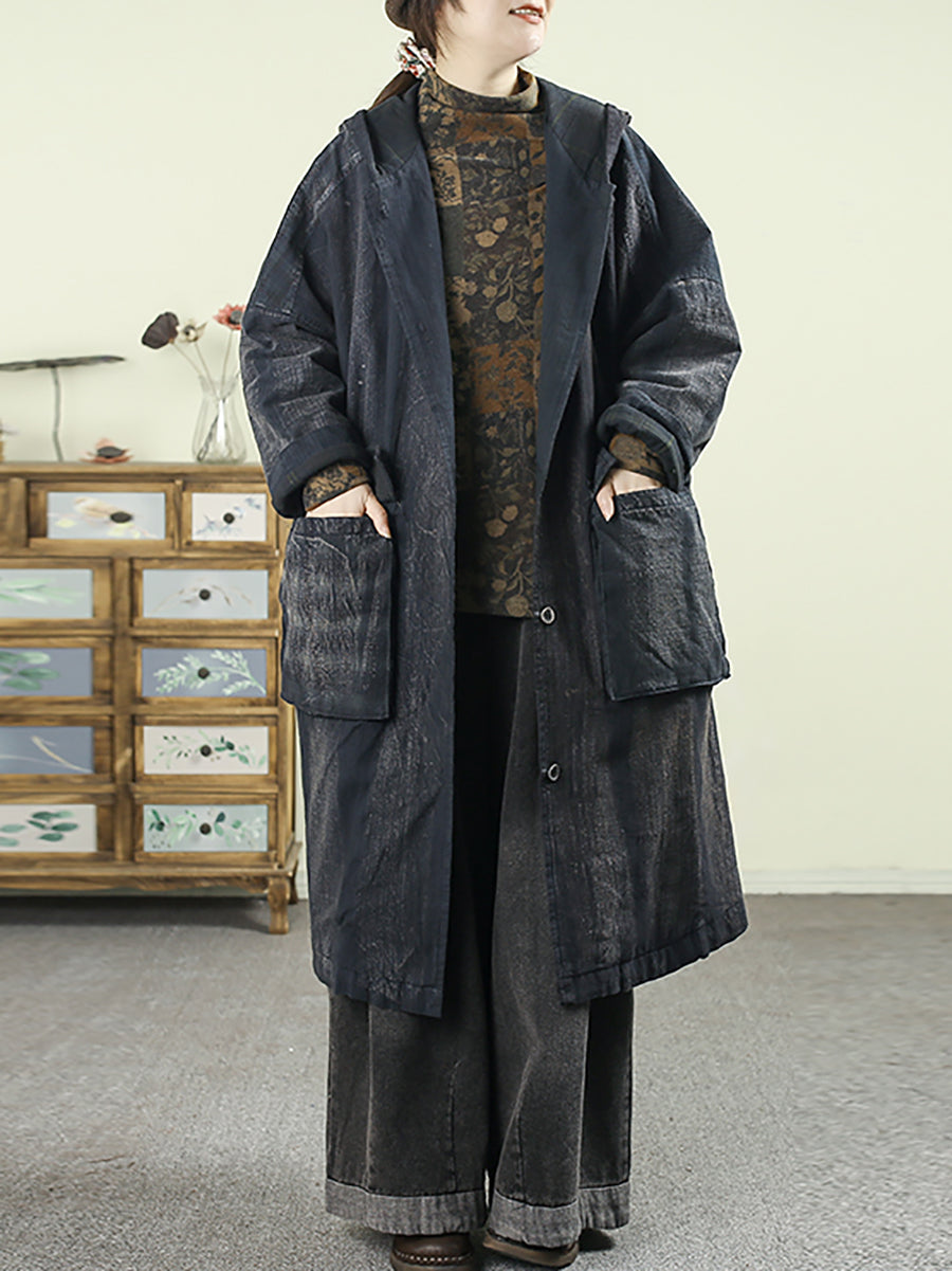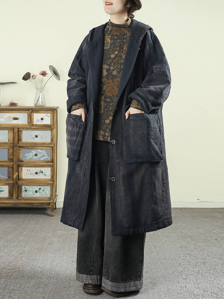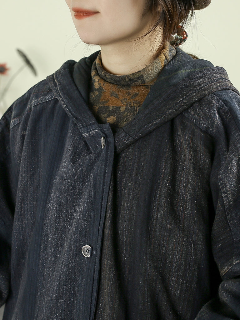 This coat features a pure color denim material with a hooded collar and full raglan sleeves, combining vintage style with practical padding. Designed for autumn and winter wear, it offers both warmth and timeless appeal.
