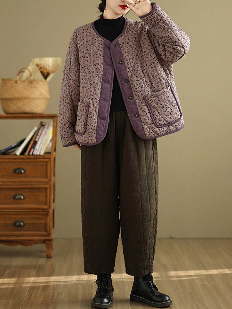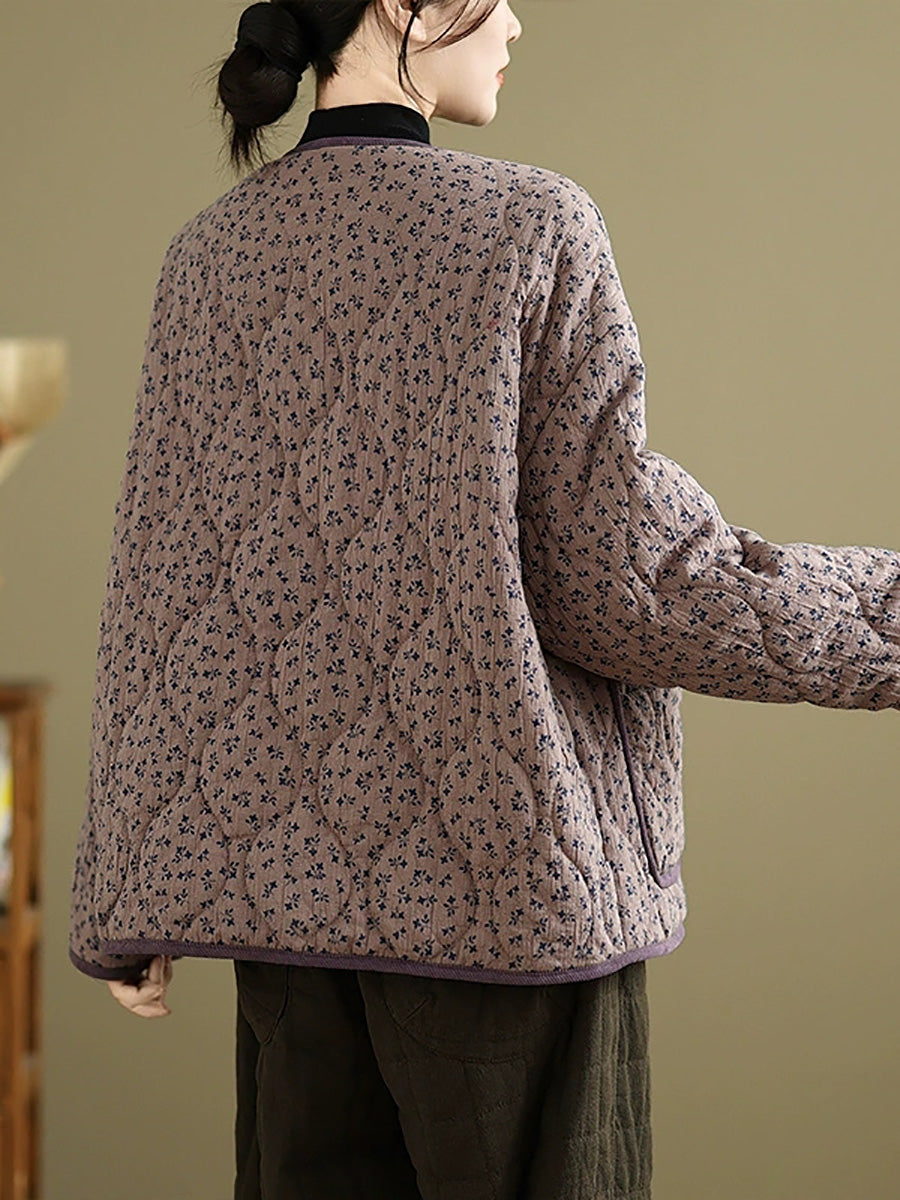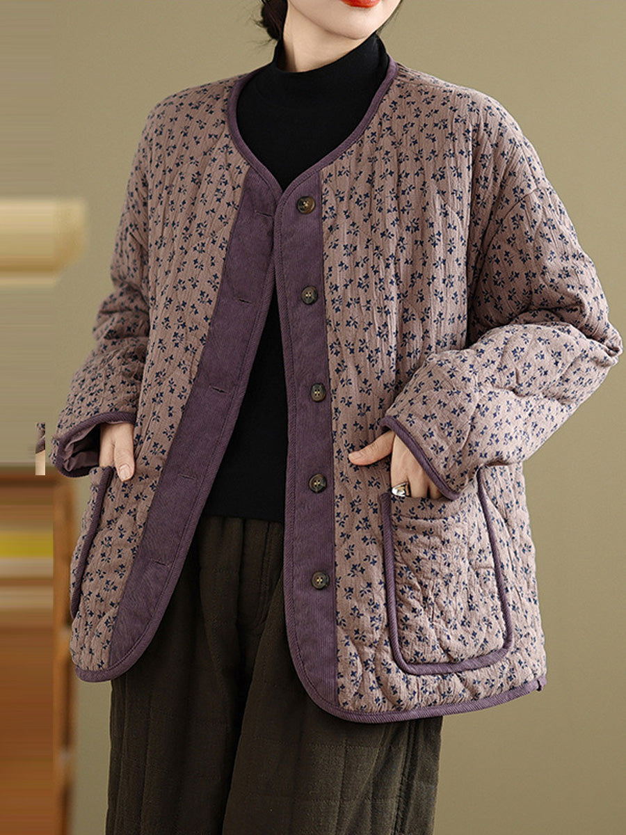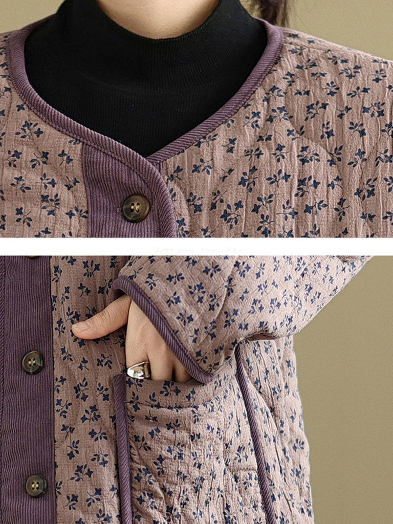 Women Vintage Winter Floral O-Neck Padded Coat