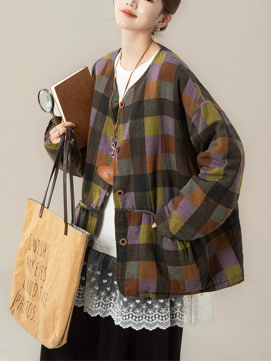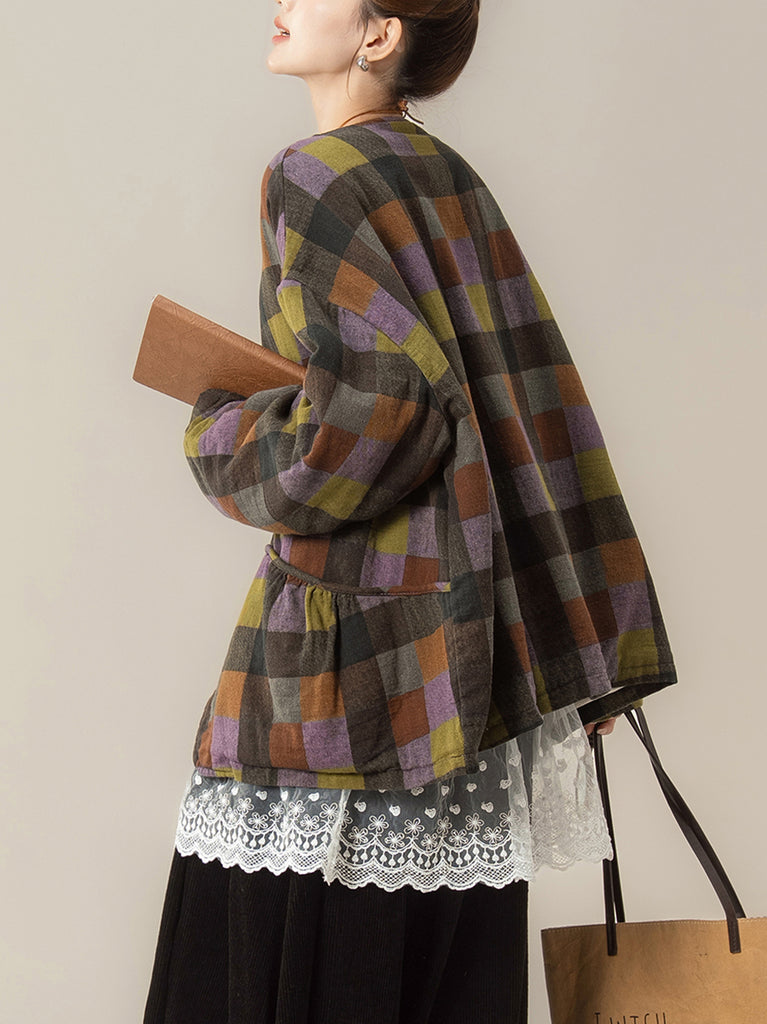 Women Vintage Winter Plaid O-Neck Padded Coat