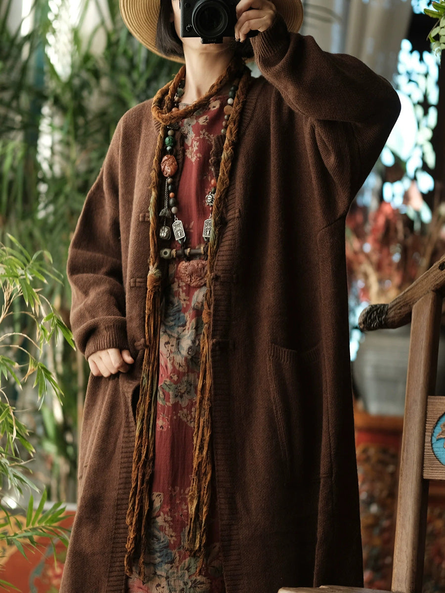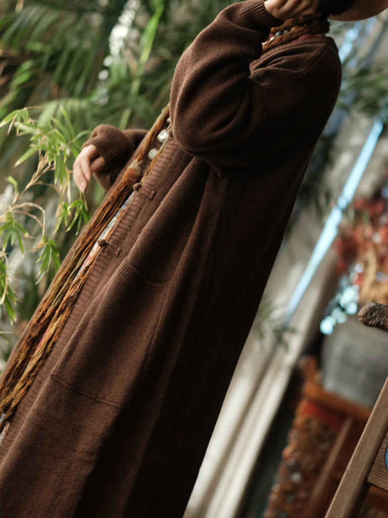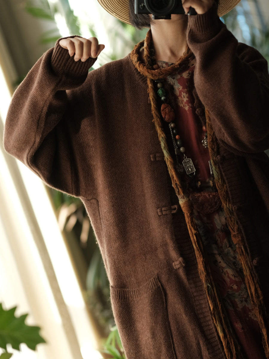 Women Vintage Winter Pure Color O-Neck Wool Knitted Coat