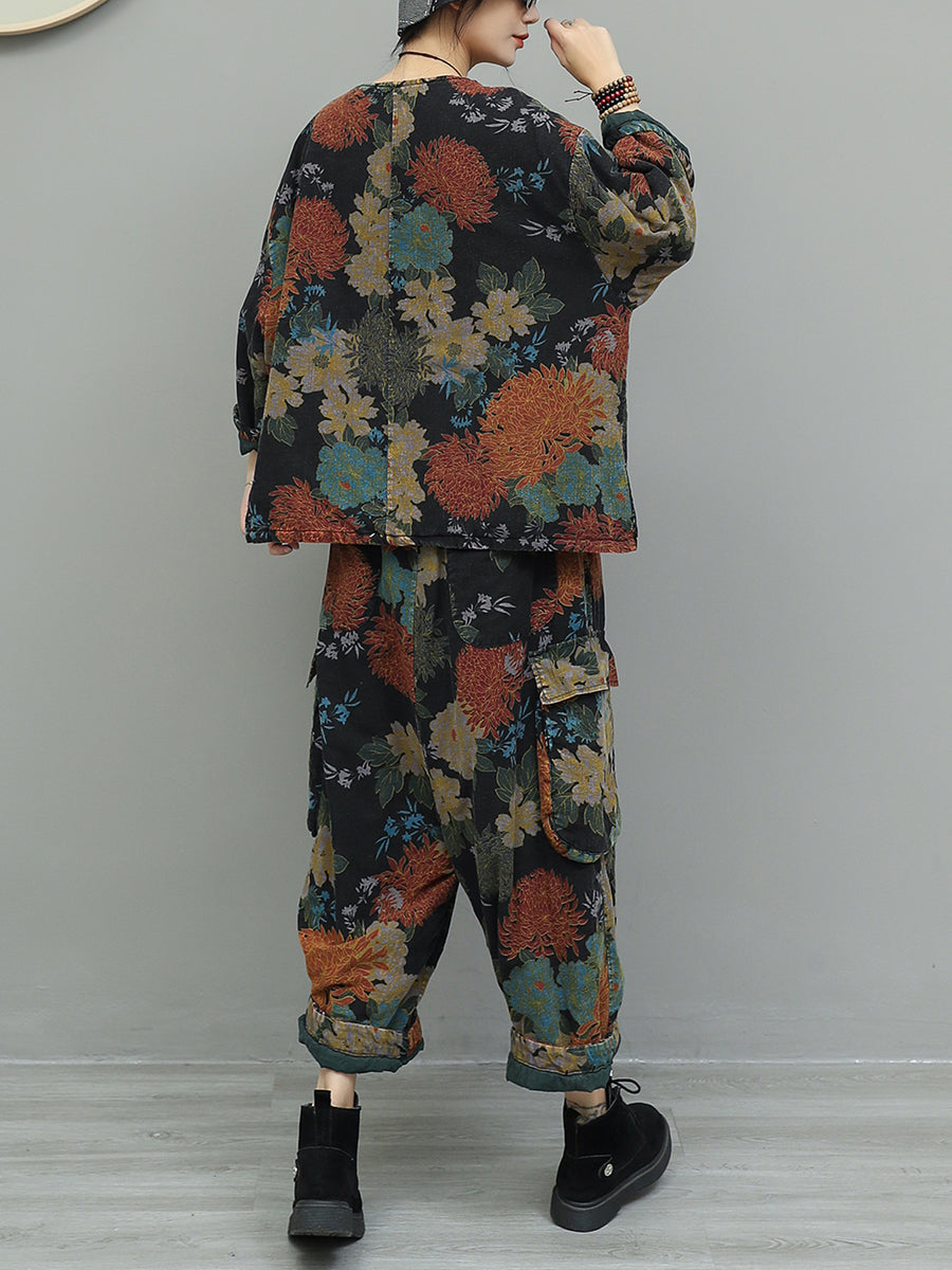 Women Winter Ethnic Flower O-Neck Padded Suits