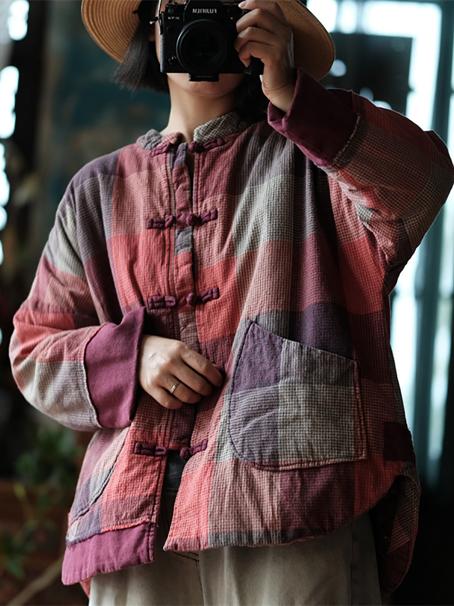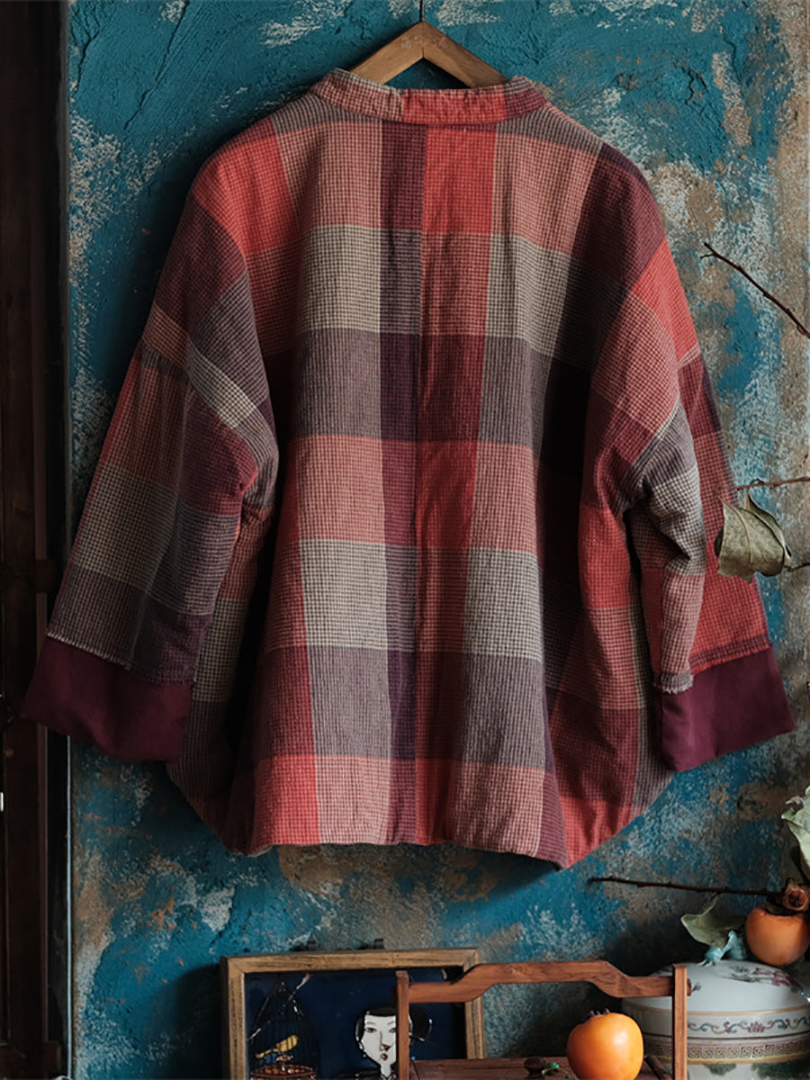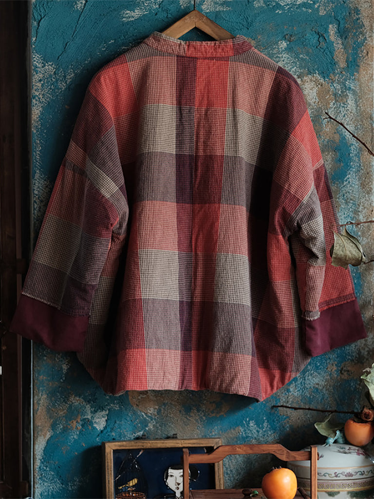 Women Winter Plaid Stand Collar Cotton Padded Coat