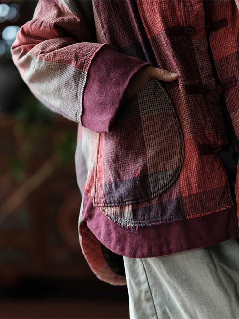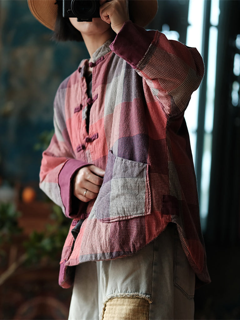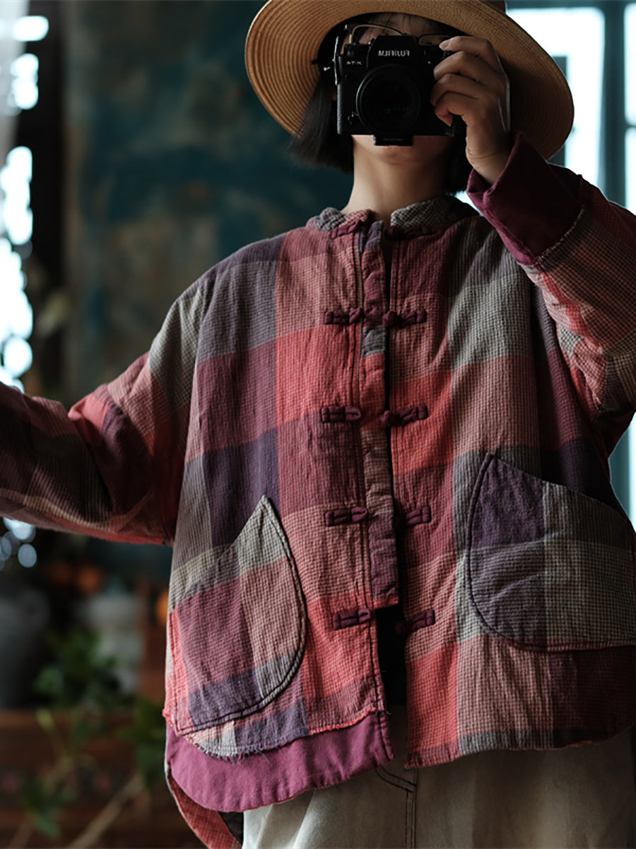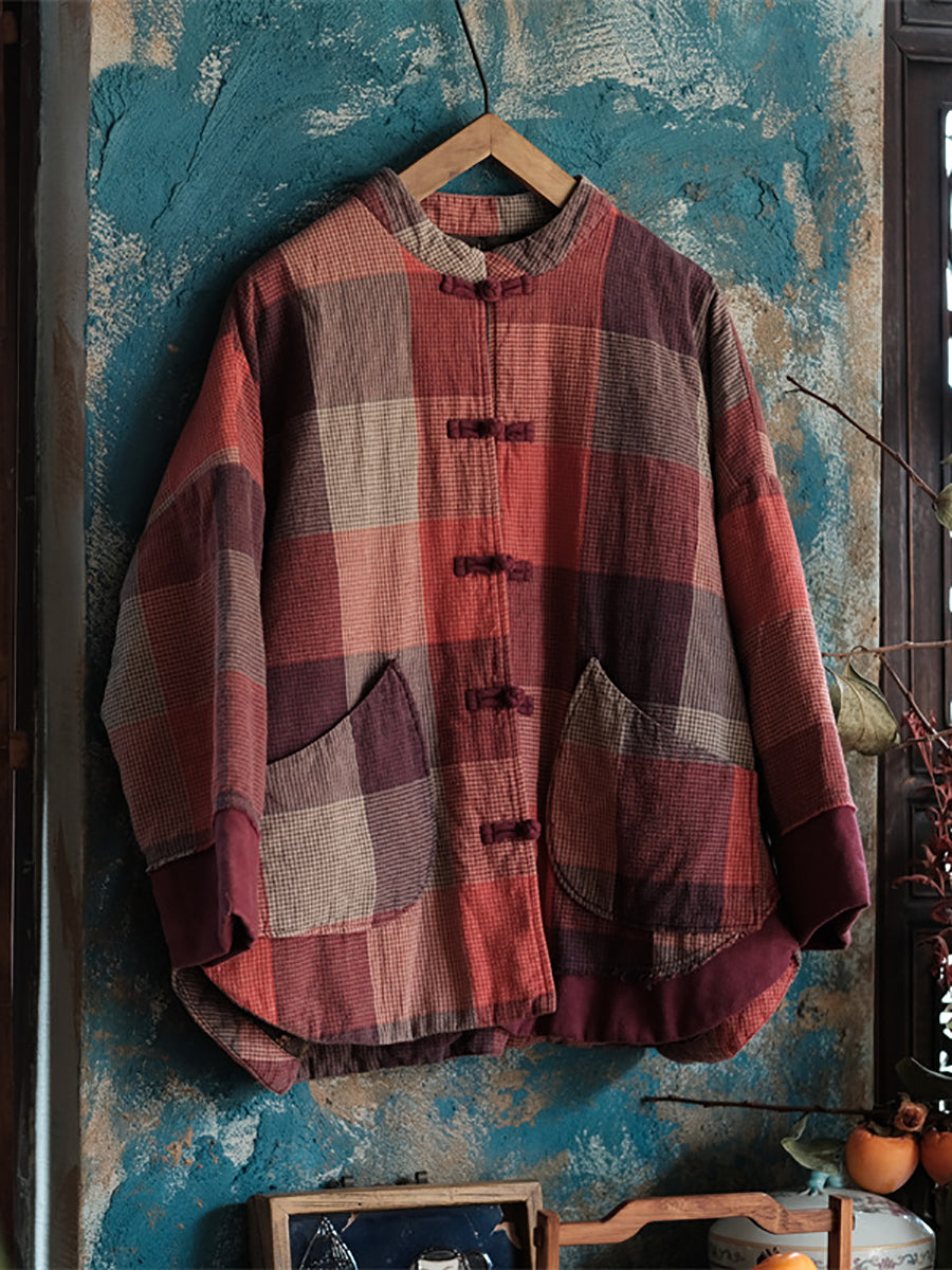 Women Winter Plaid Stand Collar Cotton Padded Coat