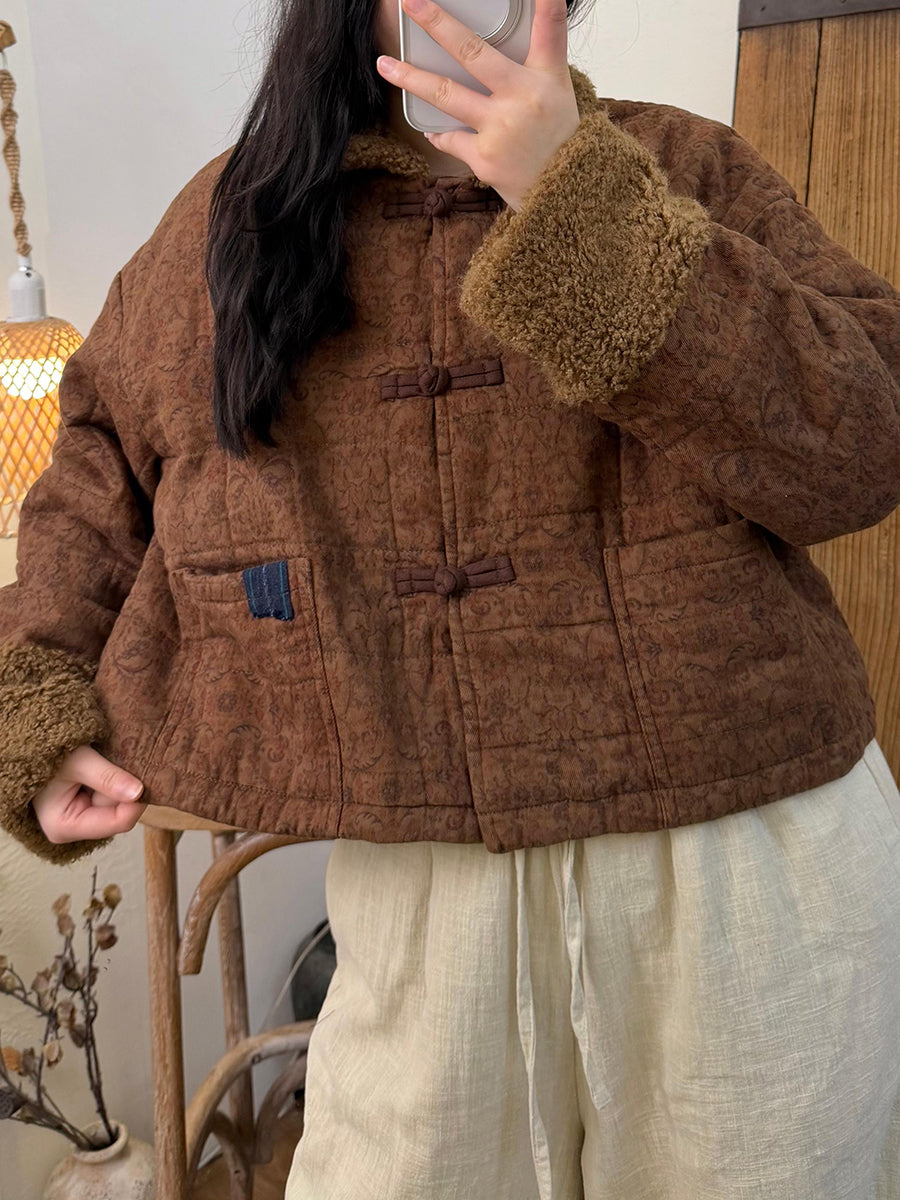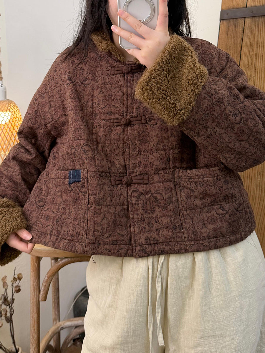 Women Winter Retro Print Fleece Spliced O-Neck Padded Coat