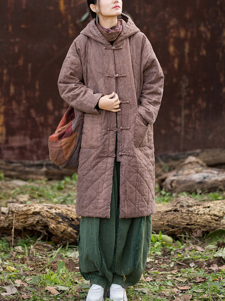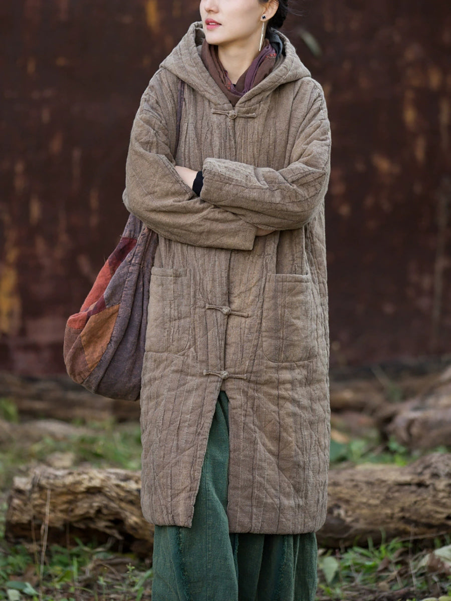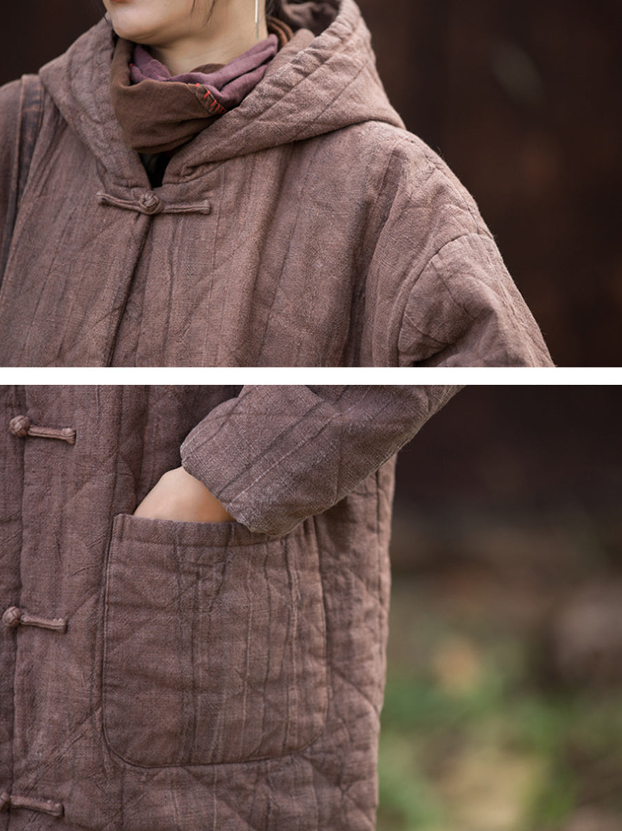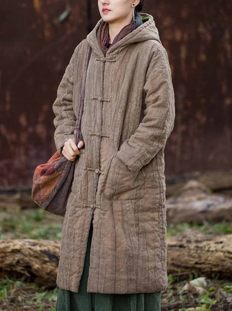 Women Winter Retro Pure Color Ramie Padded Hooded Coat