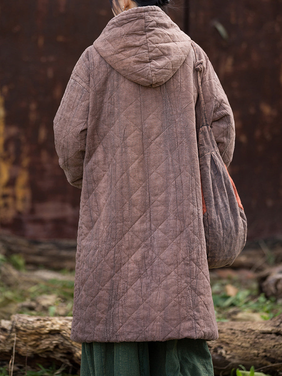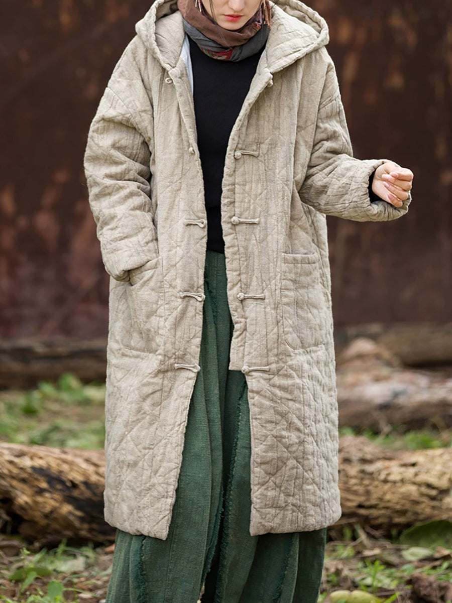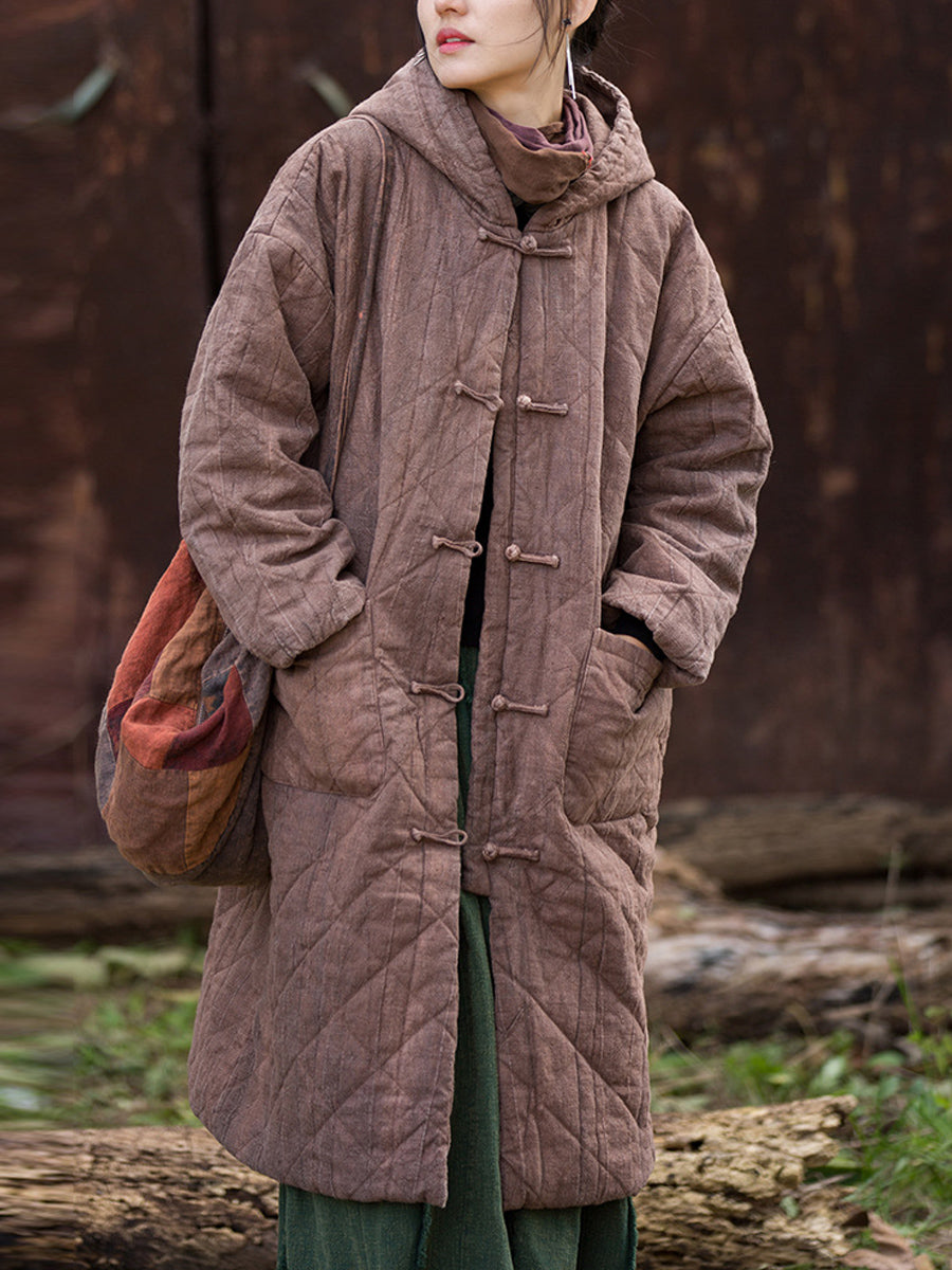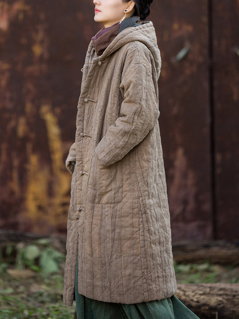 Women Winter Retro Pure Color Ramie Padded Hooded Coat