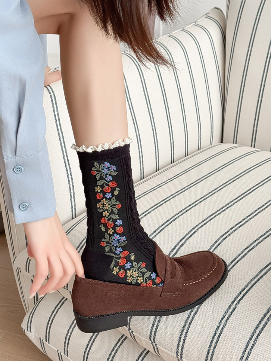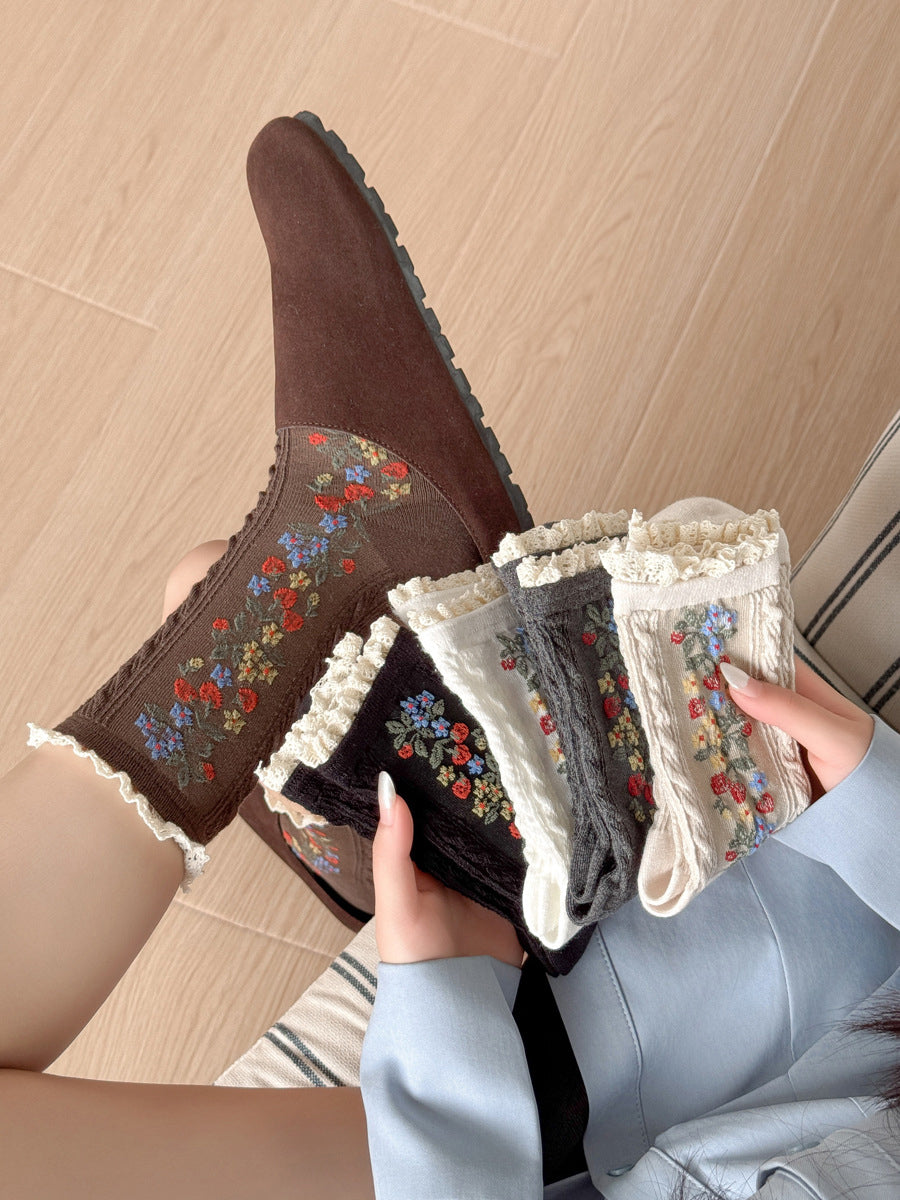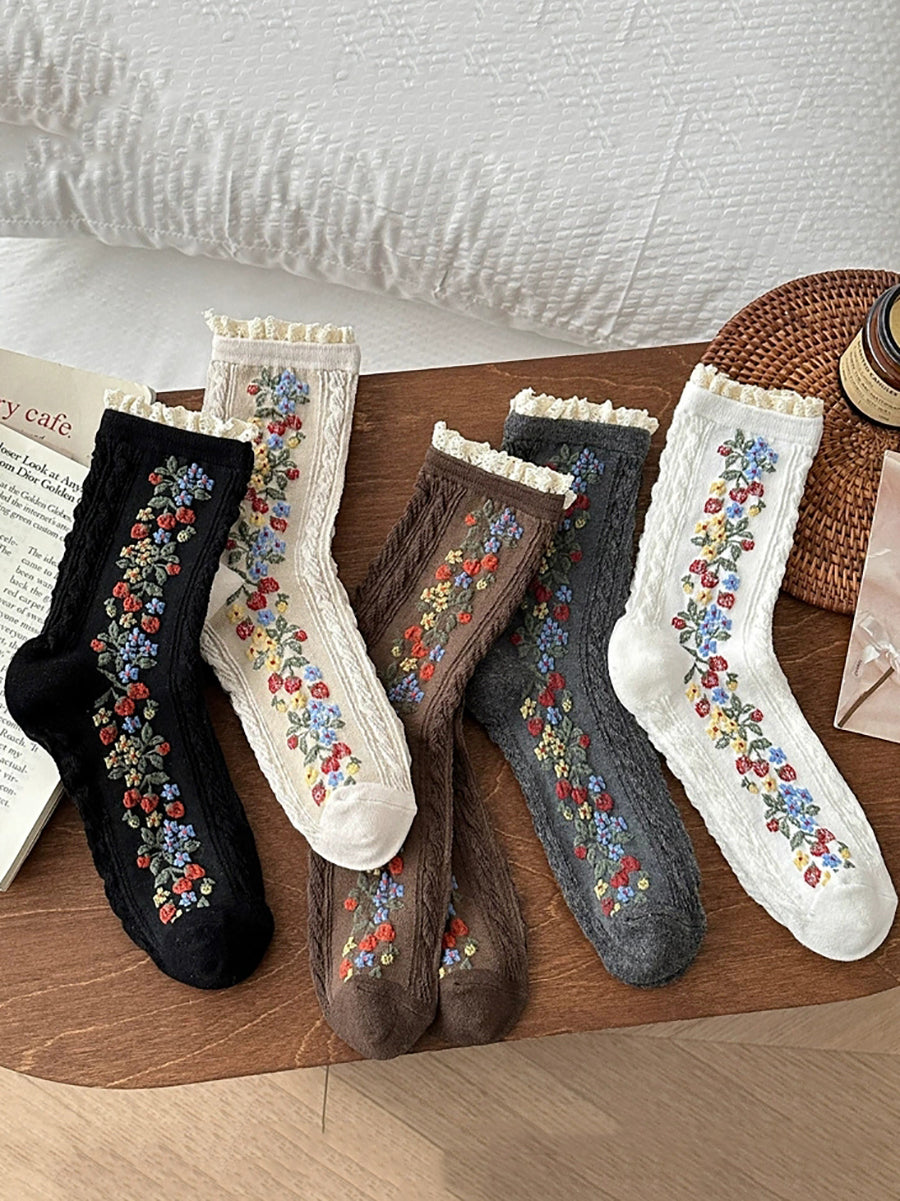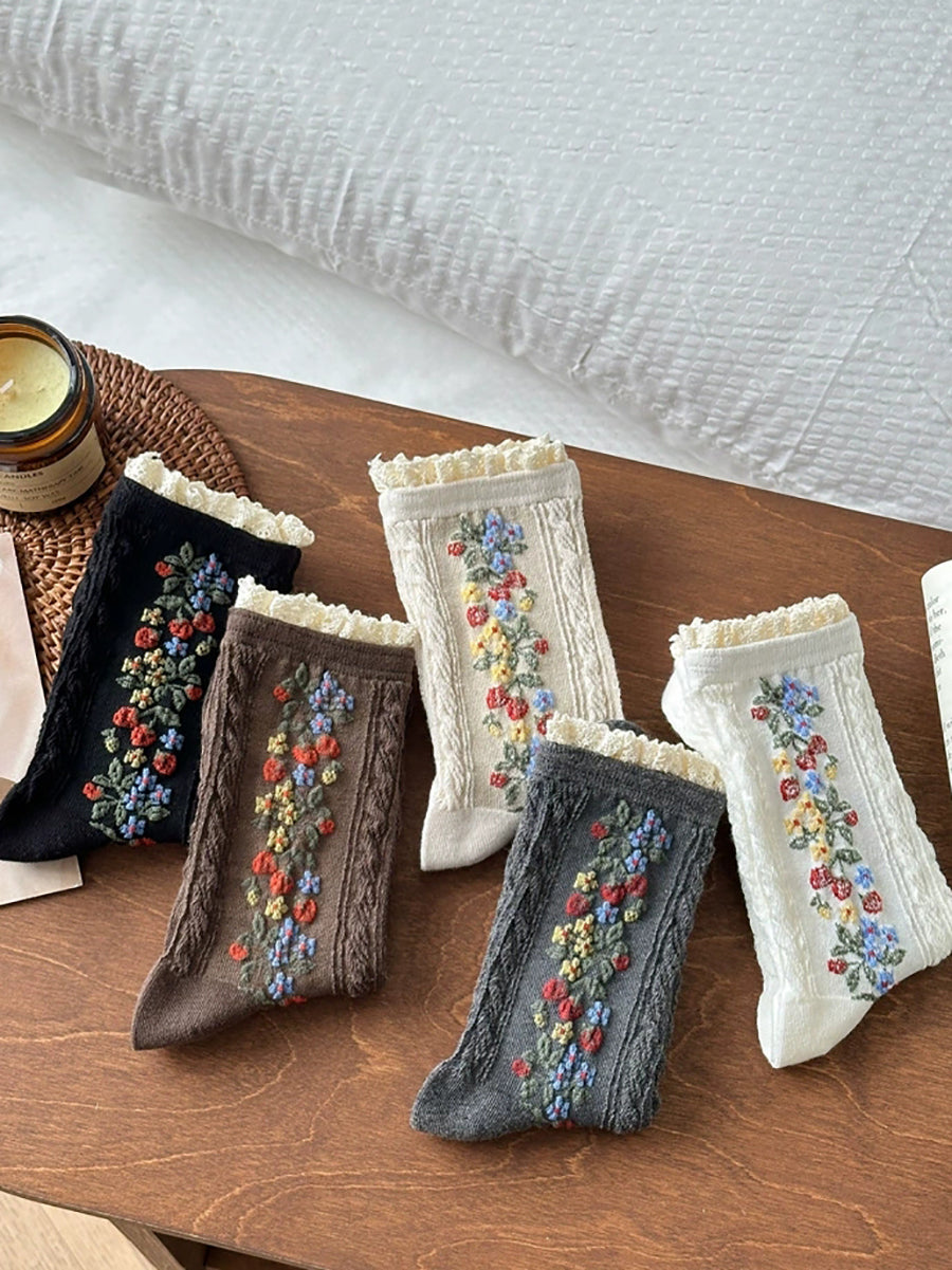 5 pares de calcetines de encaje de punto con flores artísticas para mujer