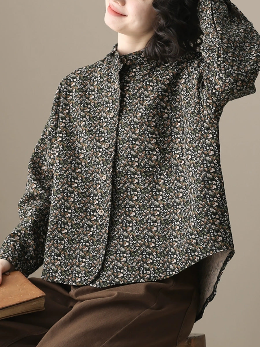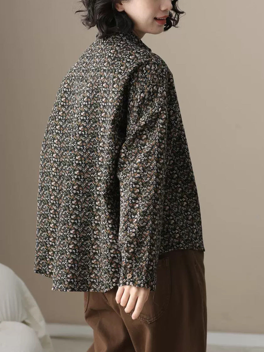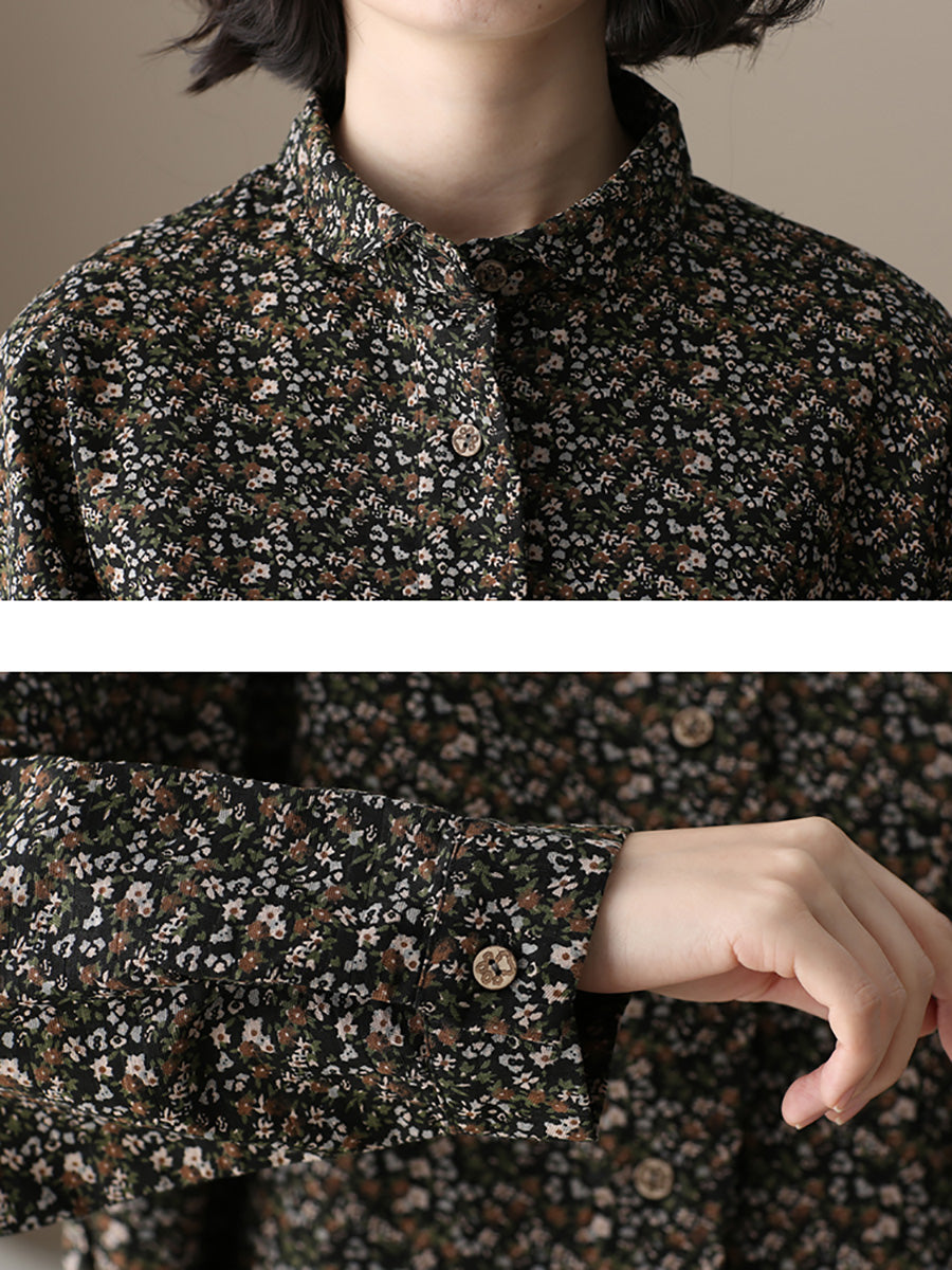 Camisa de algodón con cuello vuelto y estampado floral otoñal para mujer