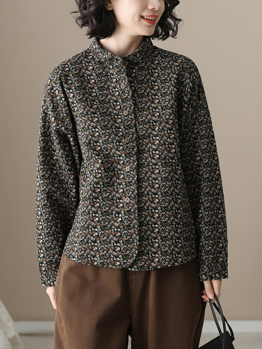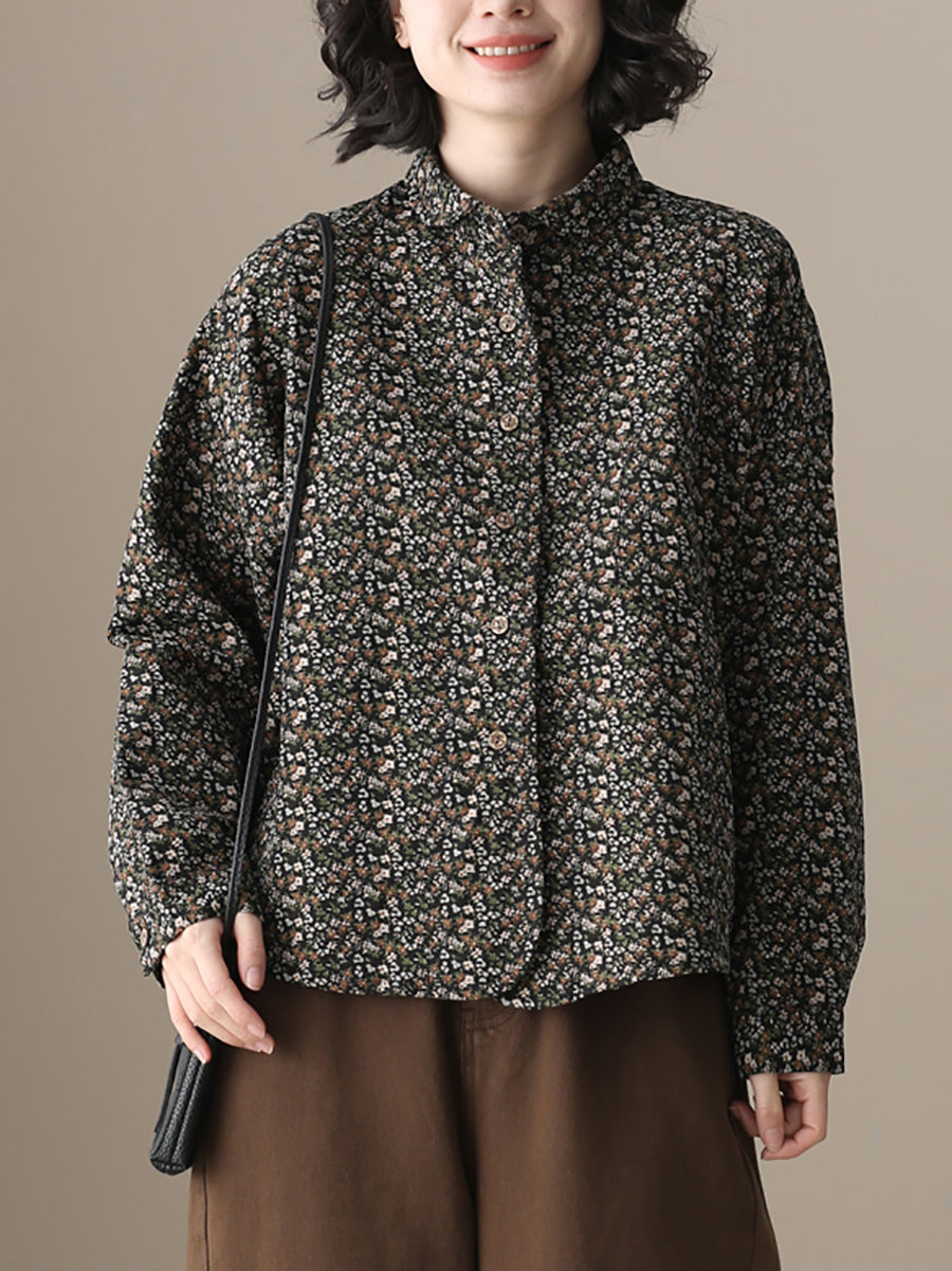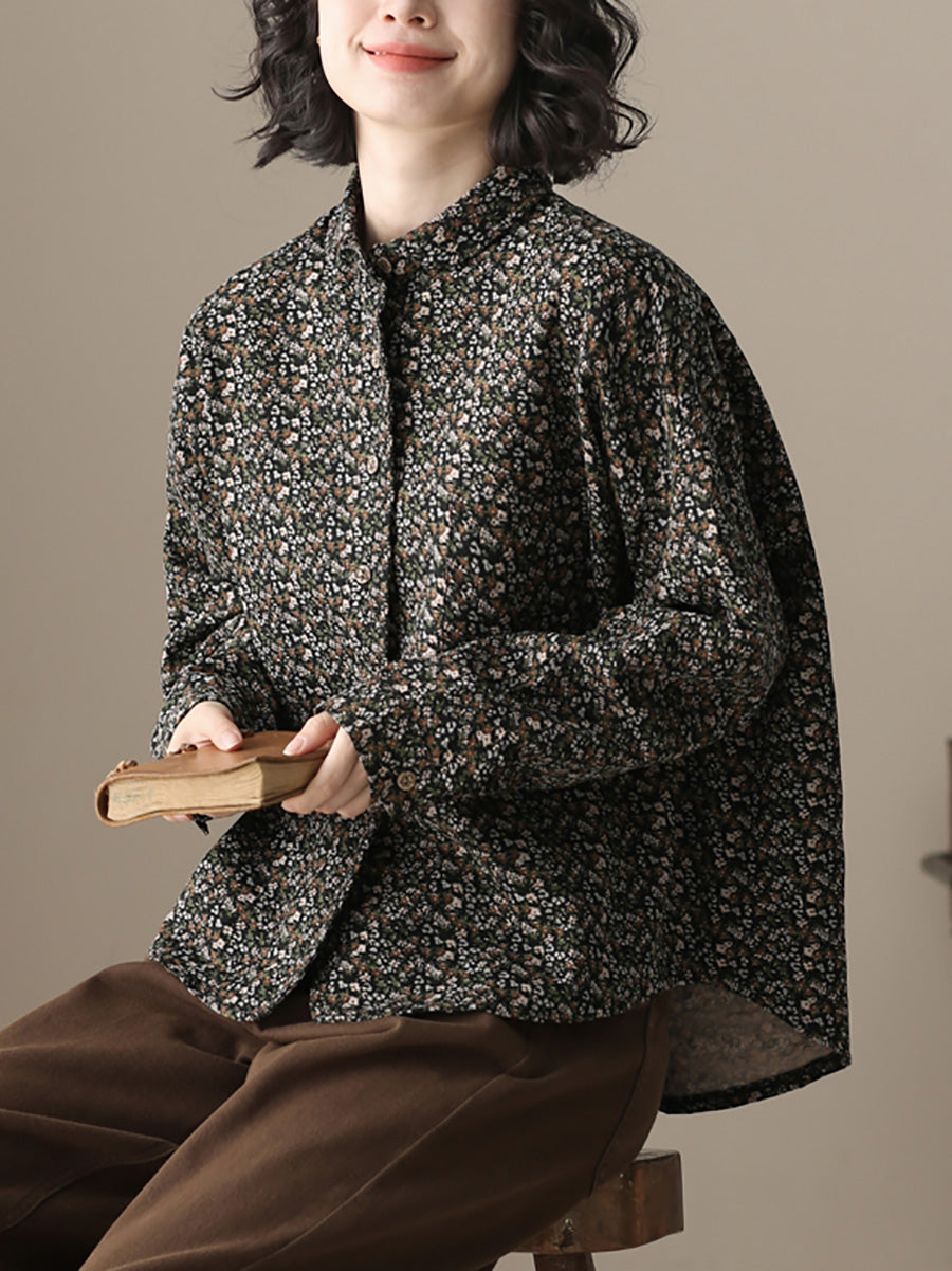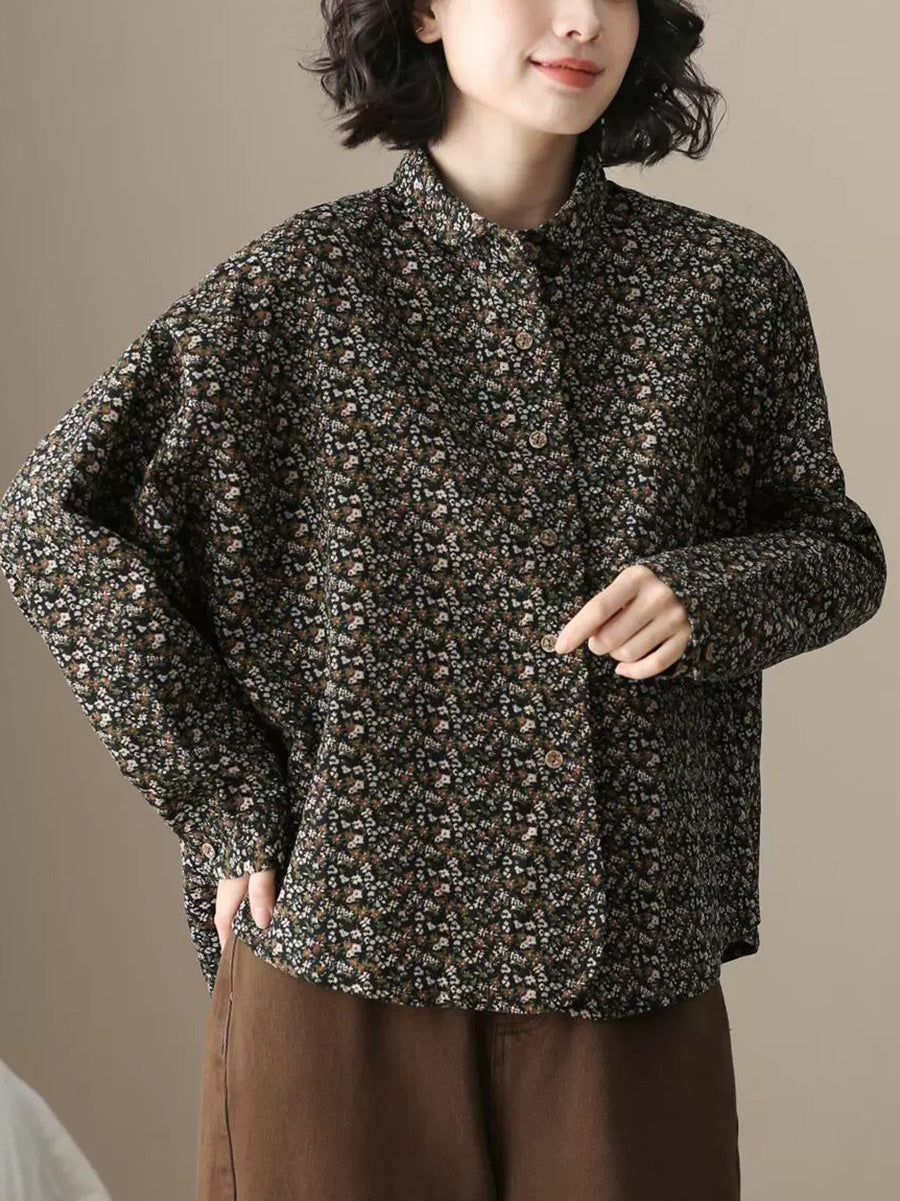 Camisa de algodón con cuello vuelto y estampado floral otoñal para mujer