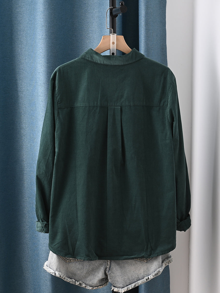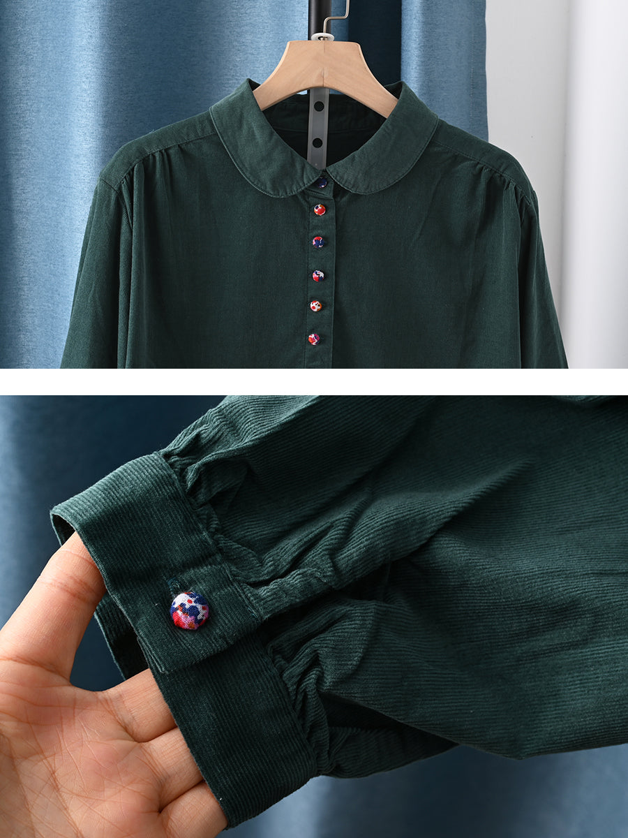 Camisa de pana con botones coloridos y estilo artístico para mujer