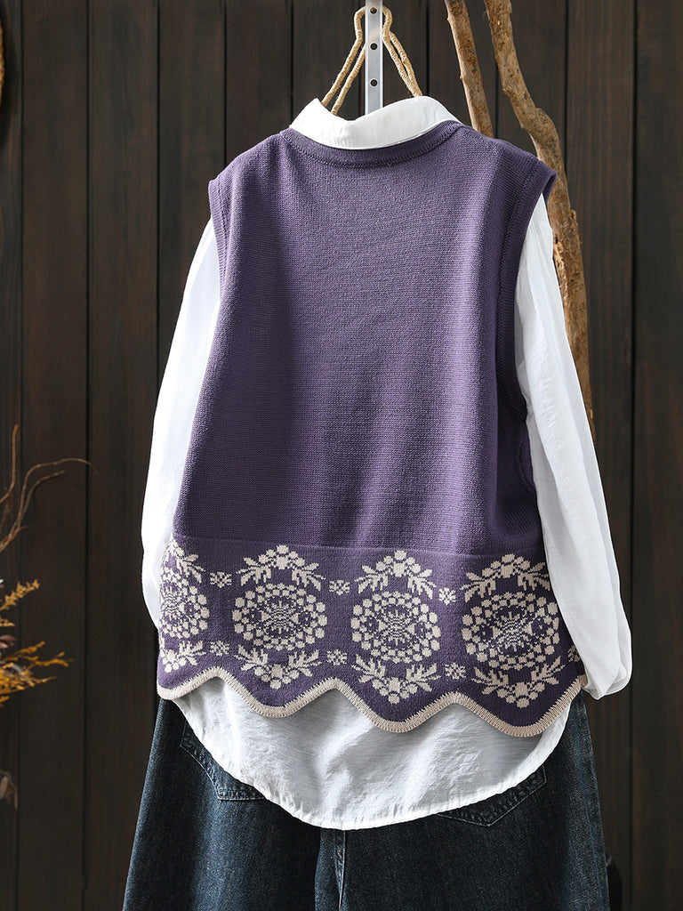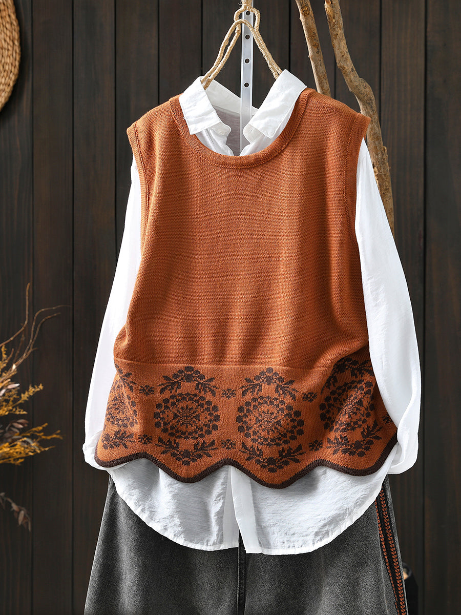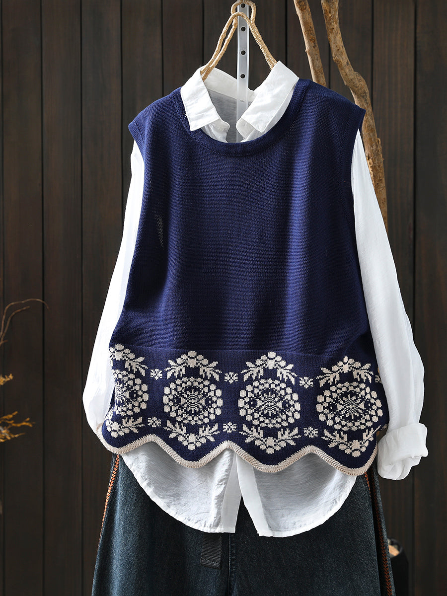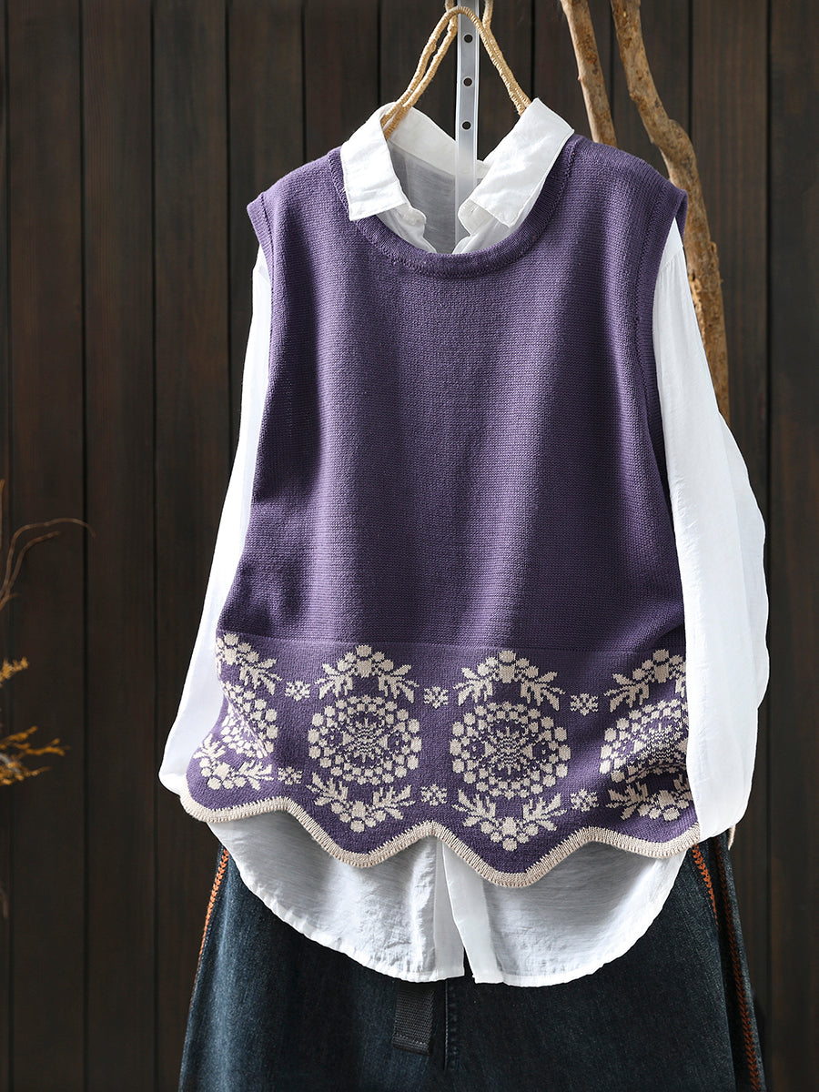 Chaleco de punto con cuello redondo y dobladillo ondulado con flores artísticas para mujer