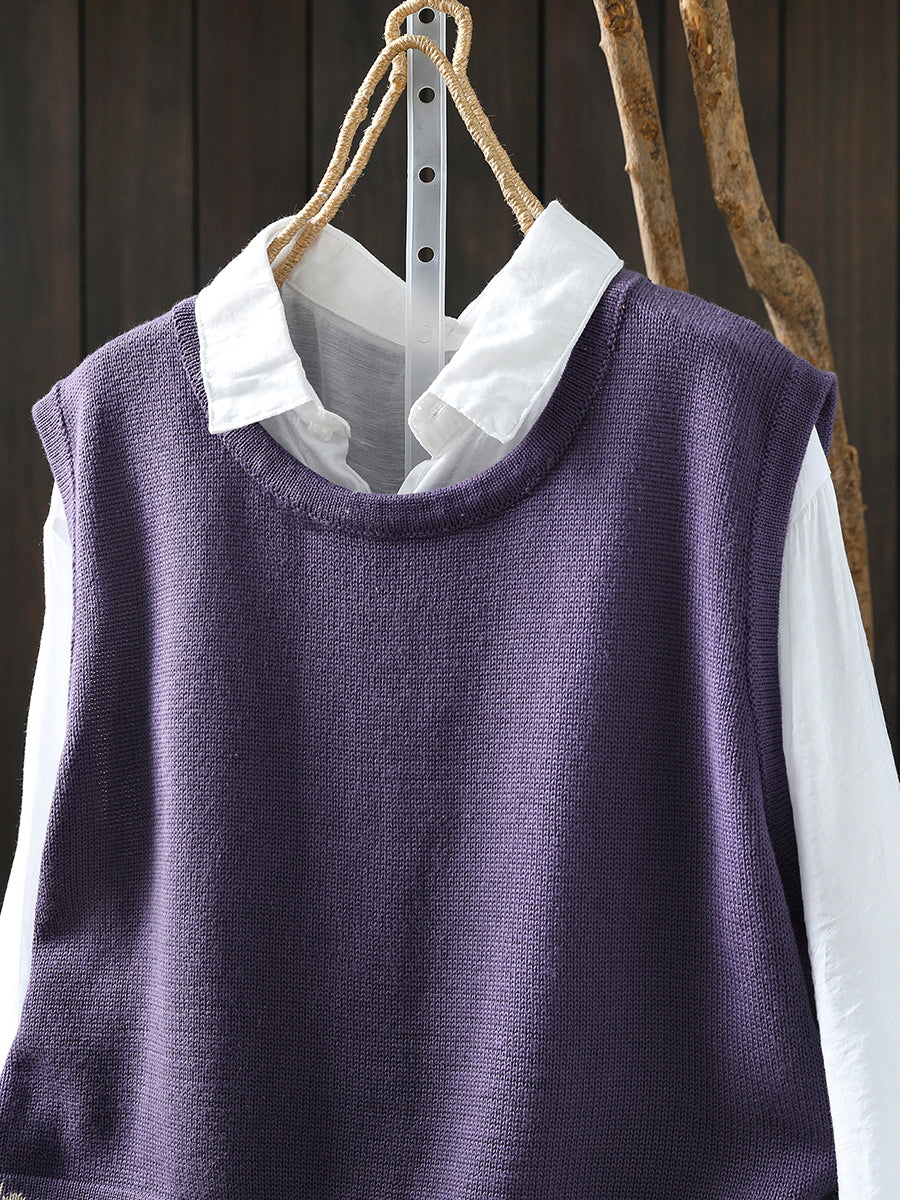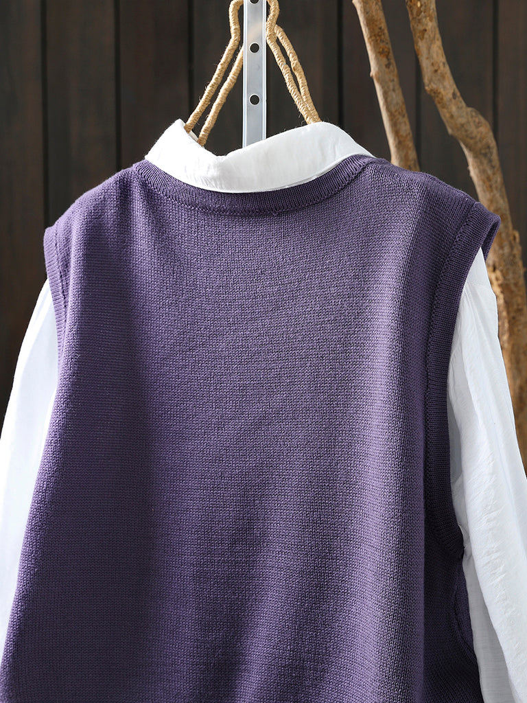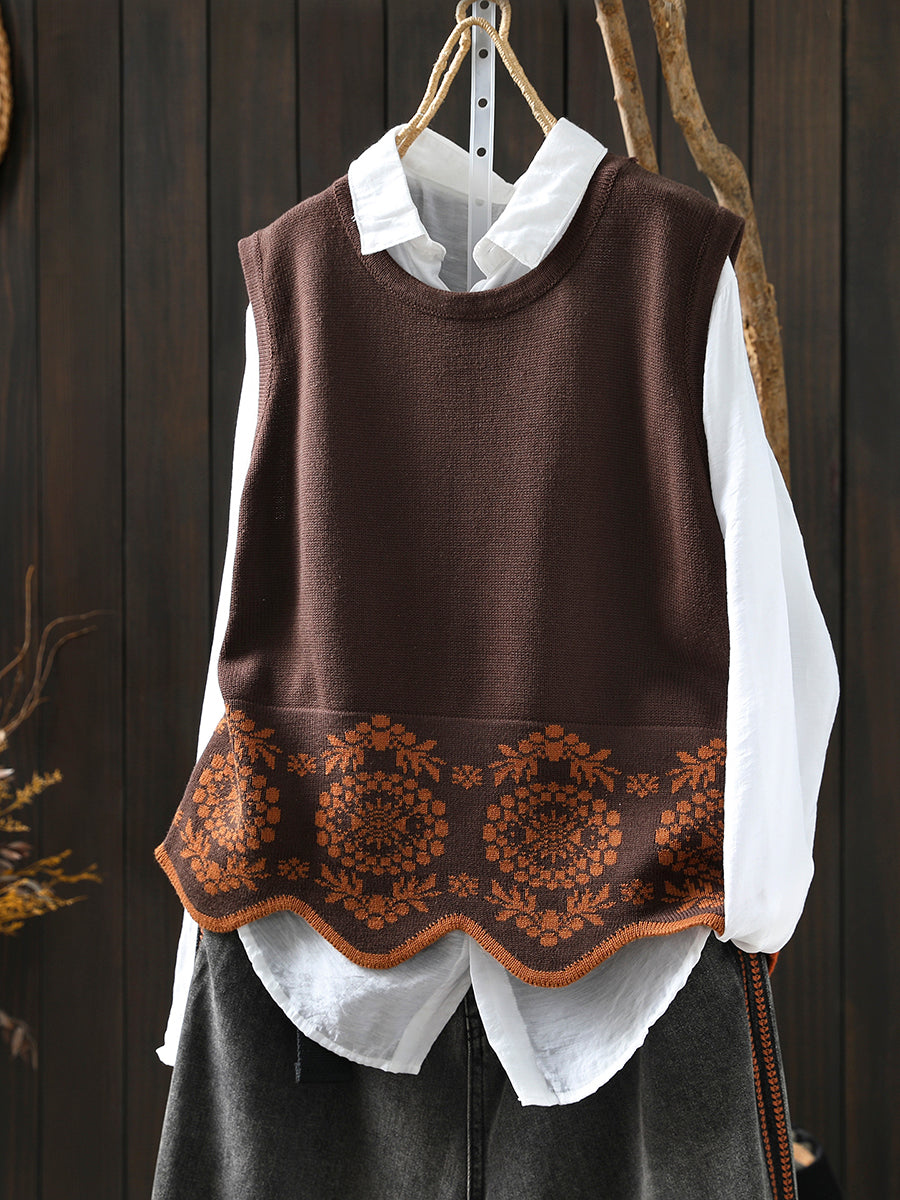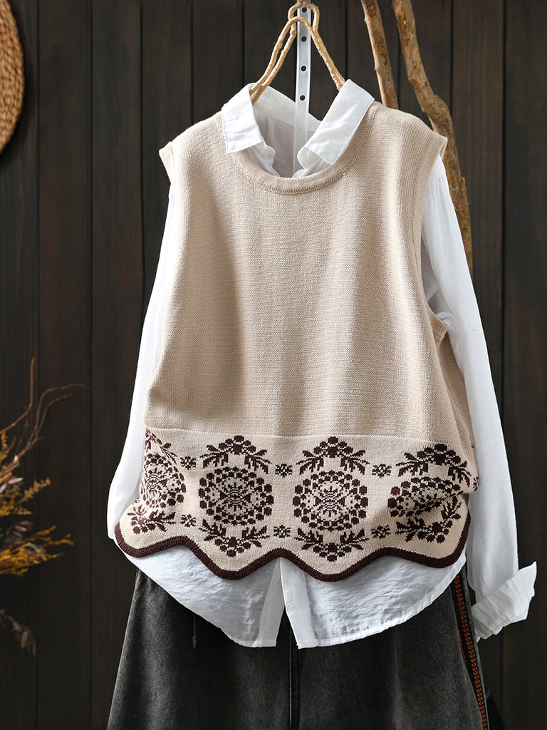 Chaleco de punto con cuello redondo y dobladillo ondulado con flores artísticas para mujer