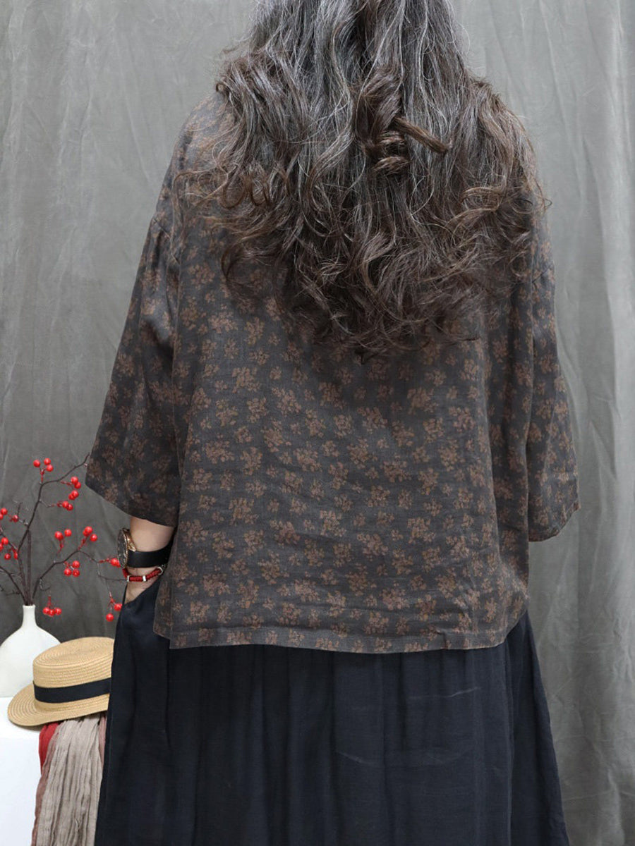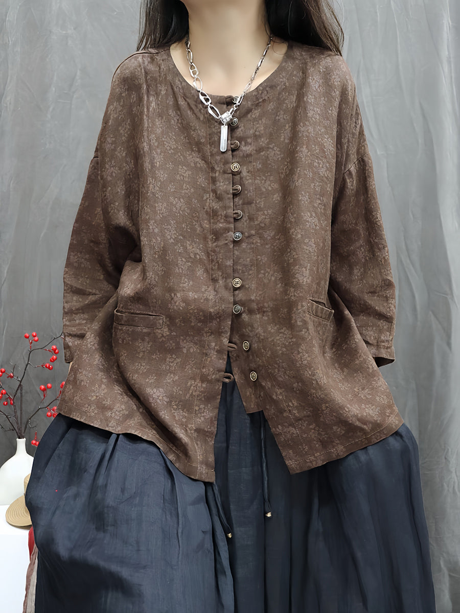 Camisa de cuello redondo 100 % lino con estampado floral de primavera para mujer