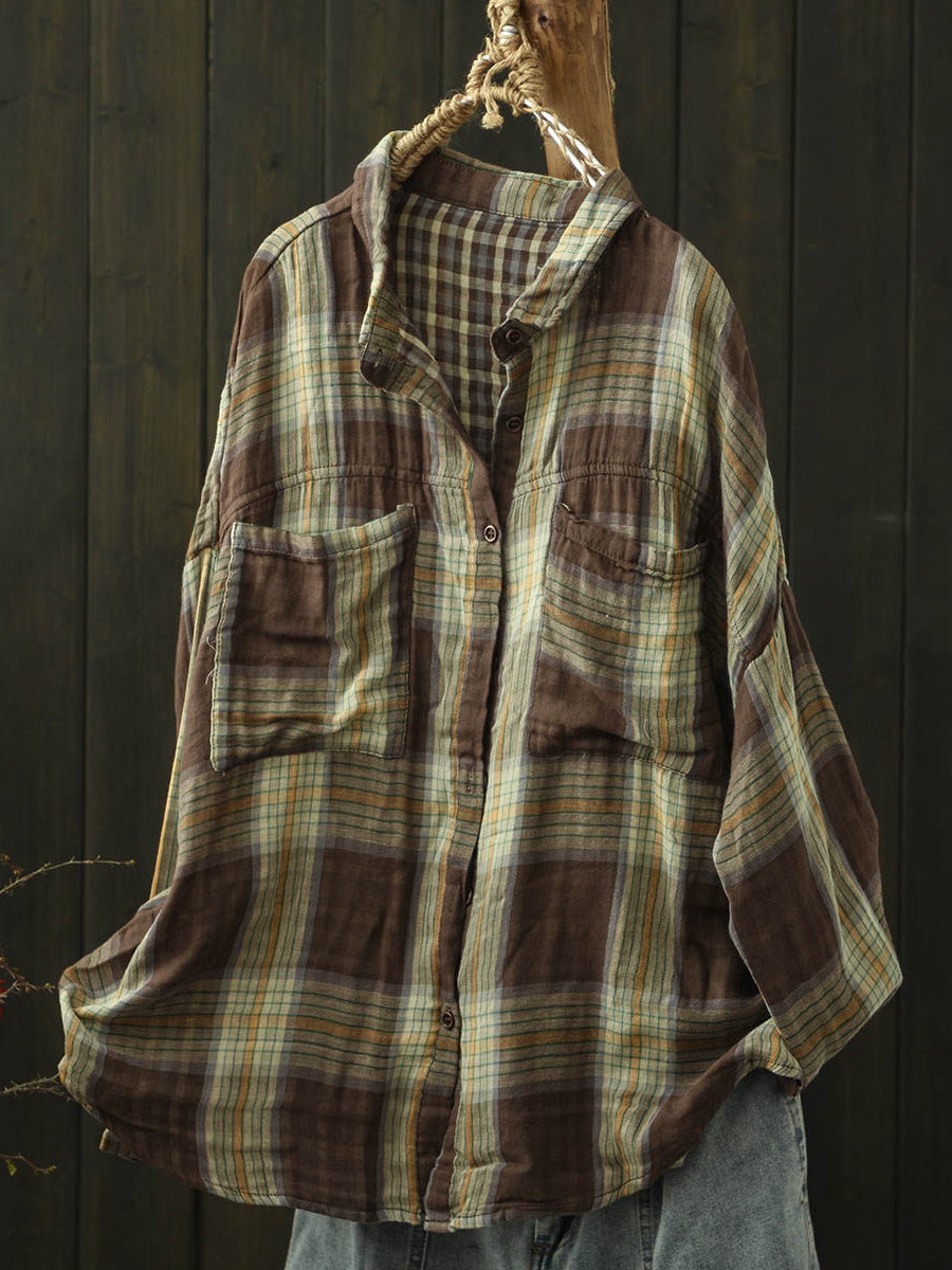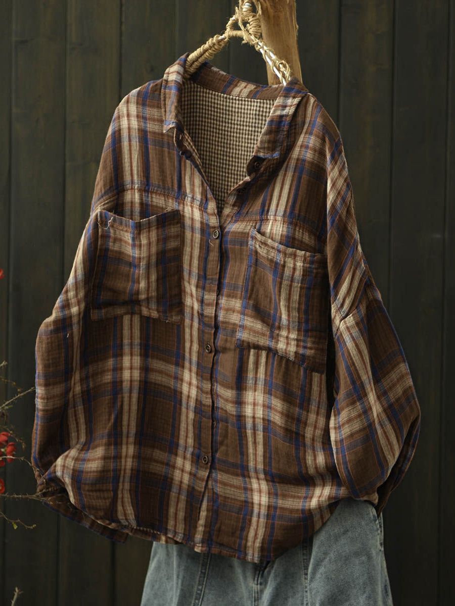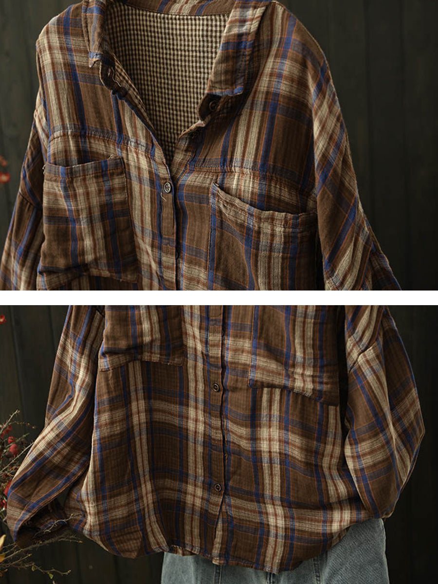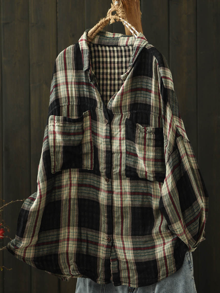 Camisa de algodón con cuello vuelto y cuadros escoceses de primavera para mujer