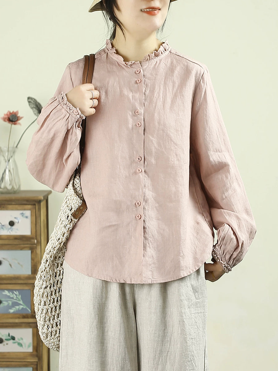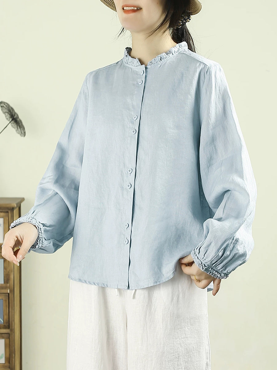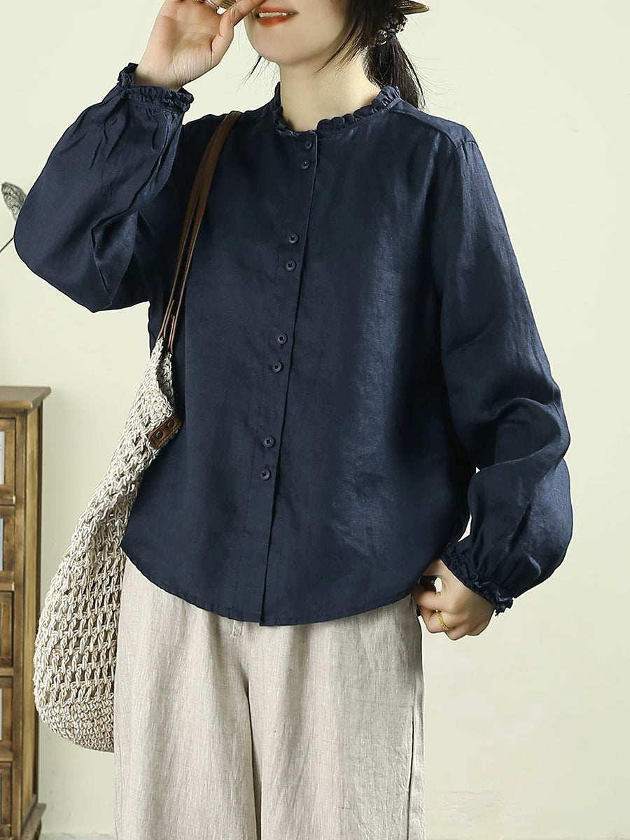 Camisa de lino 100 % con cuello alto, color puro y estilo artístico para mujer