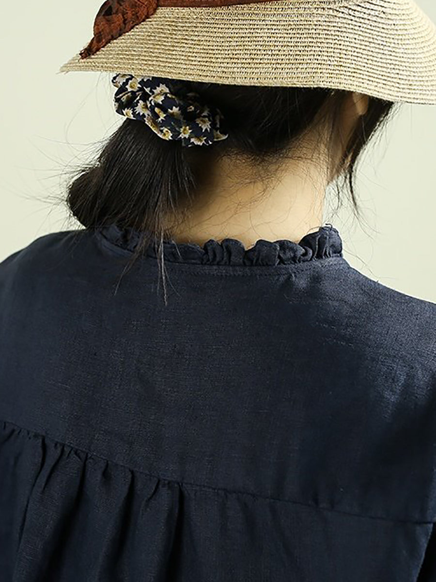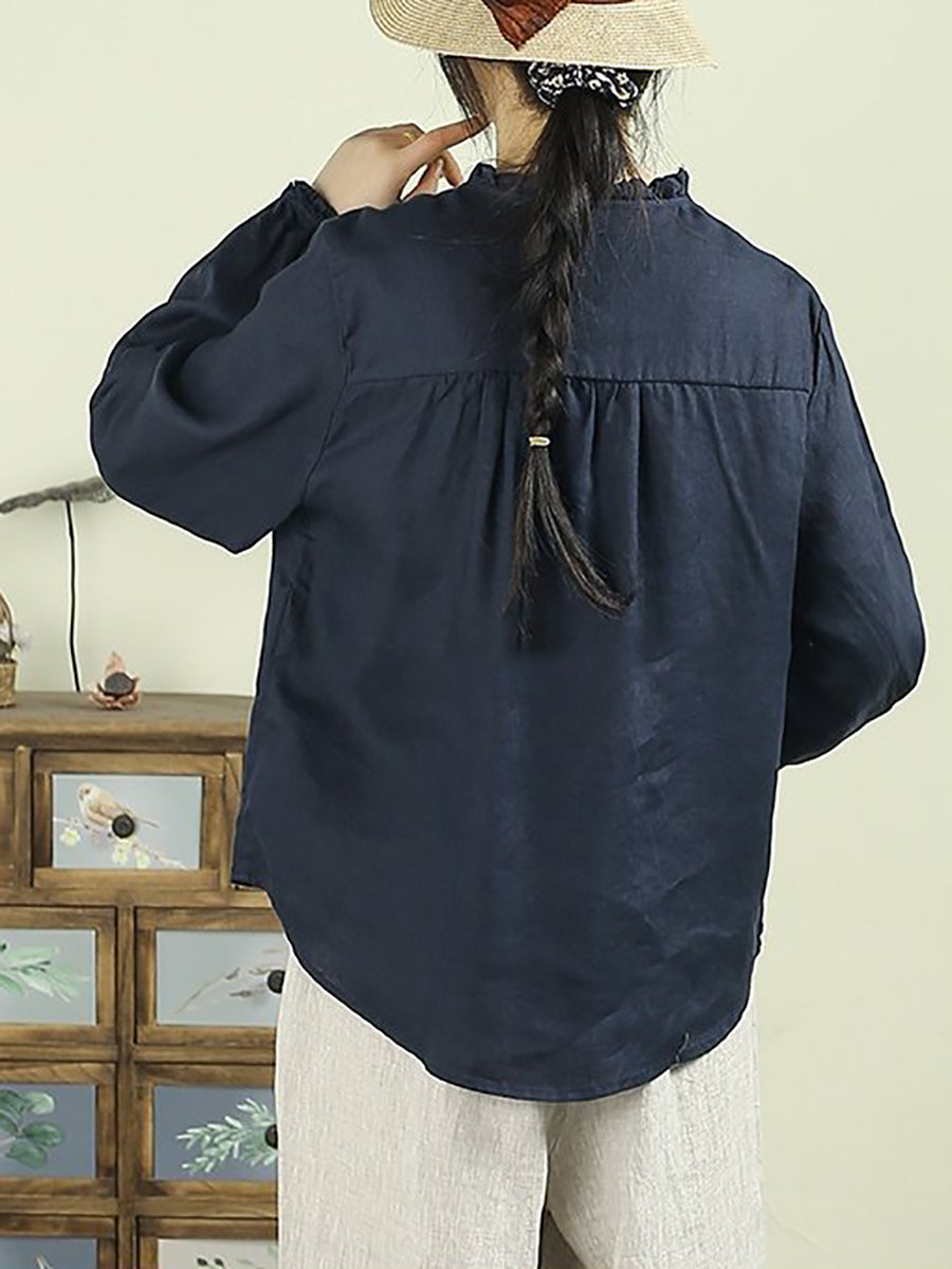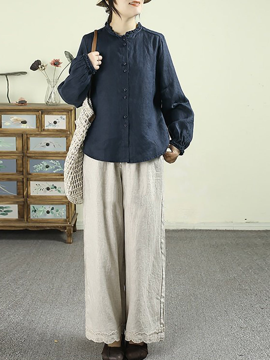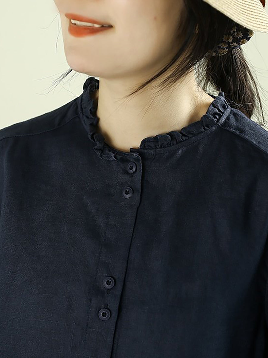 Camisa de lino 100 % con cuello alto, color puro y estilo artístico para mujer