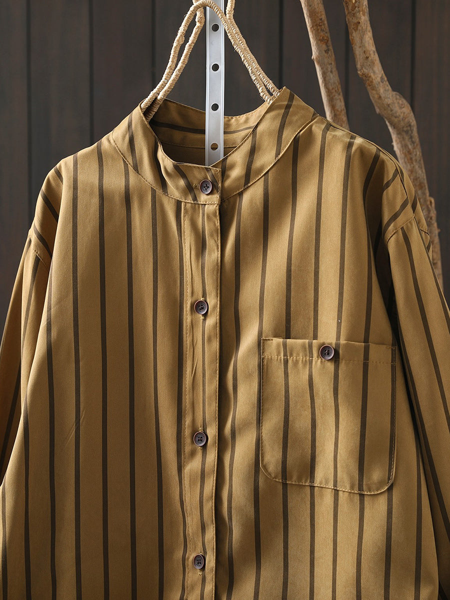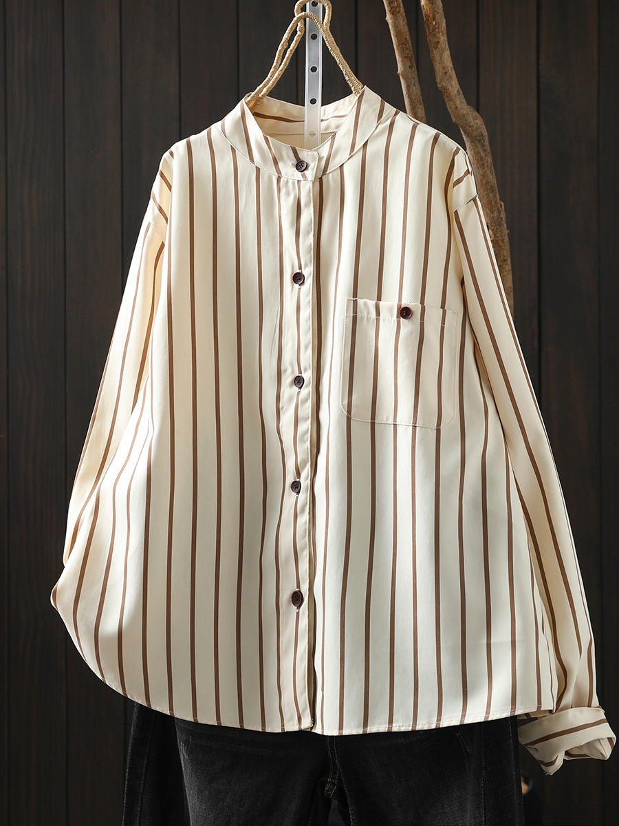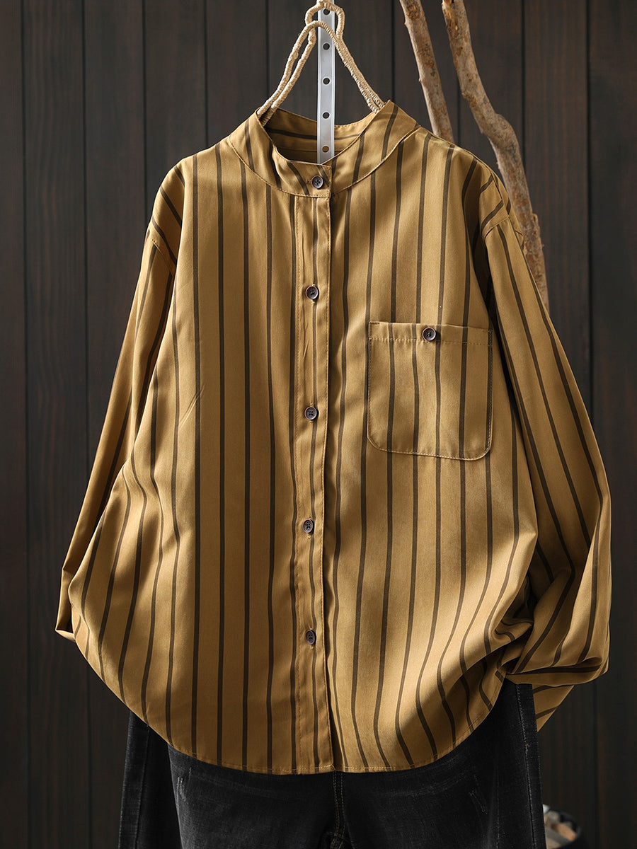 Camisa de algodón con cuello alto y rayas artísticas de primavera para mujer