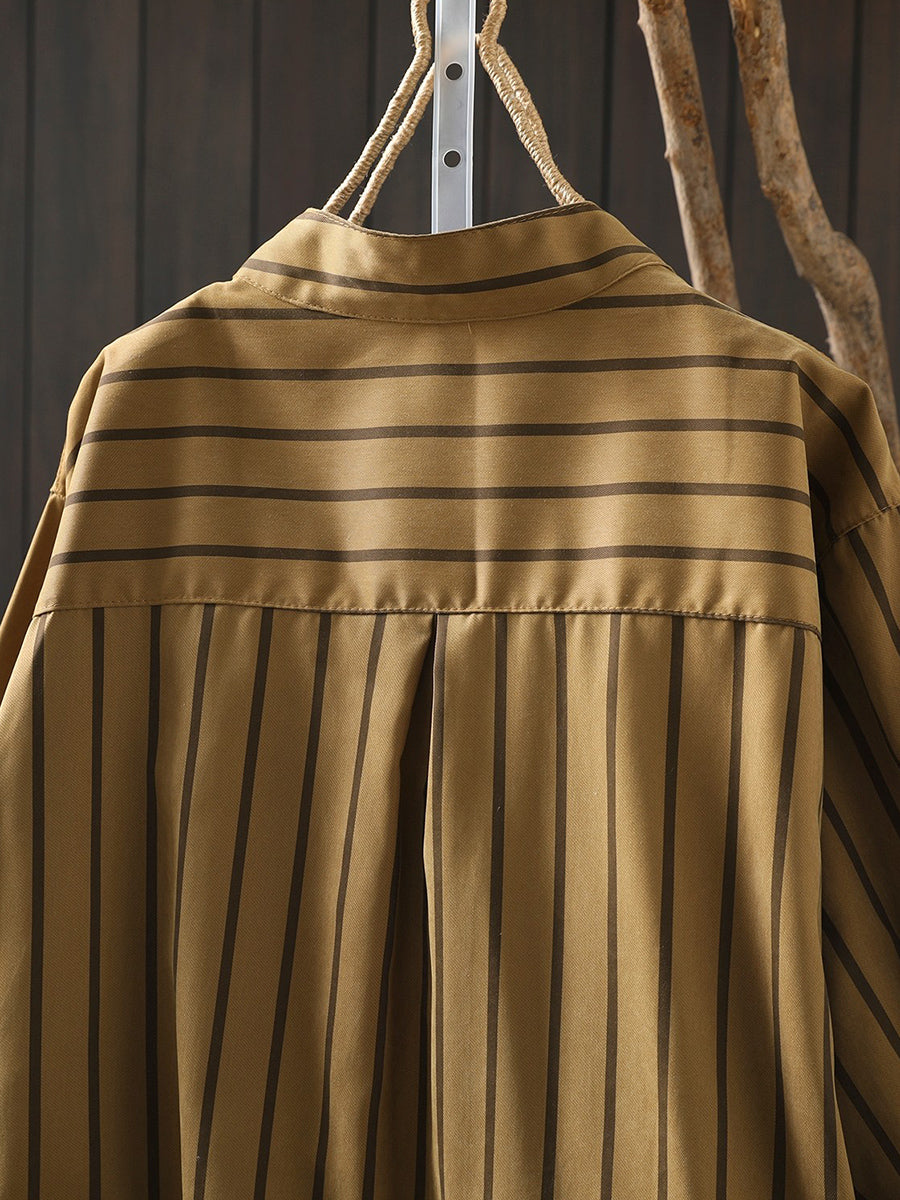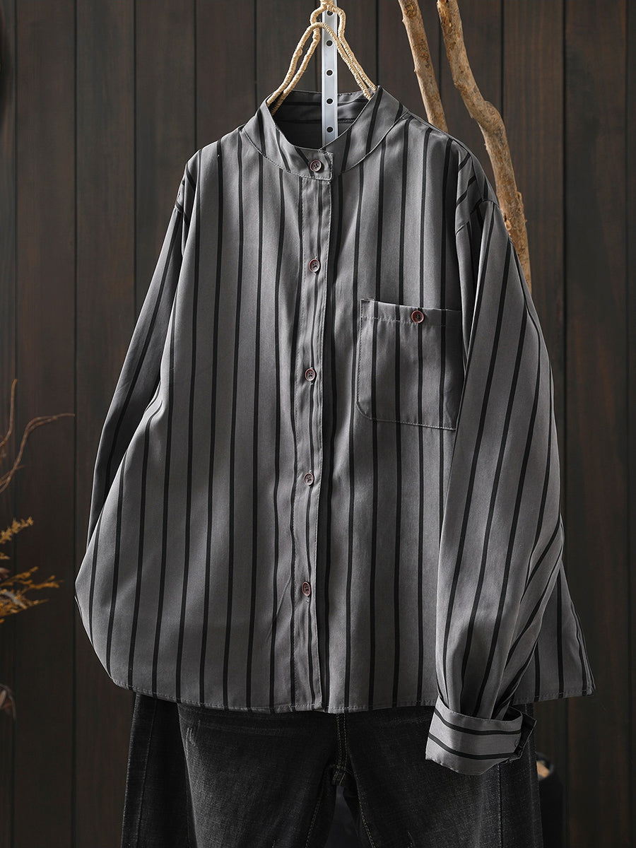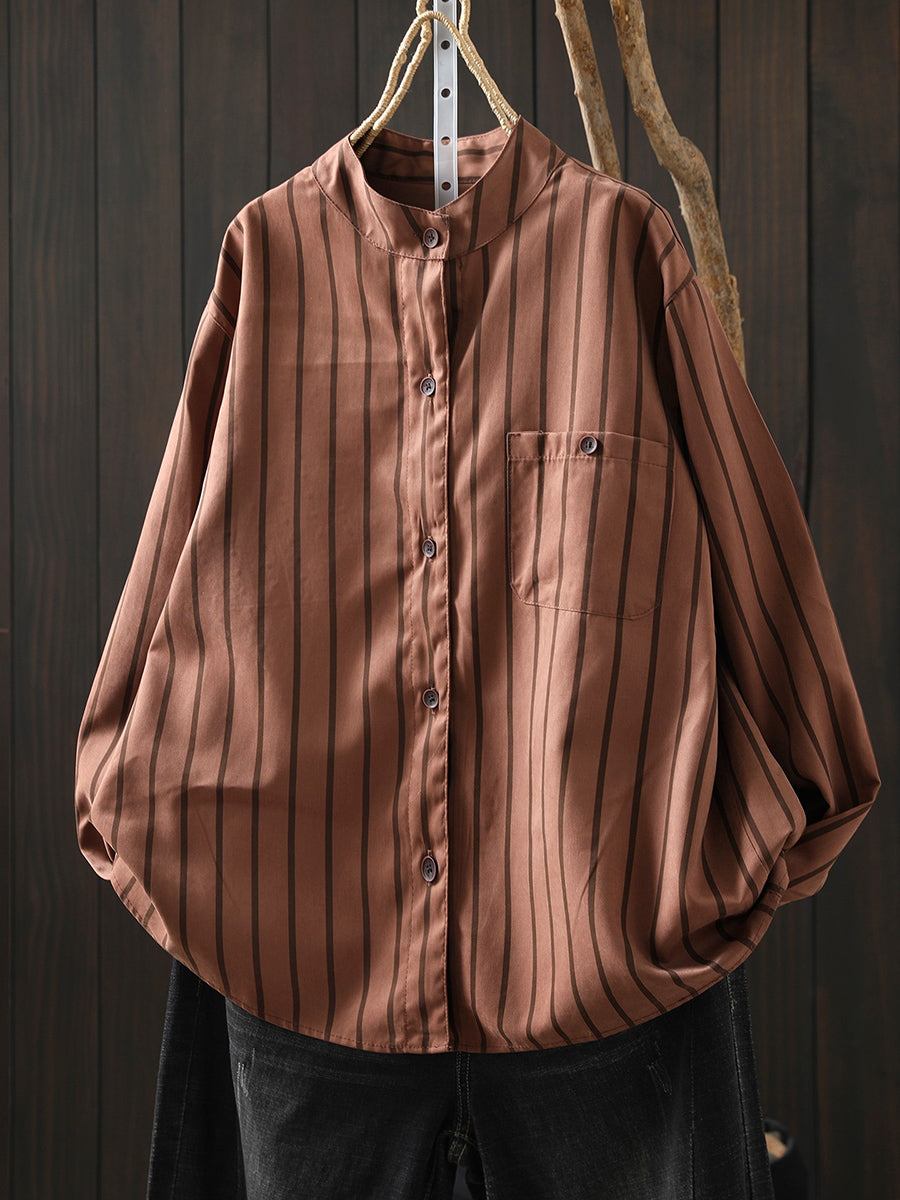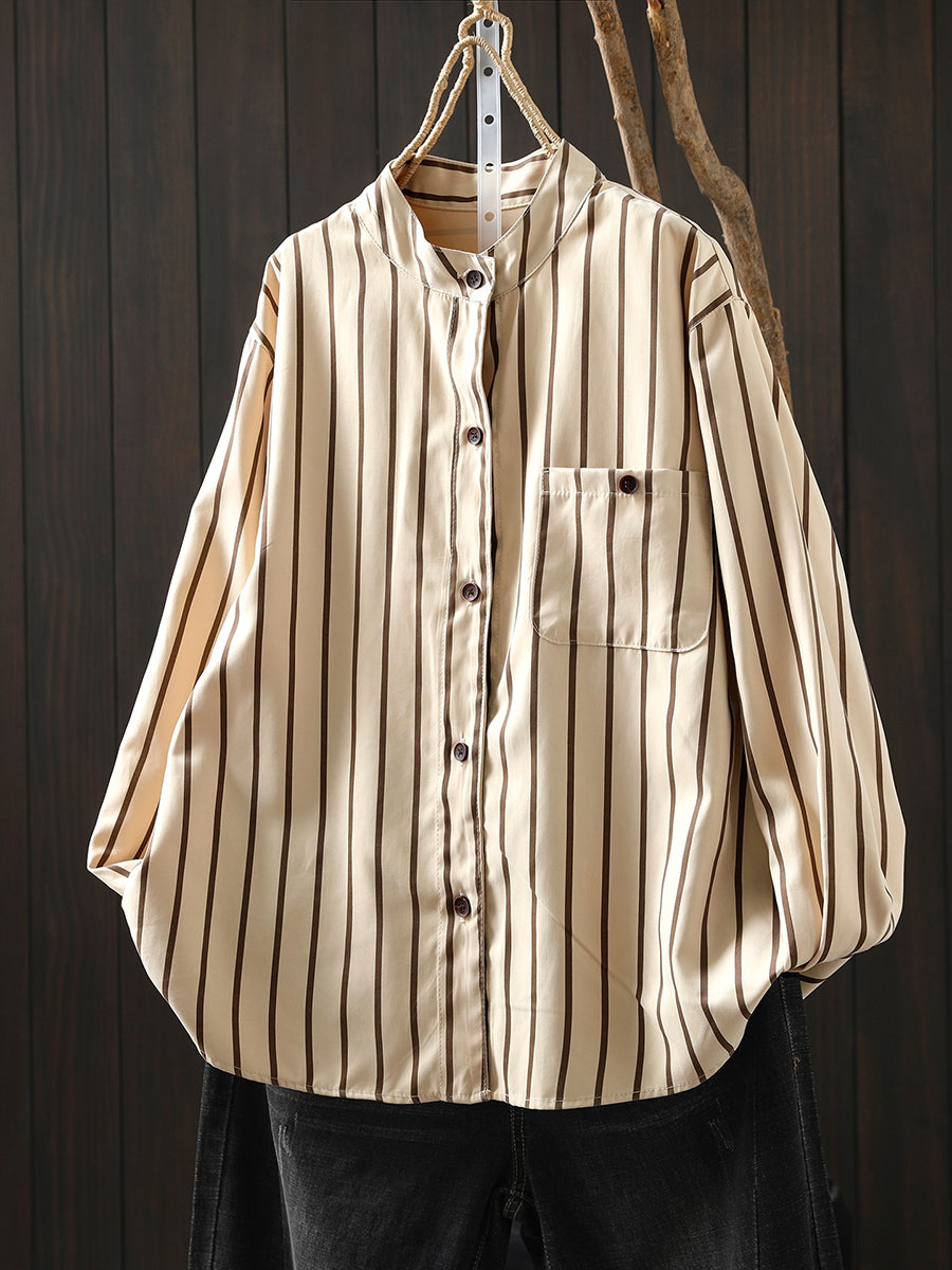 Camisa de algodón con cuello alto y rayas artísticas de primavera para mujer