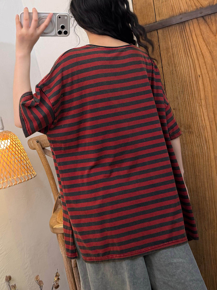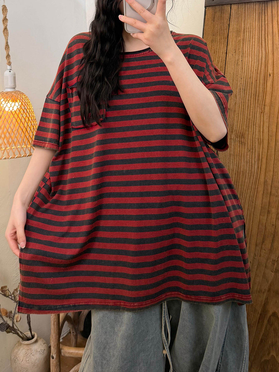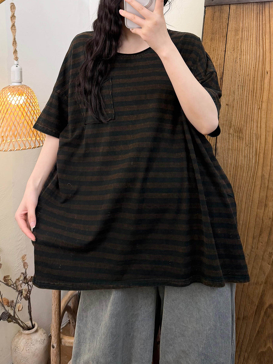 Camisa informal de verano con rayas y cuello redondo para mujer