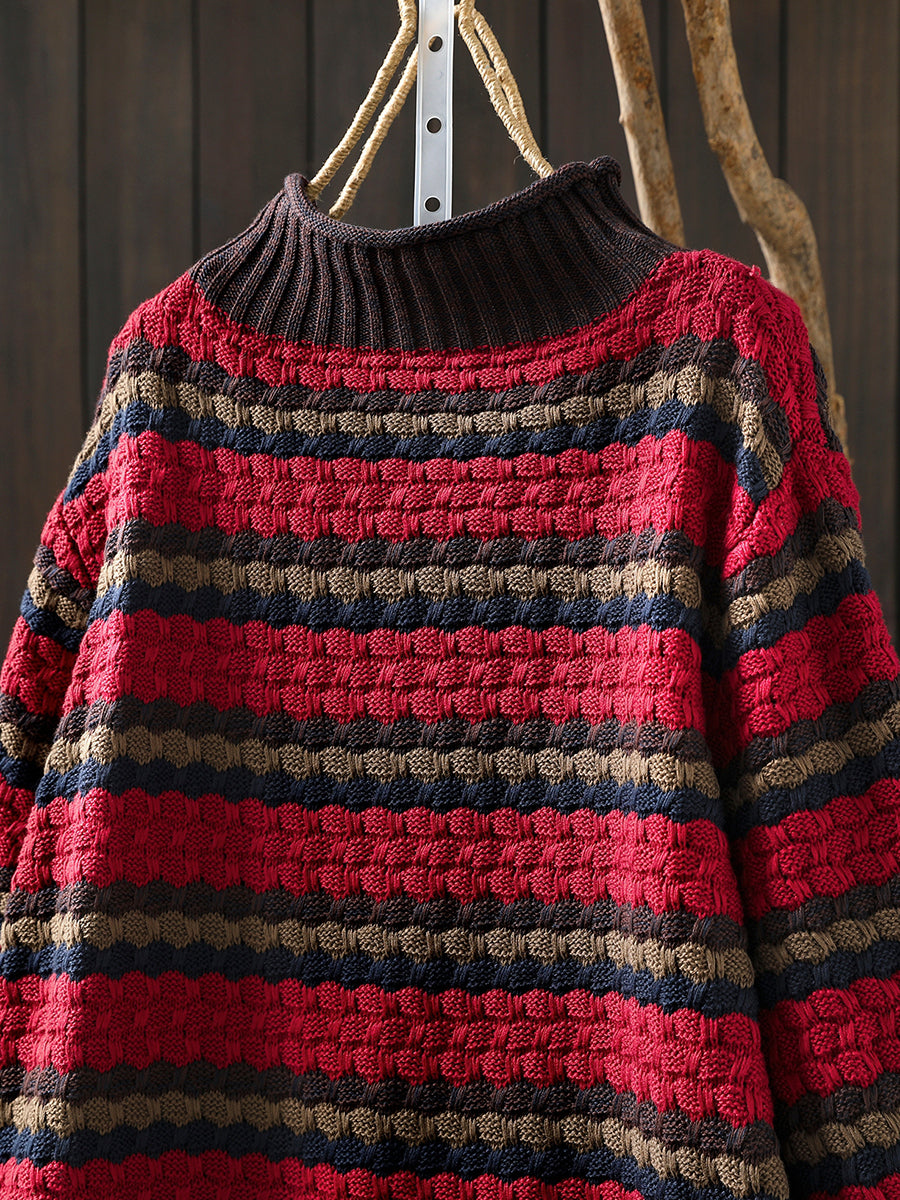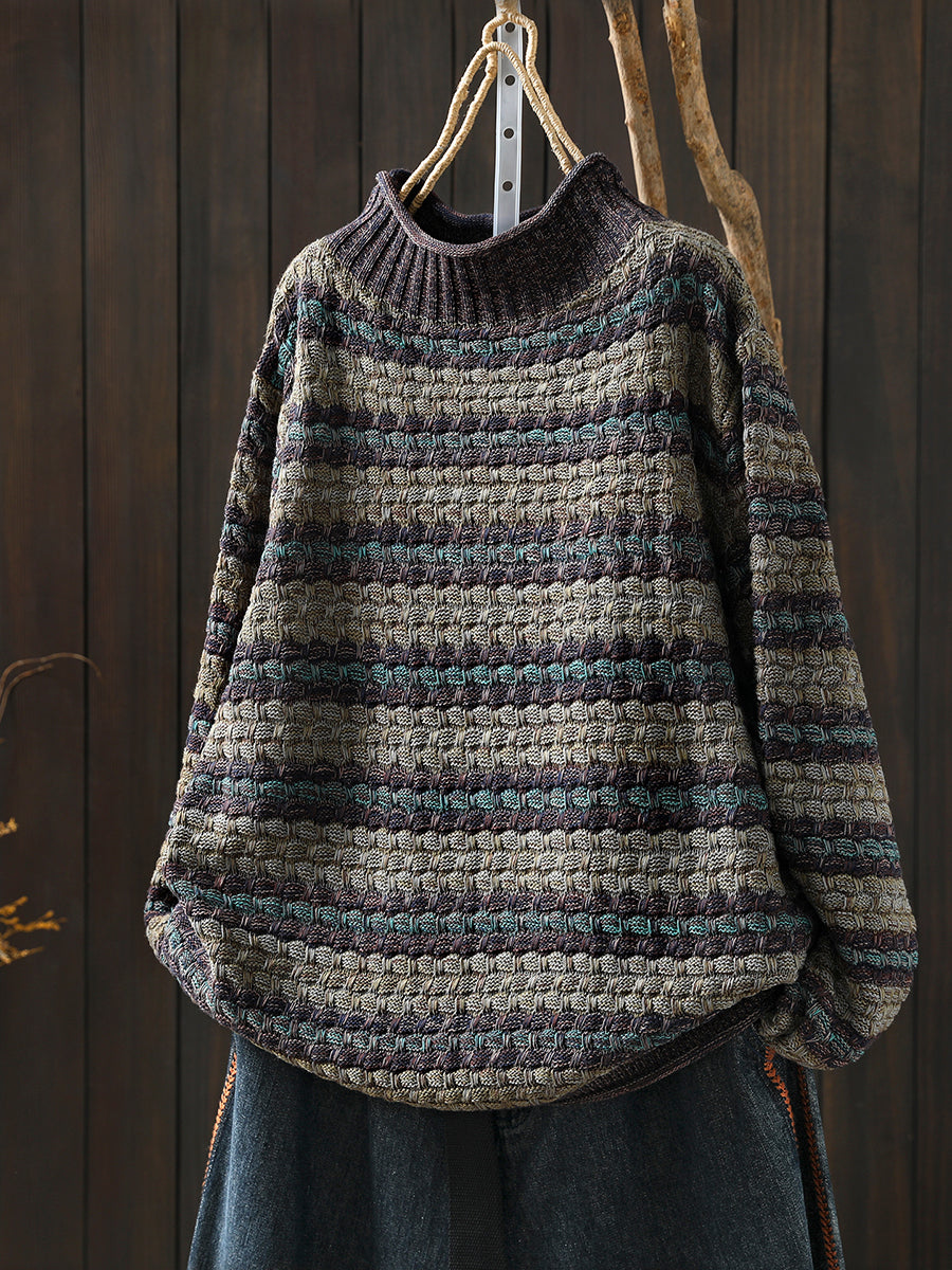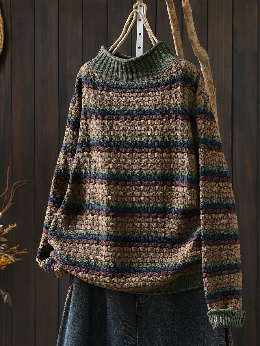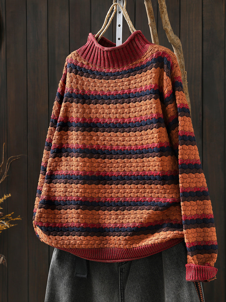 Suéter de cuello alto medio con rayas y bloques de color artístico de otoño para mujer